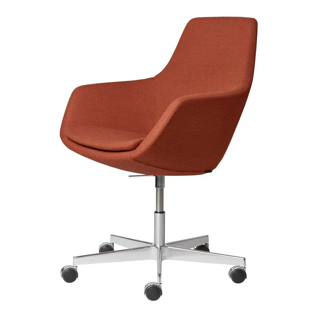 The Giraffe which earned its name because of its high backrest, dates back to 1959. Arne Jacobsen is the designer behind this beauty, and it was part of his total design of SAS Royal Hotel in Copenhagen. Jacobsen played around with the Giraffe and made different versions, and the one we know today is the Little Giraffe, characterized by a lower back and a four-legged base. The Little Giraffe caters for daily use in hotel lobbies, canteens or meeting rooms as well as working beautifully around any dining table at home. No matter the space surrounding the Little Giraffe, it tells a tale of original Arne Jacobsen design, of impeccable Fritz Hansen upholstery skills and of a sculpture that simultaneously embodies both aesthetics and comfort. Like Arne Jacobsen's many other pieces of furniture created with Fritz Hansen, the Little Giraffe is an example of genuine mid-century Danish design which is known for its timelessness, craftsmanship and adaptability to many different interior styles.
