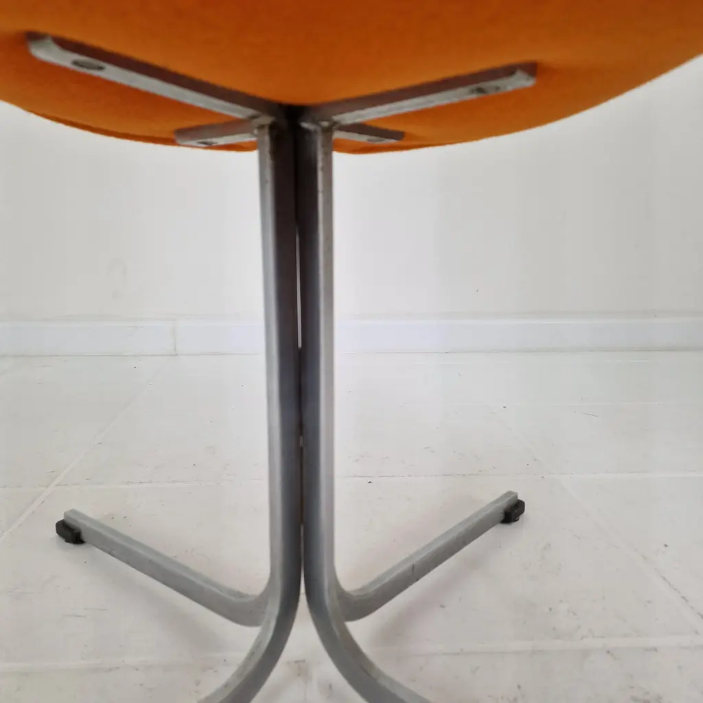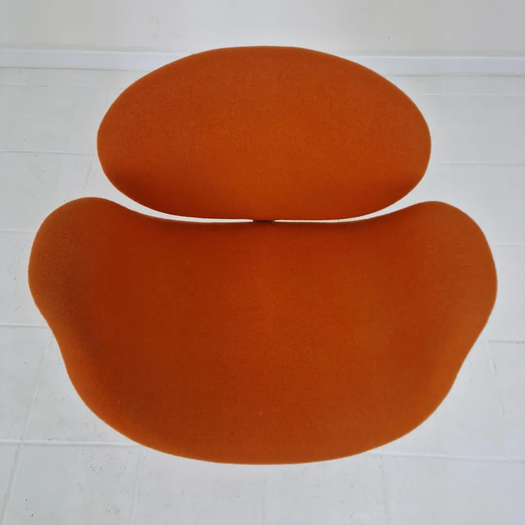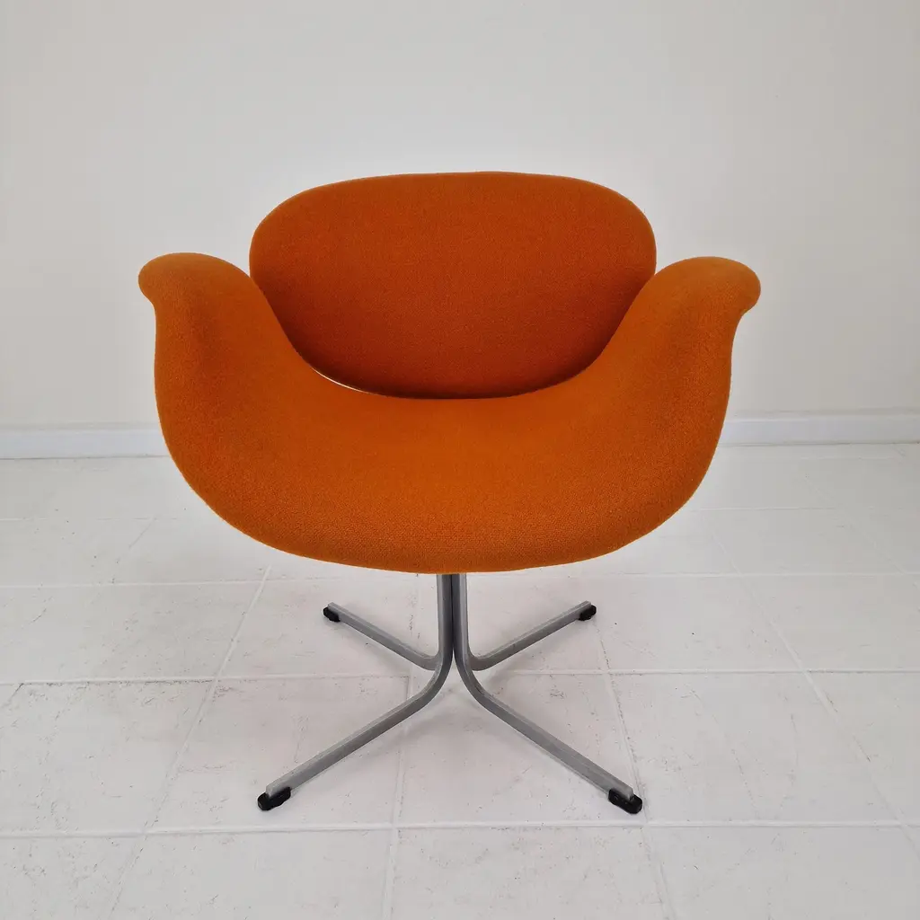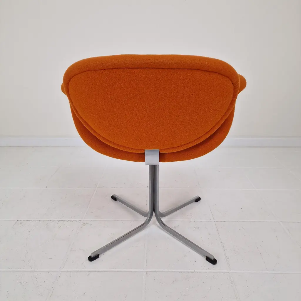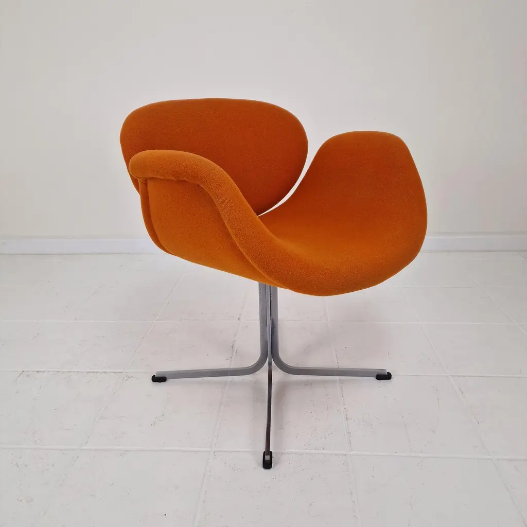 Cute and very comfortable armchair. This "Little Tulip" armchair with cross base is designed by the famous Pierre Paulin in the 60's. This early and rare edition is fabricated by Artifort around 1970. The chairs have the original used orange wool fabric, Kvadrat Tonus. The chairs are in very good condition with the normal traces of use (see the pictures). This piece is attributed to the mentioned designer/maker. It has no attribution mark and no official proof of authenticity, however it is well documented in design history. I take full responsibility for any authenticity issues arising from misattribution