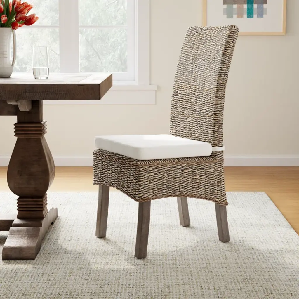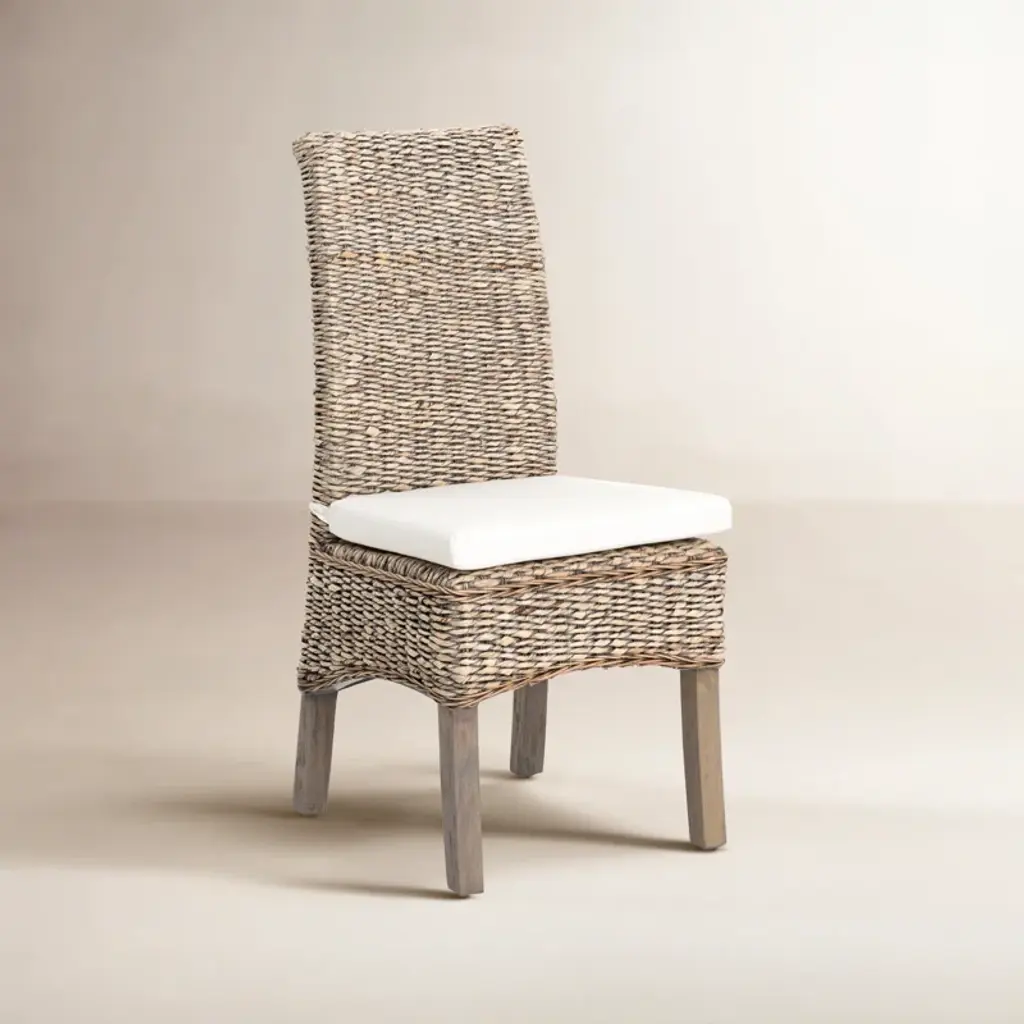 This collection combines fitted lines with elegant texture, perfect for bringing the outdoors in. This comfortable dining chair is made from all-natural banana leaf, mahogany wood.