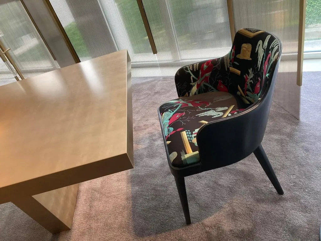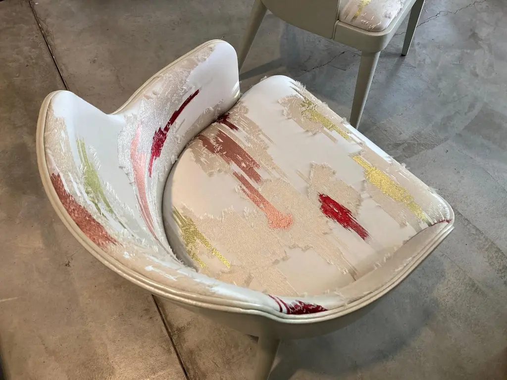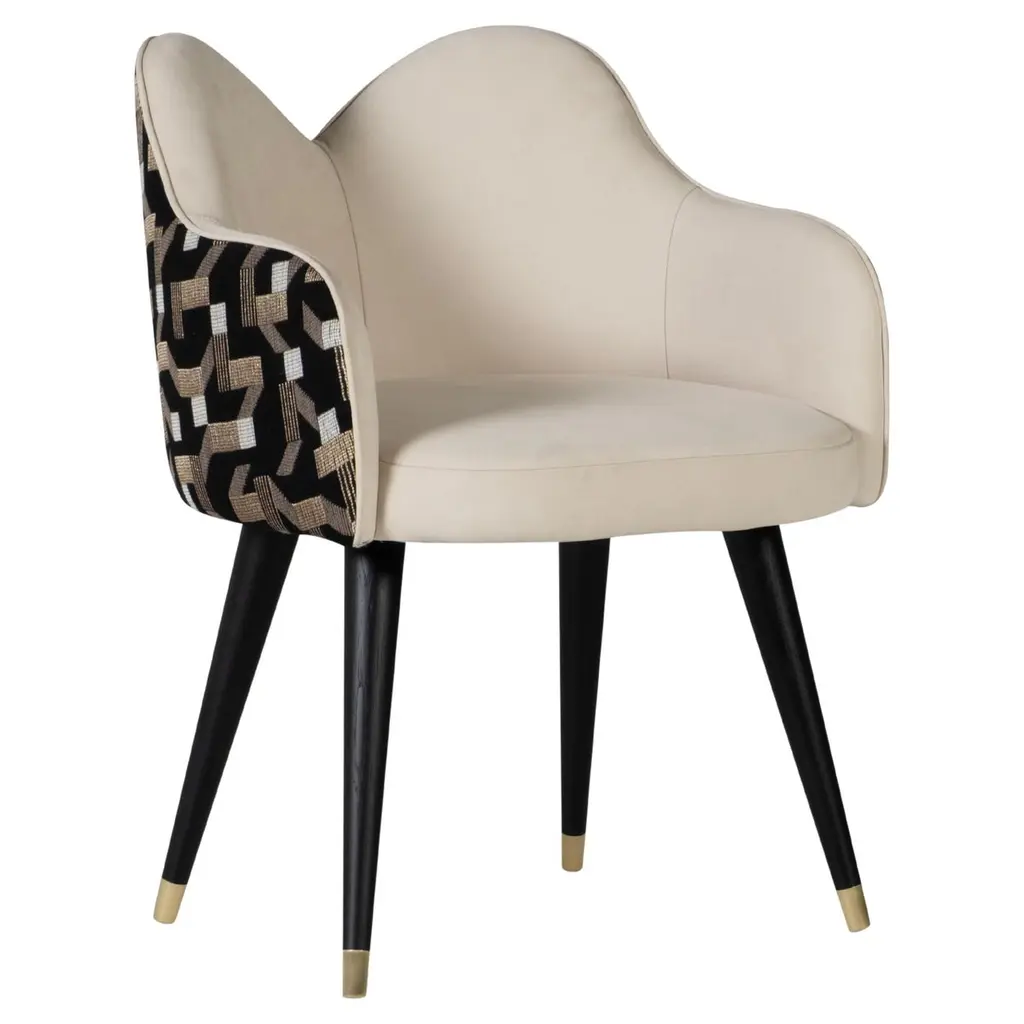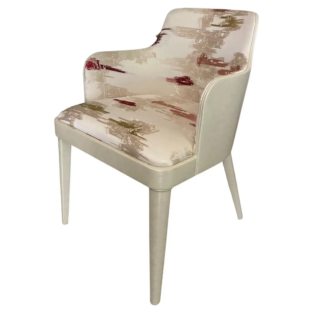 A classic piece of European design revised in its proportions and finishes. The refined piping detail used to cover the joints in the leather becomes one of the characteristics of the chair. On the occasion of the Milan Design Week 2023 Casa Casati presented the Lola Royale: seat and backrest are covered with a targeted selection of fine fabrics. Upholstered in ivory-colored leather, the seat and backrest are embellished with an abstract and textural jacquard fabric. The golden flashes are captured through the use of the fil coupé technique, which gives the piece an almost "unfinished" effect.The upholstered armchair is a classic and always up-to-date piece, which could not be missing from the Casa Casati catalogue. The Lola chair, however, has been revisited in the proportions and finishes to become more comfortable and more fashionable. The four slender legs support a seat of generous proportions: fifty centimeters wide. The ergonomic and enveloping backrest supports your back and at the same time gives you maximum comfort. Designed to be used around a dining table, Lola is a armchair on which even the longest dinners can be enjoyed. These are the dimensions of the Lola: 60x50xh81 cm / 24x20xh32 in.