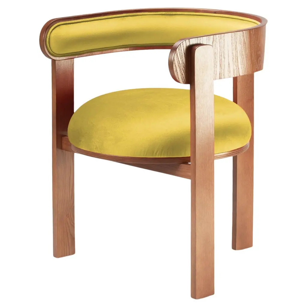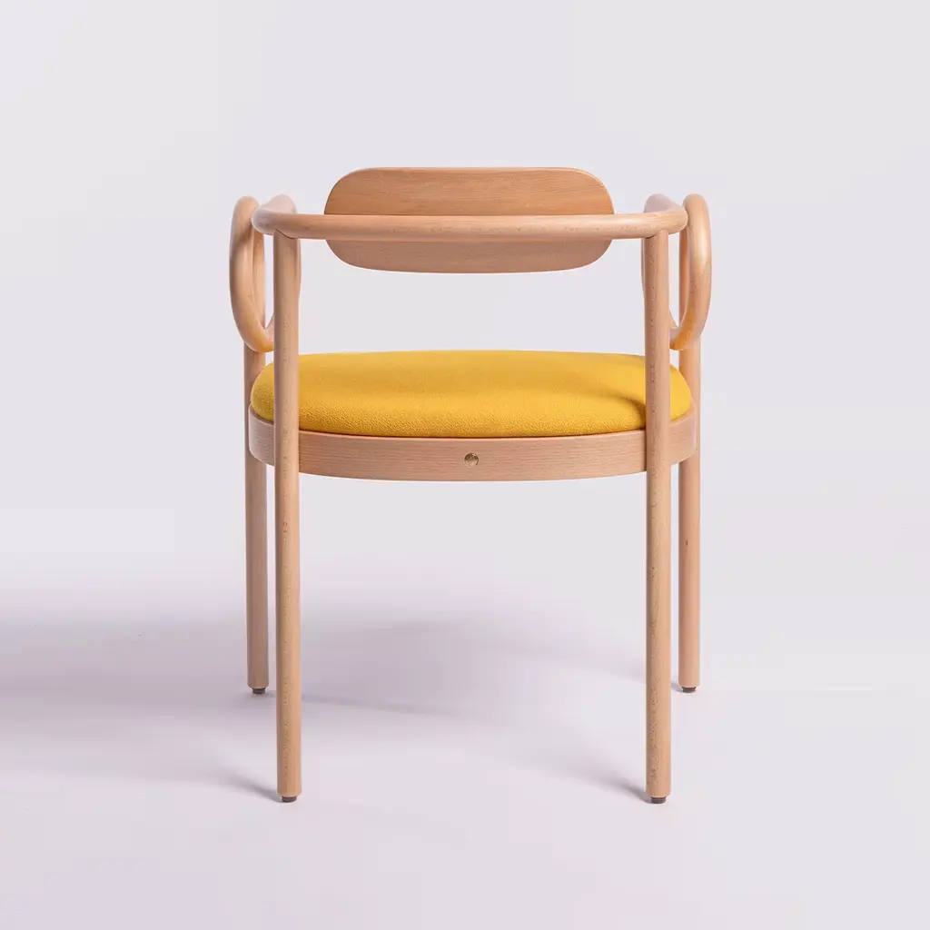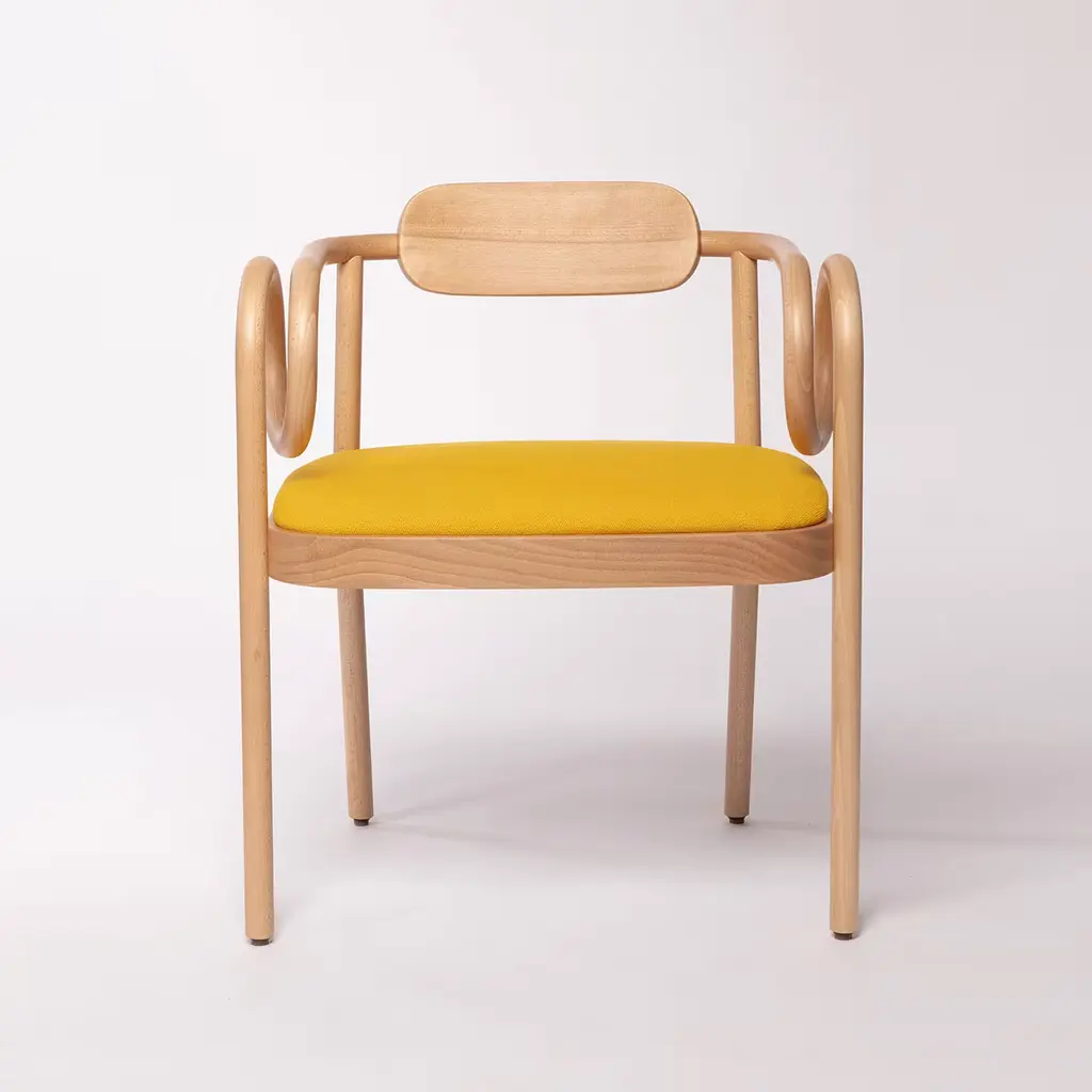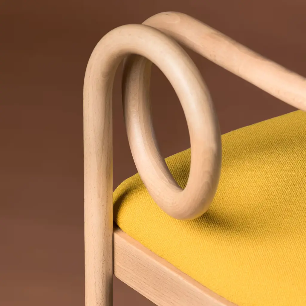 This continuous thread, which acts as the Loop’s structure, coils itself up to form the chair’s articulation, leaving two loops bent in its wake. The seductive curls that characterize the Loop push the boundaries of possibility – India Mahdavi demands of the bent beech wood to double its efforts in order to amplify its beauty and roundness. In the new Loop dining chair, the seat upholstered in yellow wool harmoniously matches to the natural essence of the wooden structure.