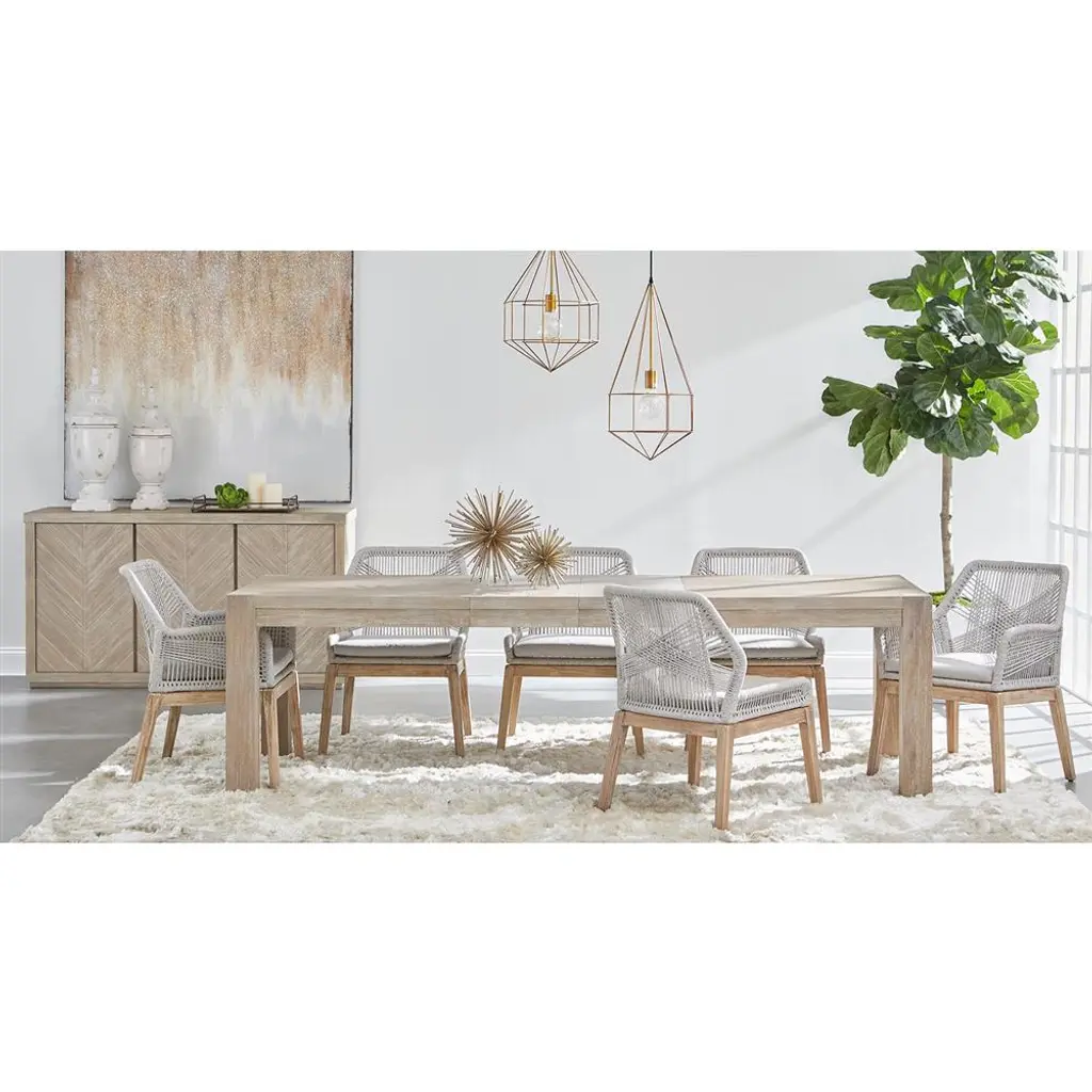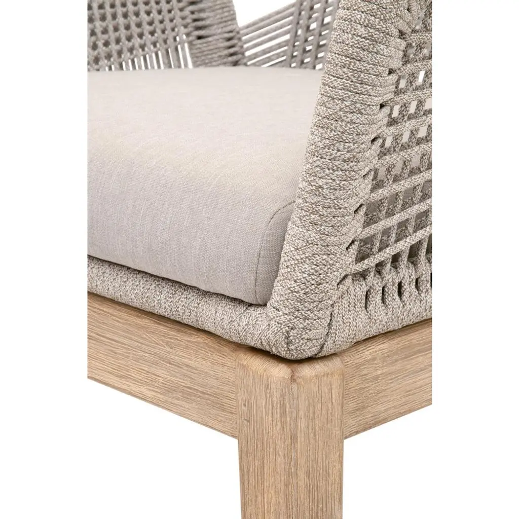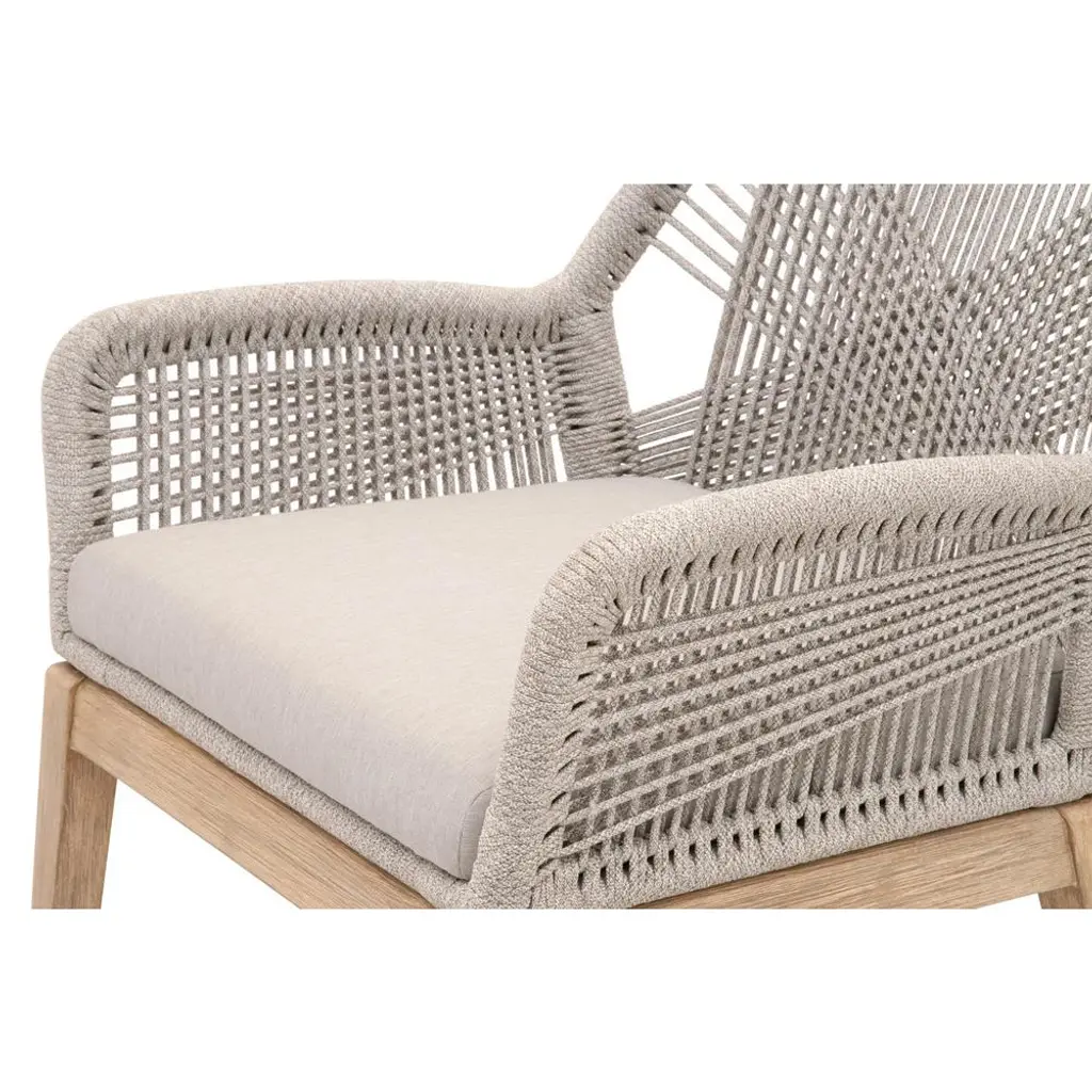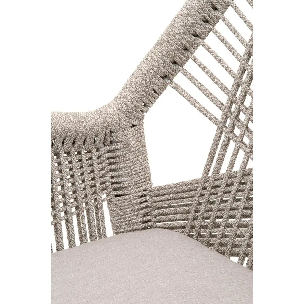 Complete the look of your coastal beach dining room designer with our Lorry Coastal Taupe Woven Rope Performance Gray Mahogany Dining Arm Chairs. These bestselling designer dining chairs expertly made from solid mahogany wood, aluminum, polyolefin rope, and foam. These coastal chic chairs also feature an intricate rope weave design with a reinforced dual aluminum frame and solid mahogany legs.
