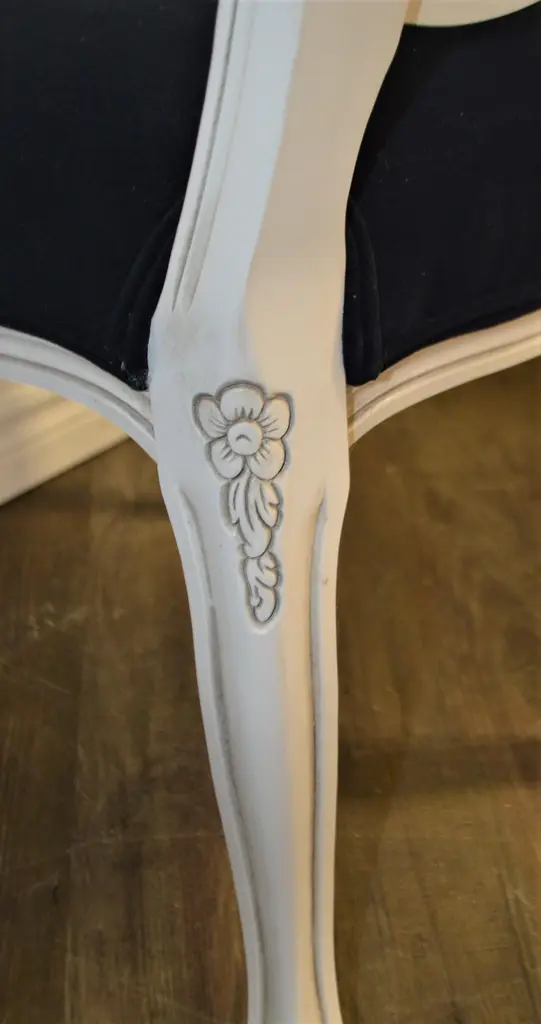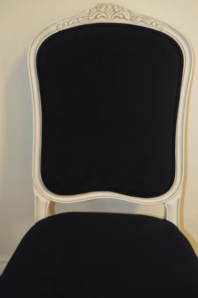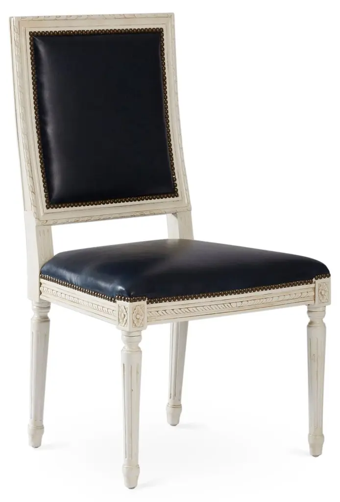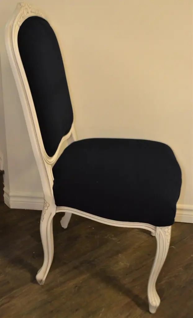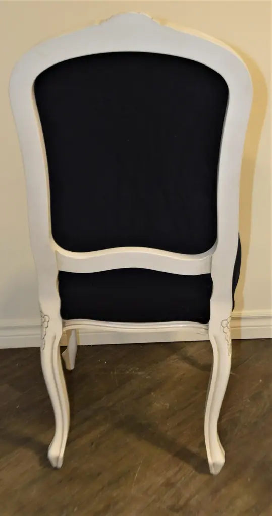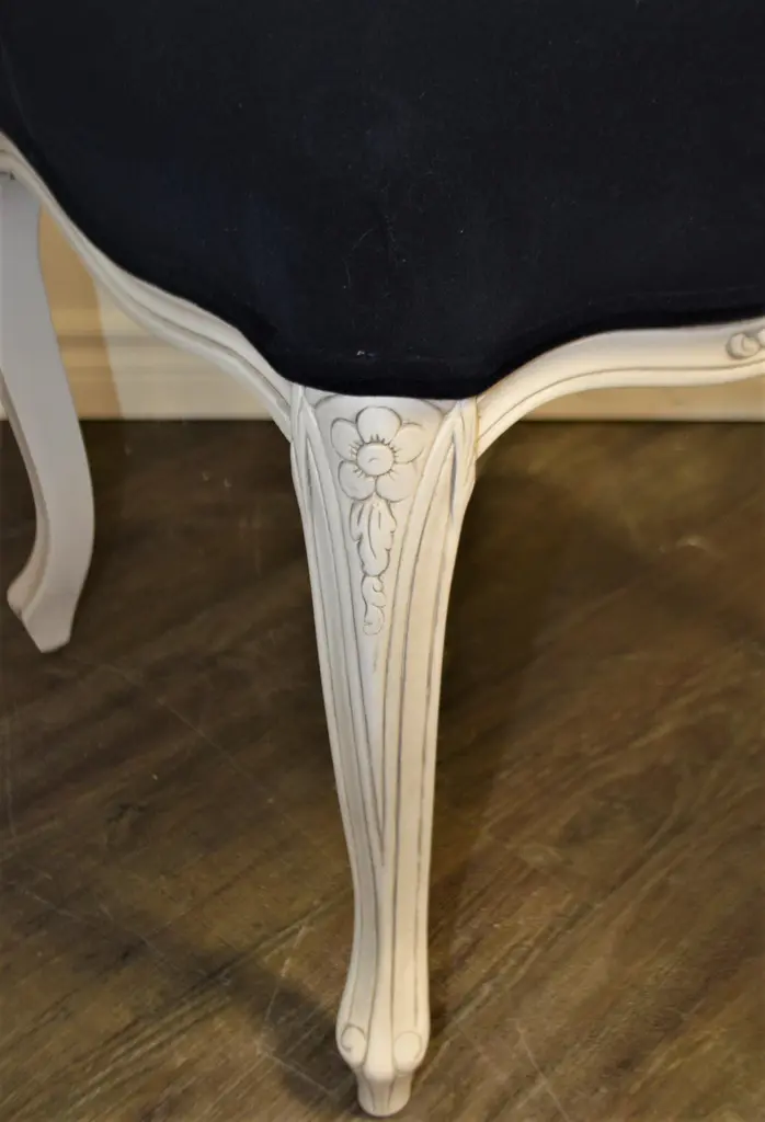 This dining chair is generous in size, it also has some charming carved elements at the top of the frame as well as the legs. It is showing here with a slightly distressed white paint finish and upholstered with a washable velvet in navy. This chairs is offered as a custom finish chair and upholstered with your fabric.