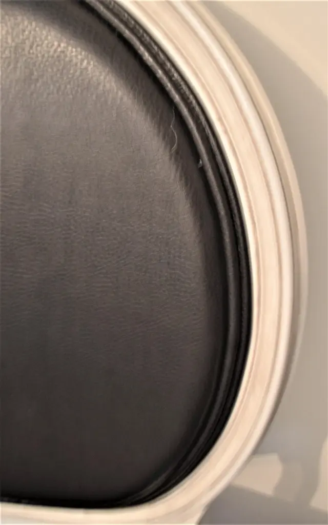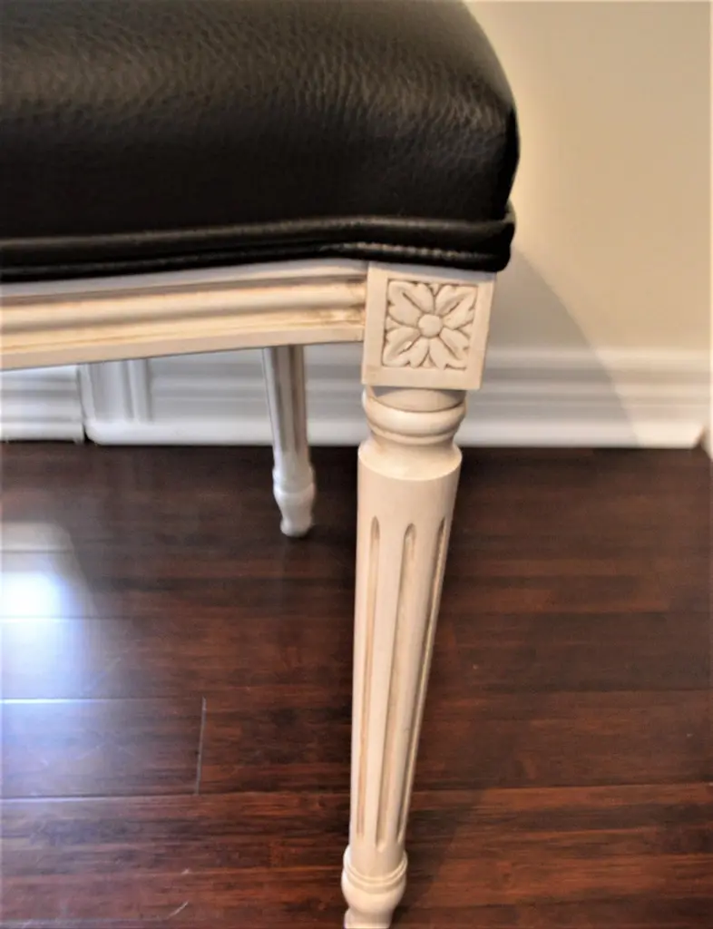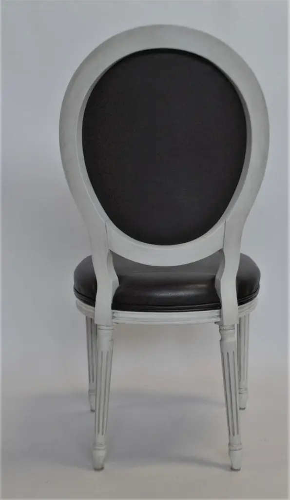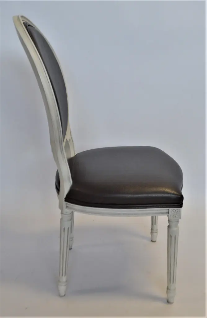 This Louis XVI style oval back dining chair is showing here in a white patinated frame and upholstered in a black faux leather. The frame is made in Italy of solid beech wood. The price includes a custom paint finish or wood stain and upholstery with your fabric and finished with a double pipping as showing.We can quote for other finishing options.