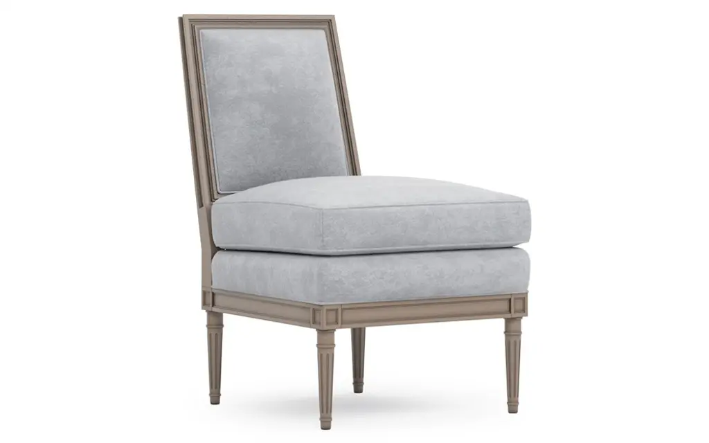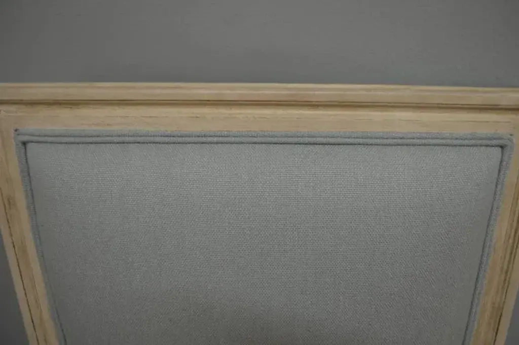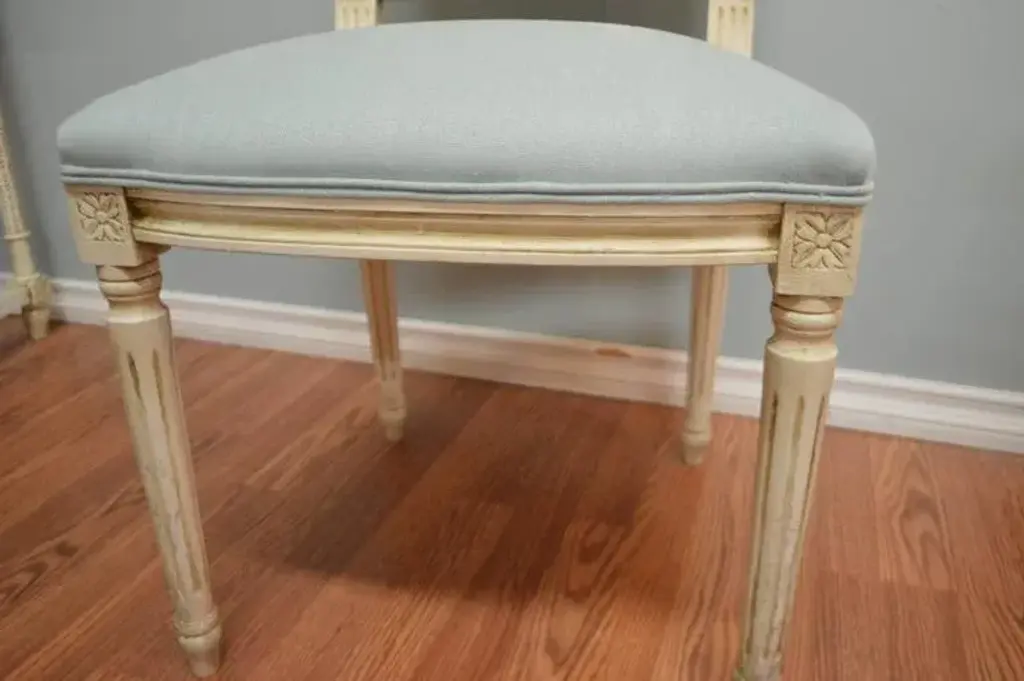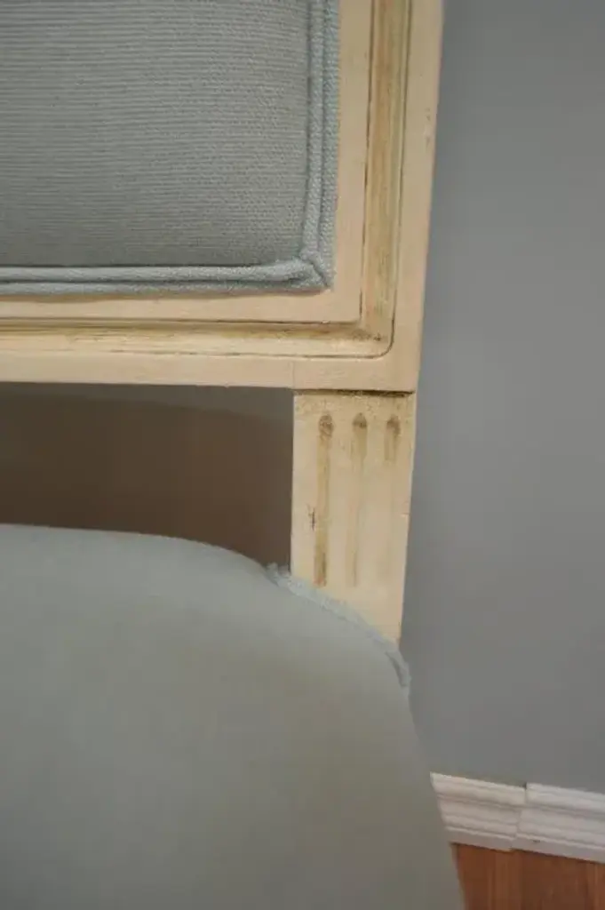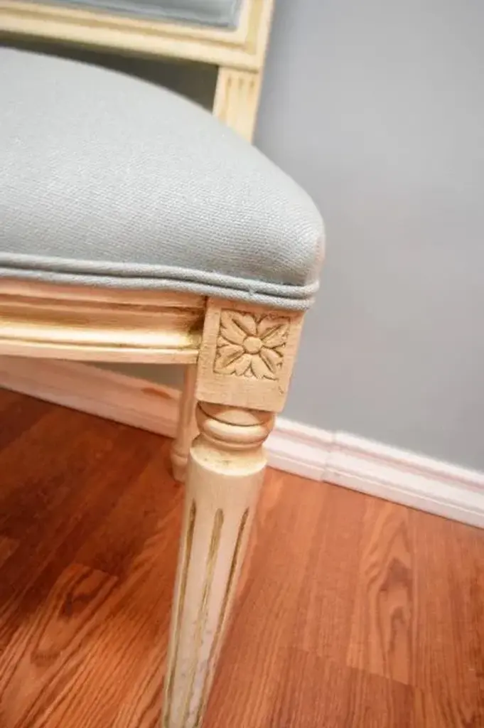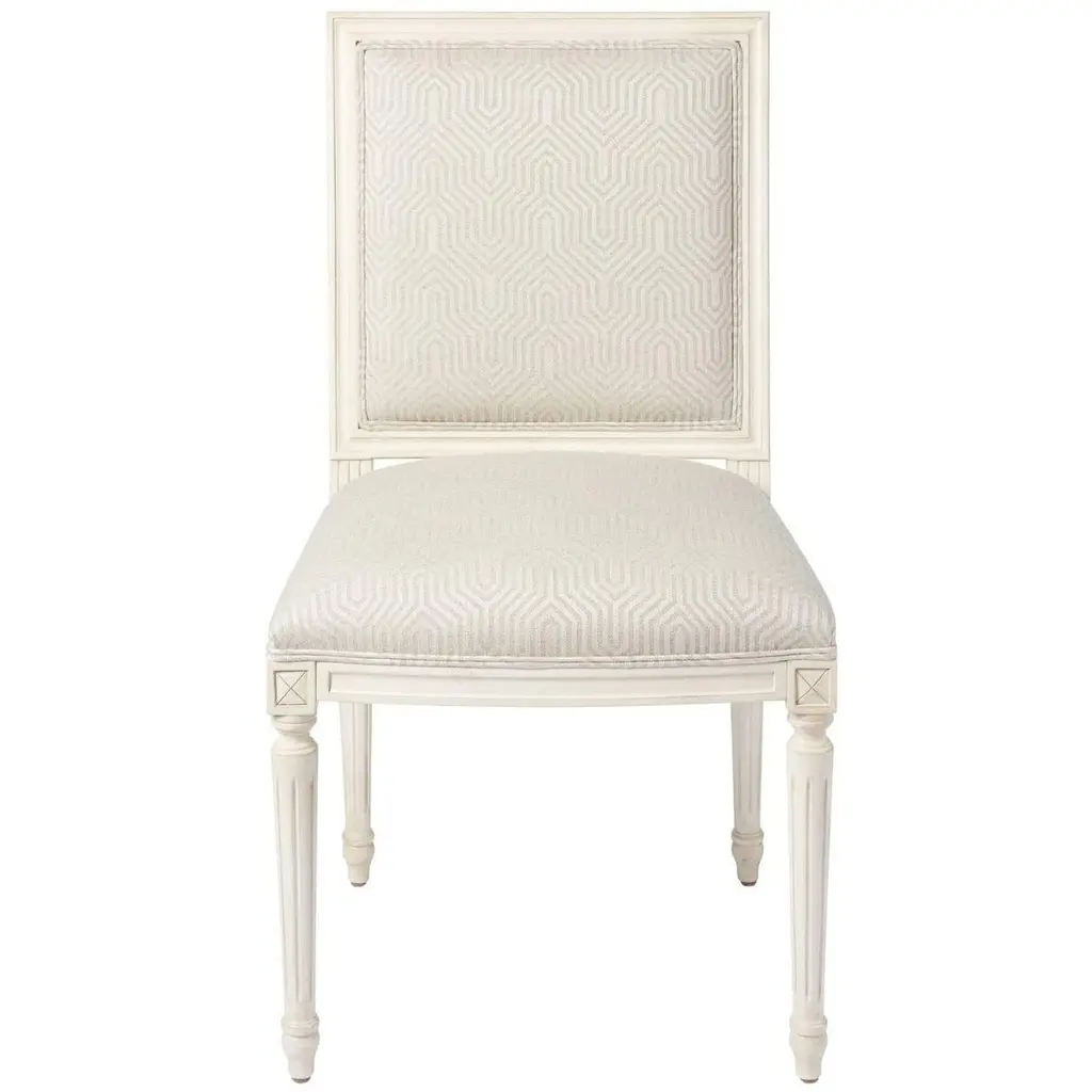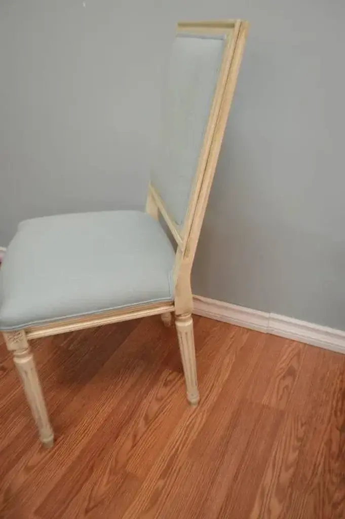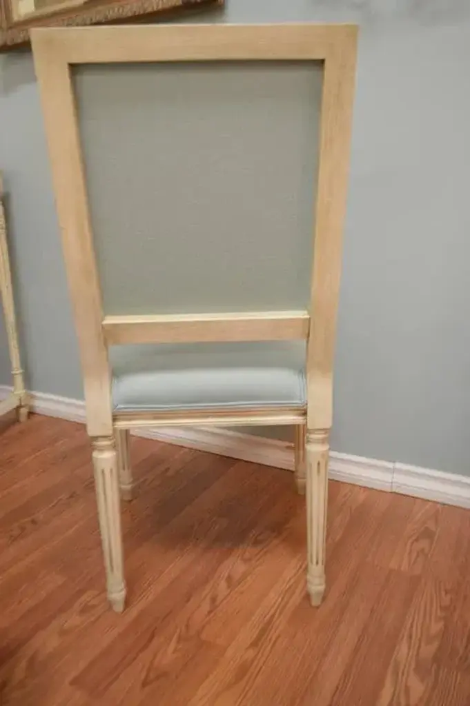 New Louis XVI style dining chair with a square back is made in Italy of beech wood. Shown in an painted antique finish and upholstered in a Belgium linen and finish with a tight seat and double pipping. Nail heads placed side by side are available for $85.00 per chair and nail heads placed by a distance of 1 1/2" are $65.00 per chair. Since the chairs are made in Italy, ther is a tariff charge of 15% on the cost of the chairs when entering the USA. We can discuss some cost sharing.