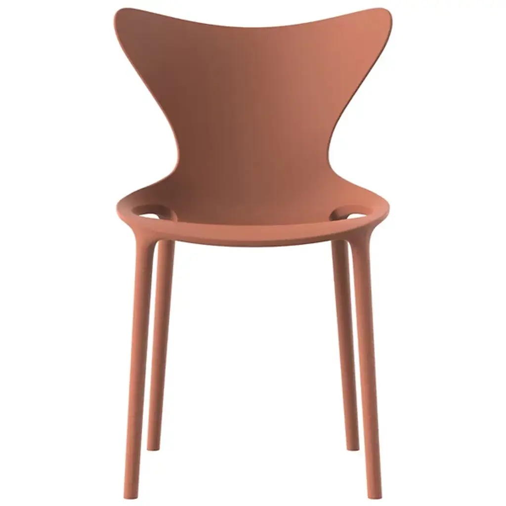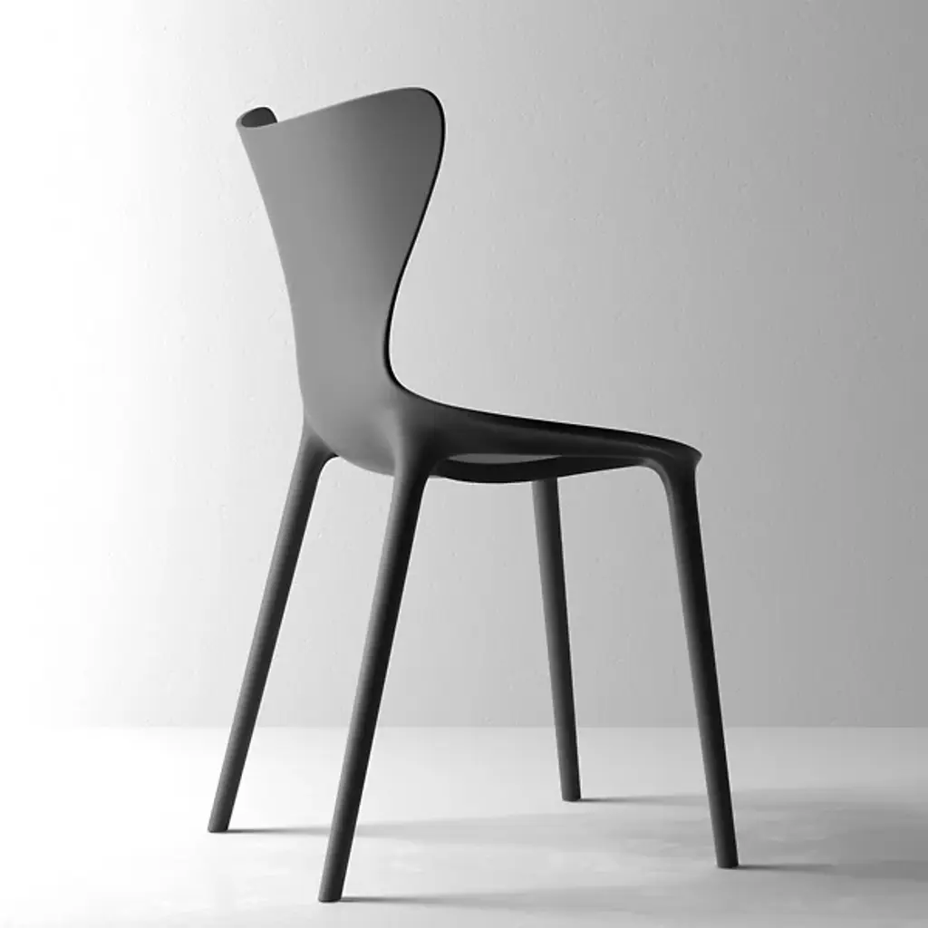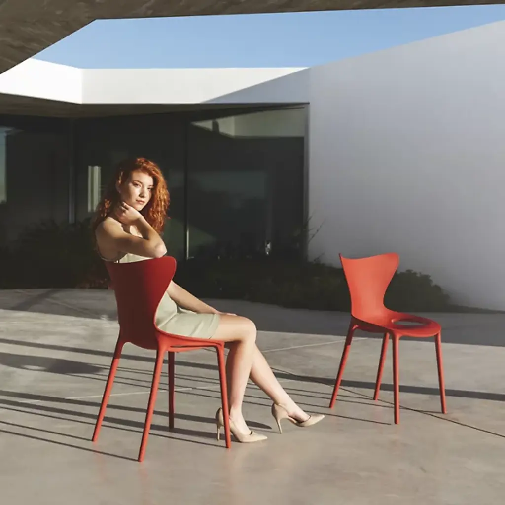The Love Outdoor Side Chair Set of 4 by Vondom was designed by Catalan designer Eugeni Quitllet and inspired by the concept of love. Aiming to capture the feeling that involves both body and soul, this sculptural chair plays with form and function, lasting design, and eco-consciousness. Made from polypropylene and reinforced with fiberglass manufactured by gas injection, this stackable piece is constructed from 100% recycled plastic from the Mediterranean Sea and is at home both indoors and out.