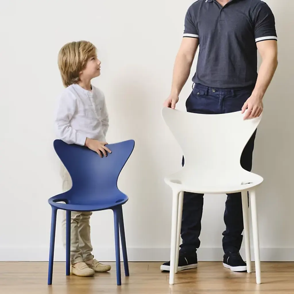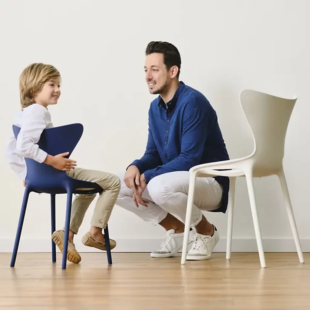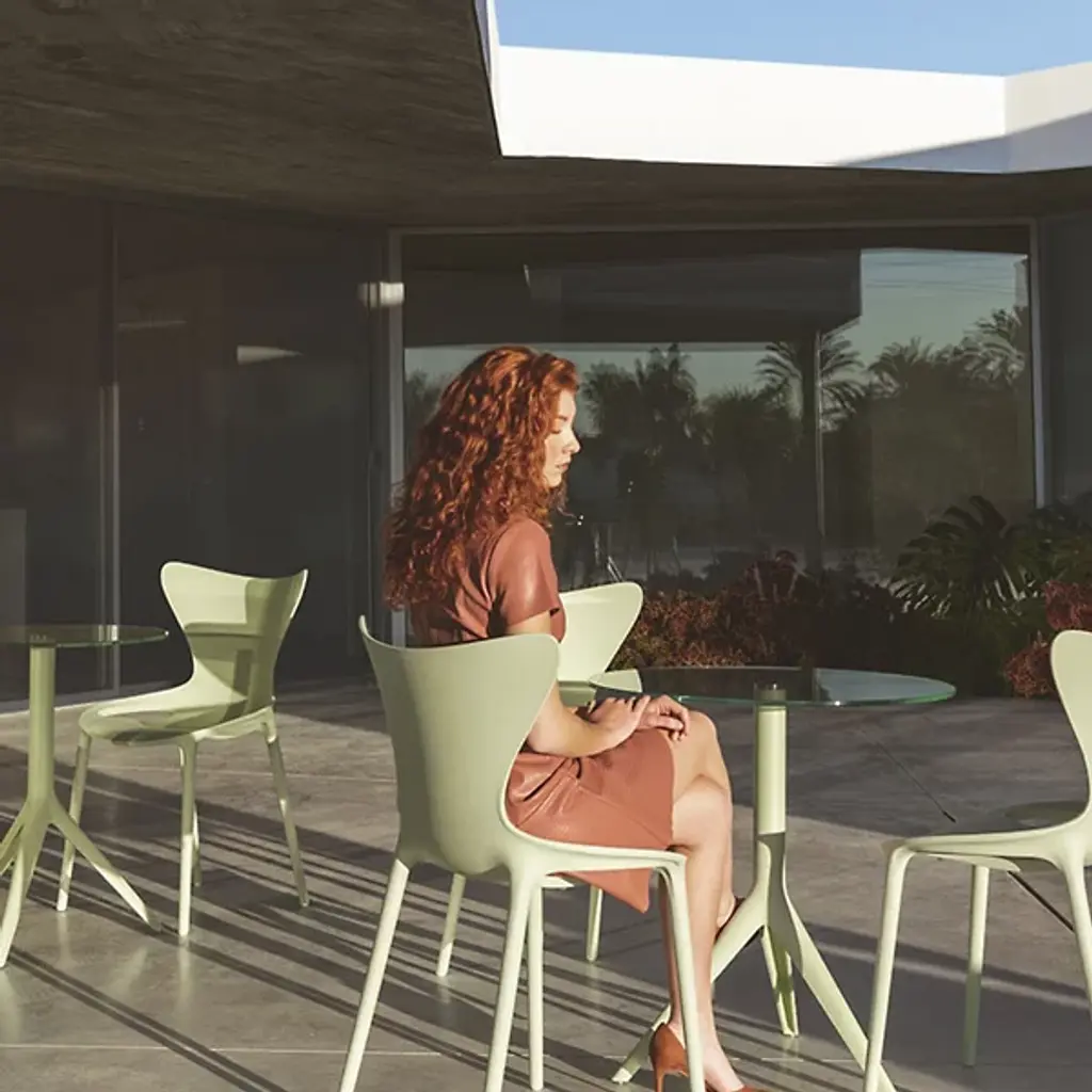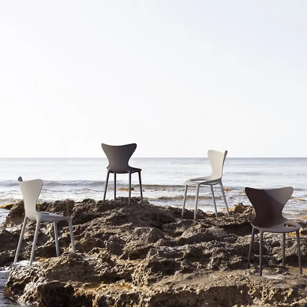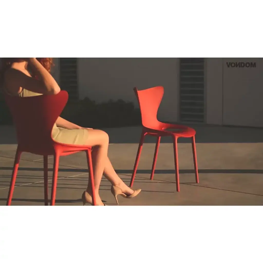 The Love Outdoor Side Chair Set of 4 by Vondom was designed by Catalan designer Eugeni Quitllet and inspired by the concept of love. Aiming to capture the feeling that involves both body and soul, this sculptural chair plays with form and function, lasting design, and eco-consciousness. Made from polypropylene and reinforced with fiberglass manufactured by gas injection, this stackable piece is constructed from 100% recycled plastic from the Mediterranean Sea and is at home both indoors and out.