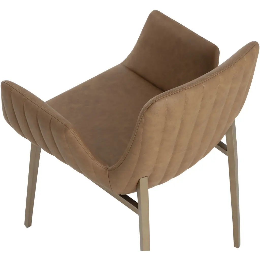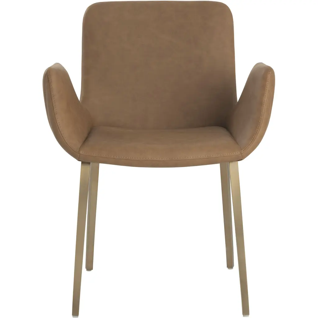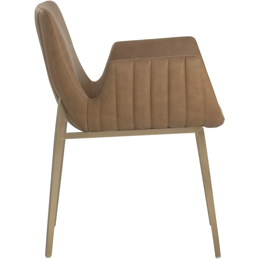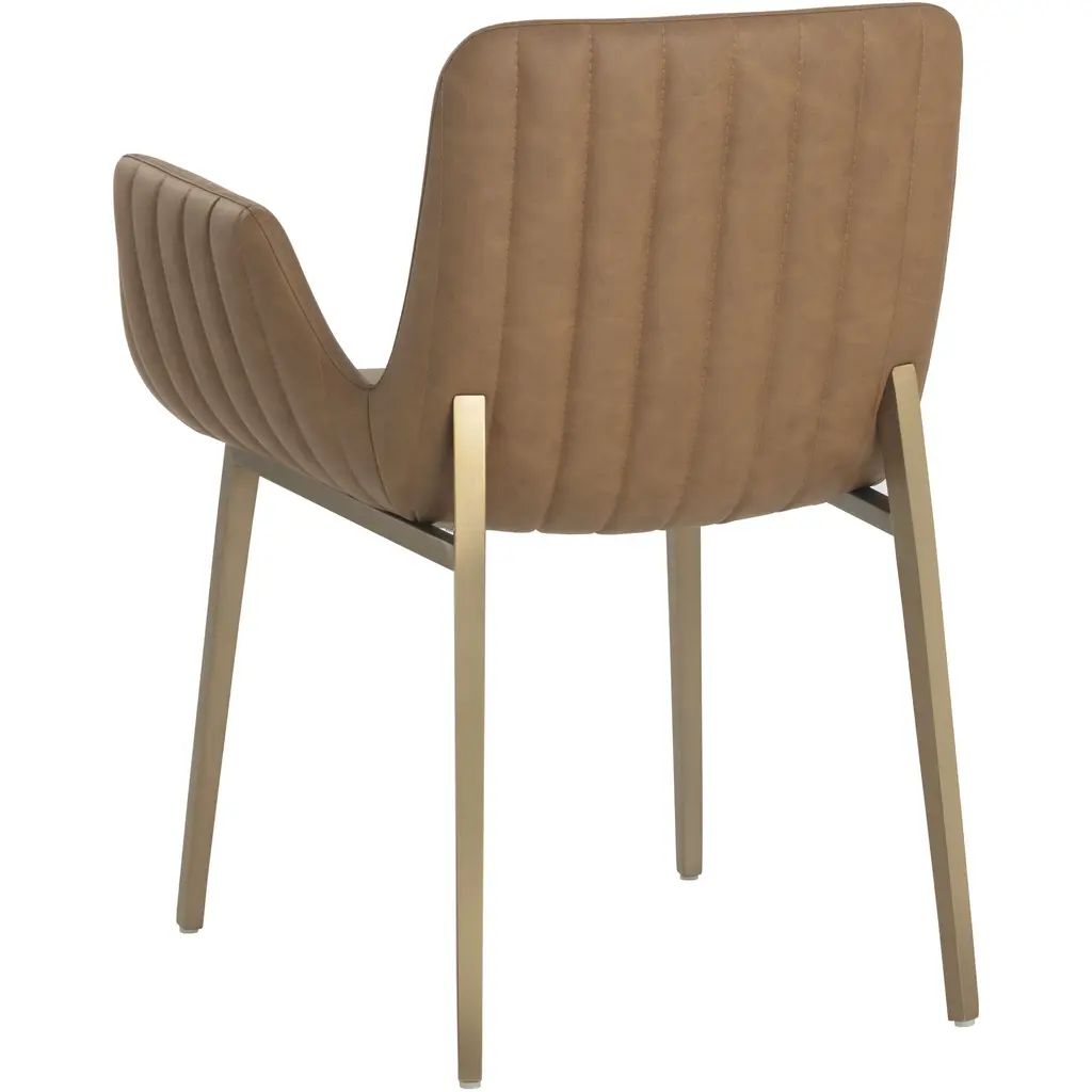 With its stunning scooped design, the Lucano Dining Armchair is an impressive addition to any dining space. Features vertical channel tufting on exterior seat. Stocked in milliken cognac faux leather and completed with gold stainless steel legs.
