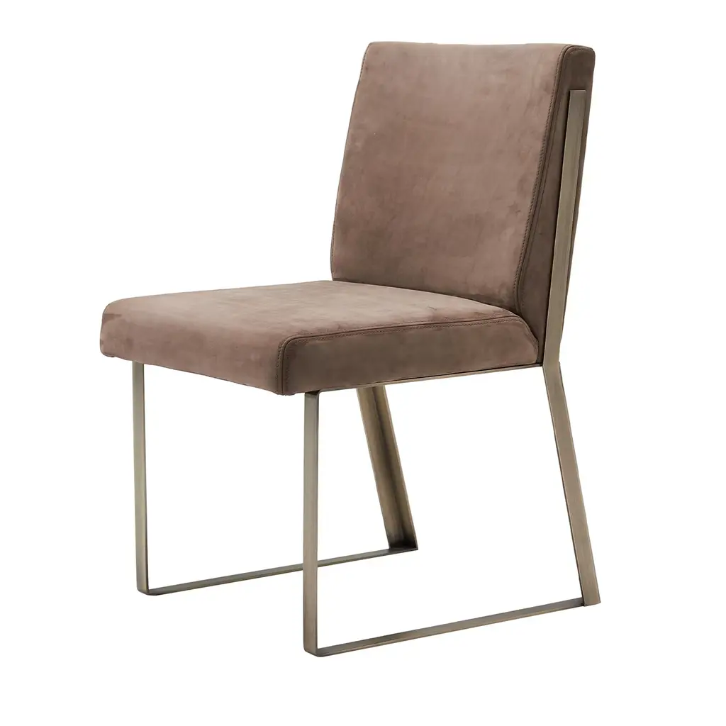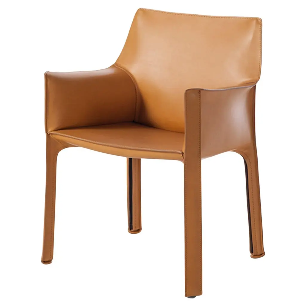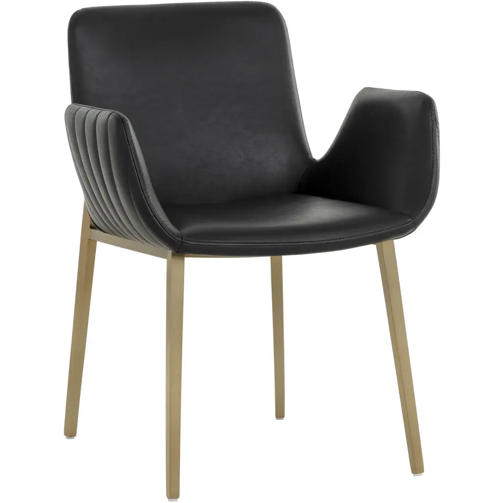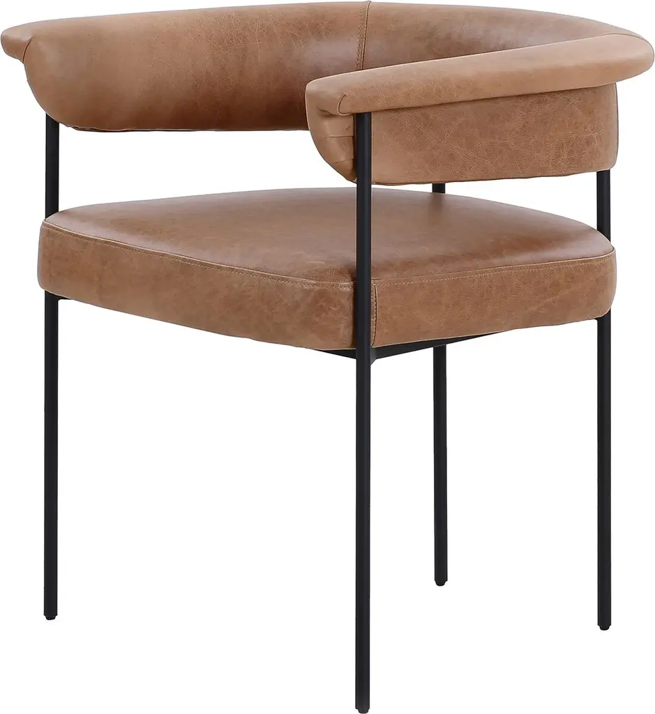 With its stunning scooped design, the Lucano Dining Armchair is an impressive addition to any dining space. Features vertical channel tufting on exterior seat. Stocked in milliken cognac faux leather and completed with gold stainless steel legs.
