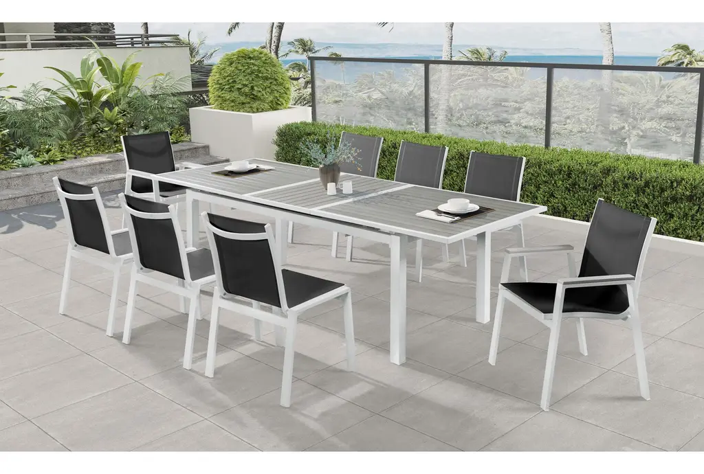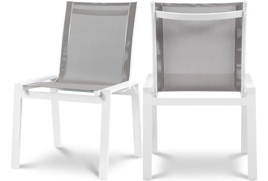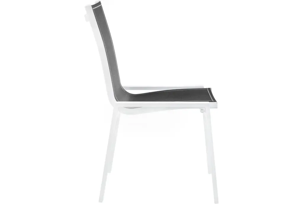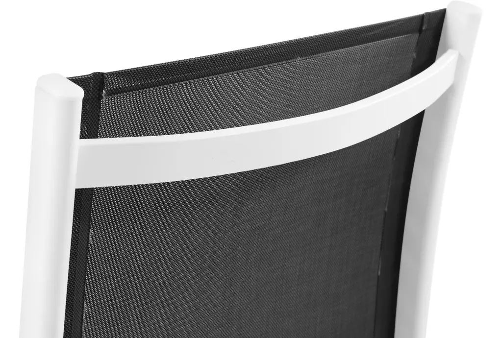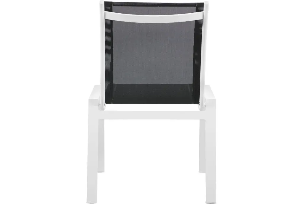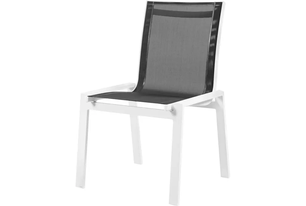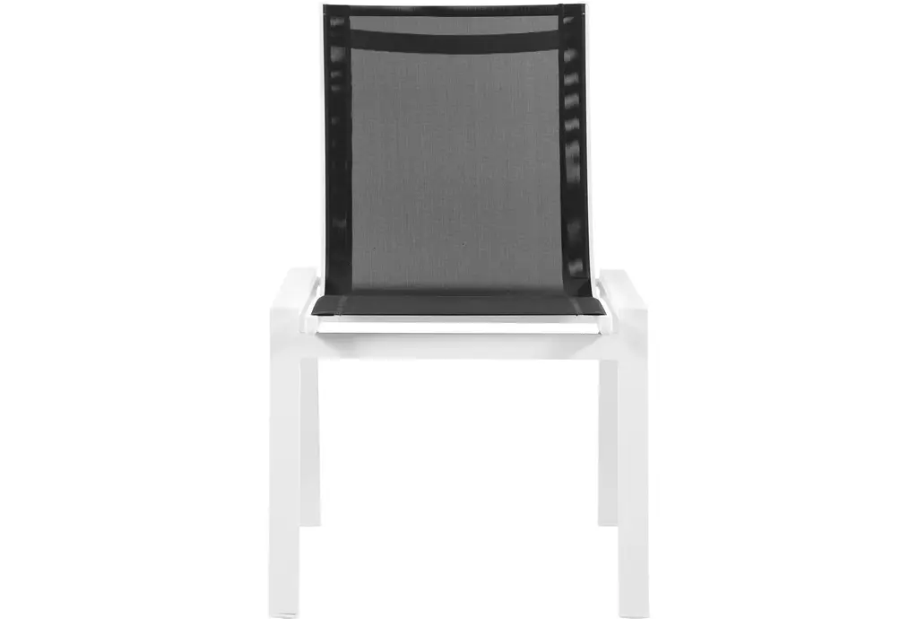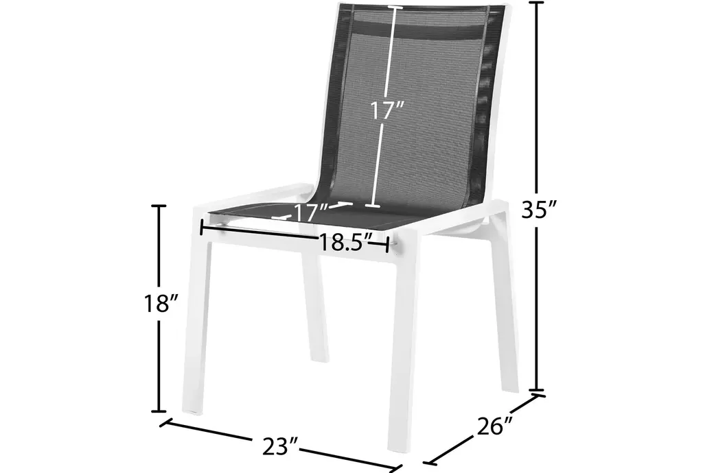 The Lucas Black Mesh Water Resistant Fabric Outdoor Patio Aluminum Mesh Dining Chair Set is perfect for modern outdoor dining spaces. These armless chairs are designed with a minimalist aesthetic and are crafted to withstand various weather conditions. Enjoy comfort and style with this durable set of two chairs.