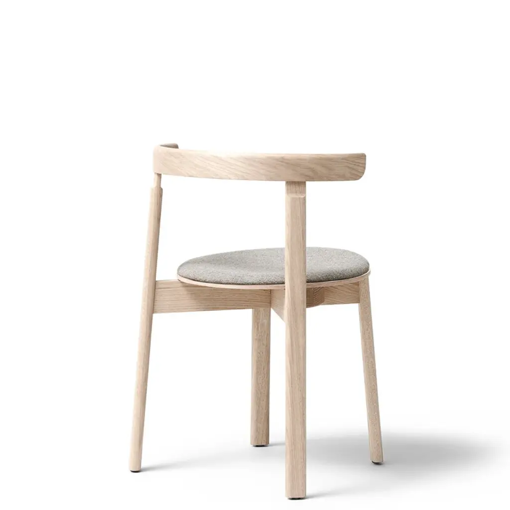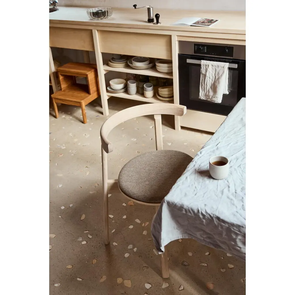 Form & Refine's Lunar chair features a sturdy solid wood frame with an exceptionally soft, flowing design. The veneered Lunar chair is centered around its round, upholstered seat, beautifully complemented by a curved backrest. Crafted from a single piece of wood, the backrest also provides arm support, making the Lunar chair perfect not only as a dining chair but also for celebrations, gatherings and those long, leisurely evenings around the table. Herman Studio aimed to design a light and embracing chair that allows for easy posture changes. The cross-legged structure enhances the chair's airy appearance, ensuring stability and easy stackability. For cleaning, the chair can also be hung from the table. The durable Lunar chair is ideal for both home use and public spaces such as restaurants or offices.