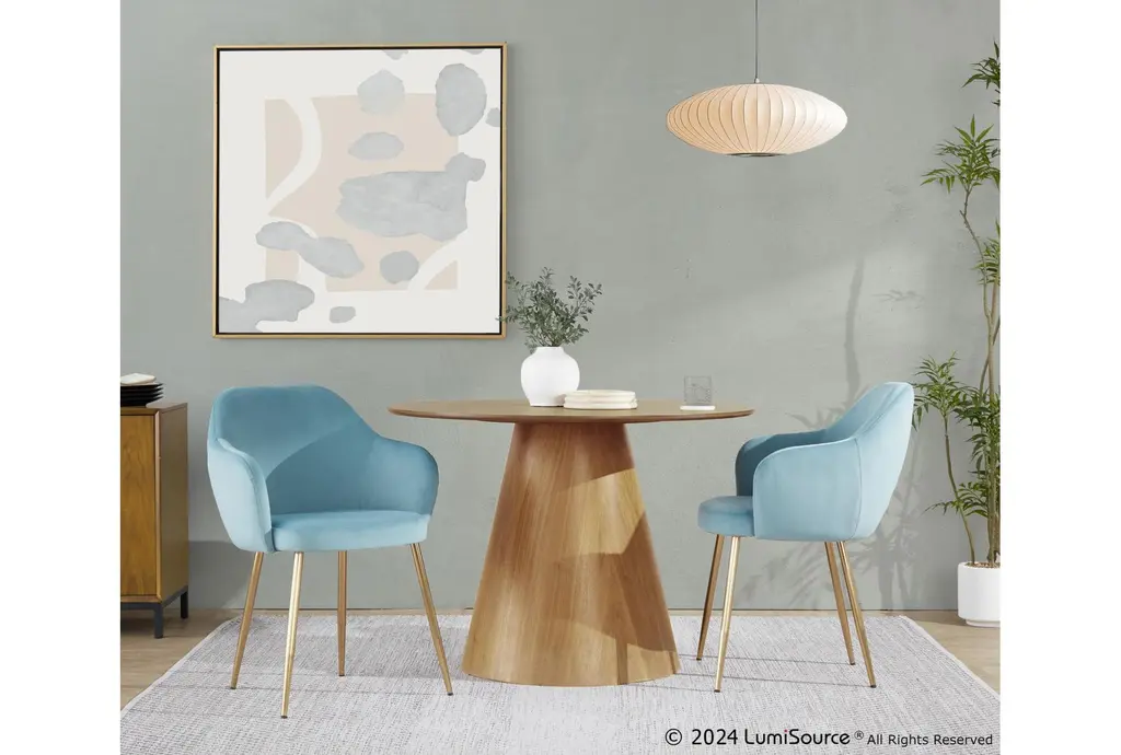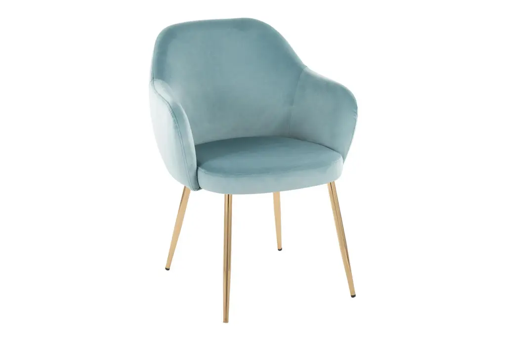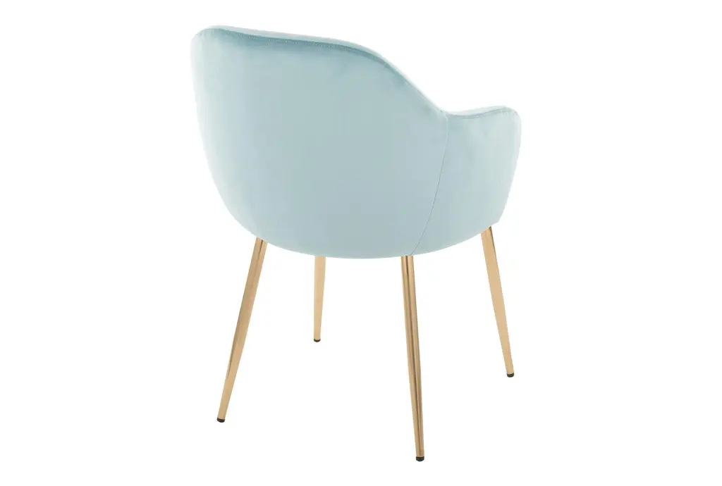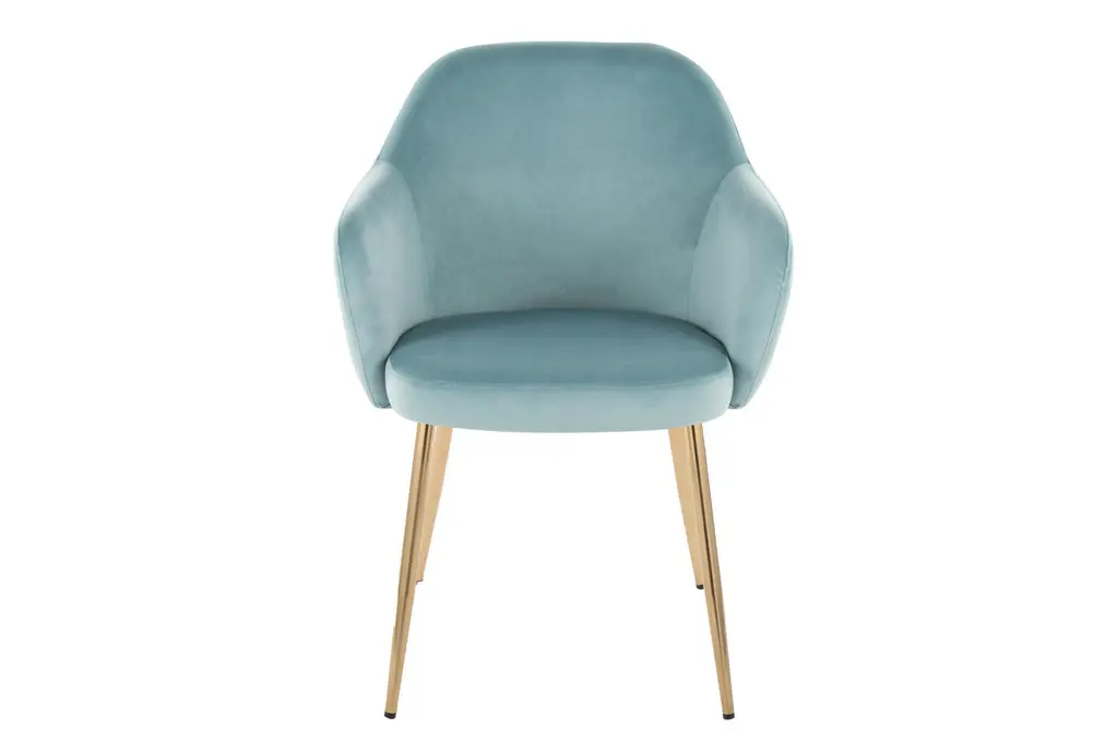The Lunna Blue Upholstered Velvet Dining Chair in Gold Metal is a stunning addition to any dining room. Featuring a contemporary design, these chairs offer both style and comfort with their plush velvet upholstery and supportive armrests. The gold metal legs provide a striking contrast to the soft blue fabric, making these chairs a standout piece.