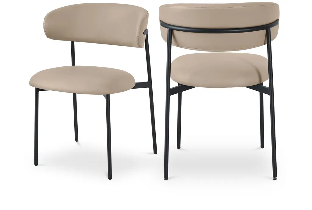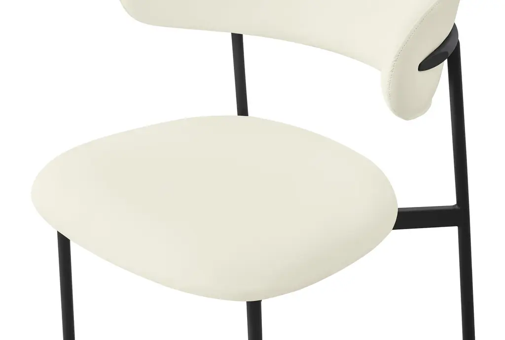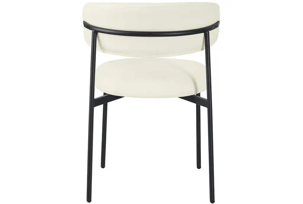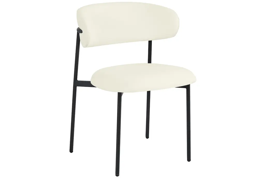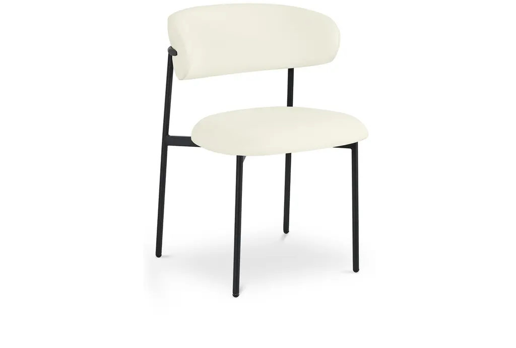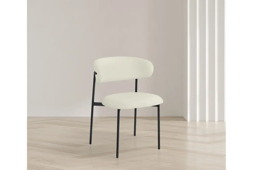 The Lupita Cream Vegan Faux Leather Dining Chair with Matte Black Finish Set of 2 brings modern sophistication to your dining room. The combination of vegan leather and matte black iron legs creates a stunning contrast that enhances any dining space. These armless chairs are designed for comfort and style, making them perfect for everyday dining and special occasions.