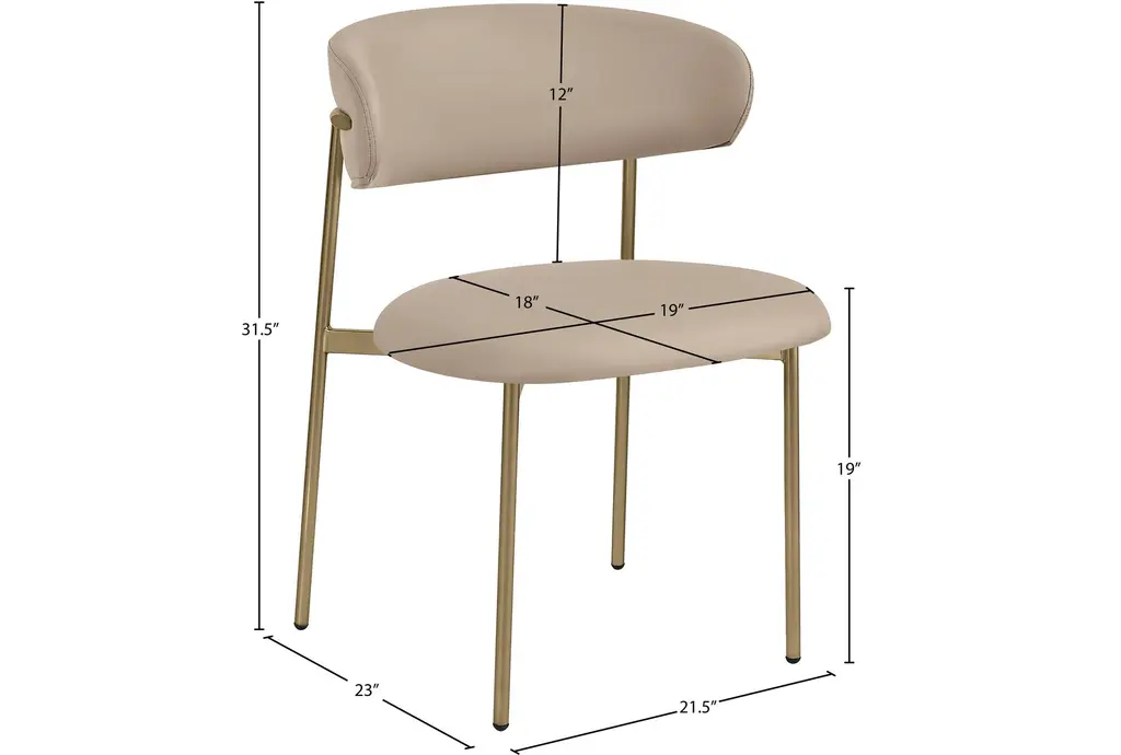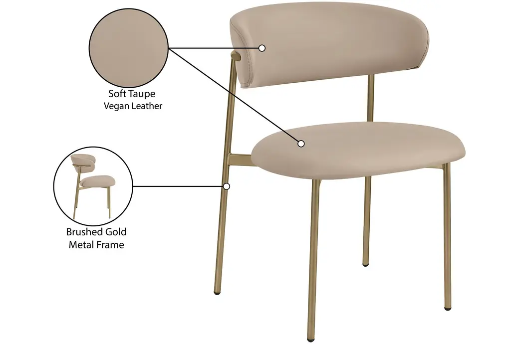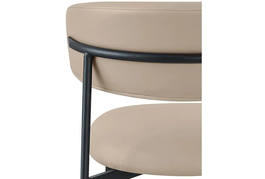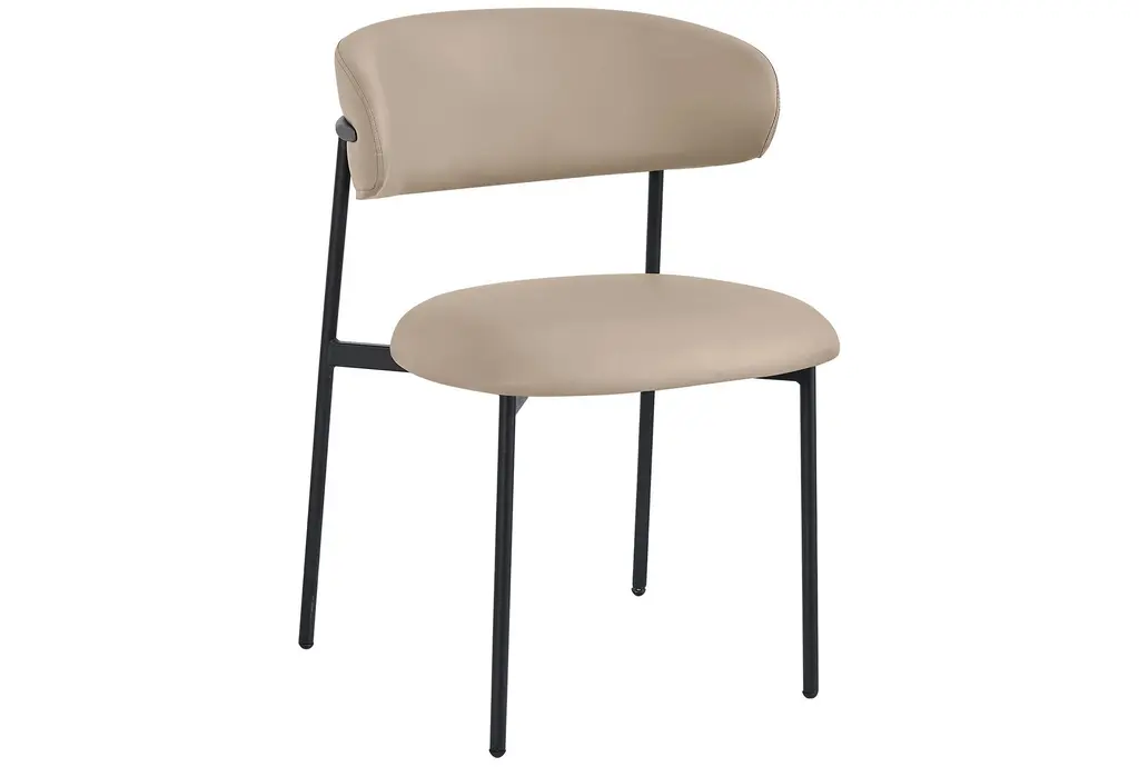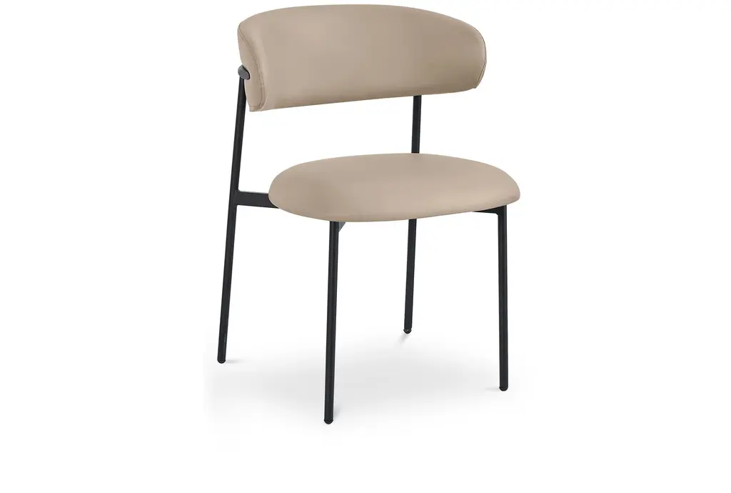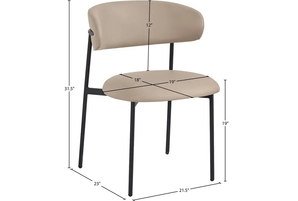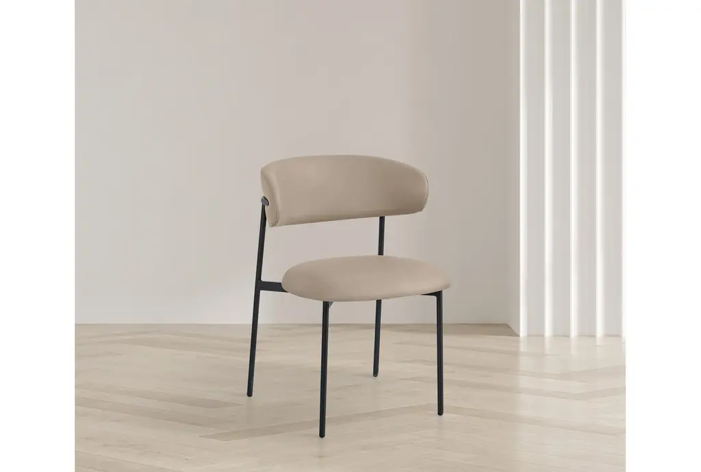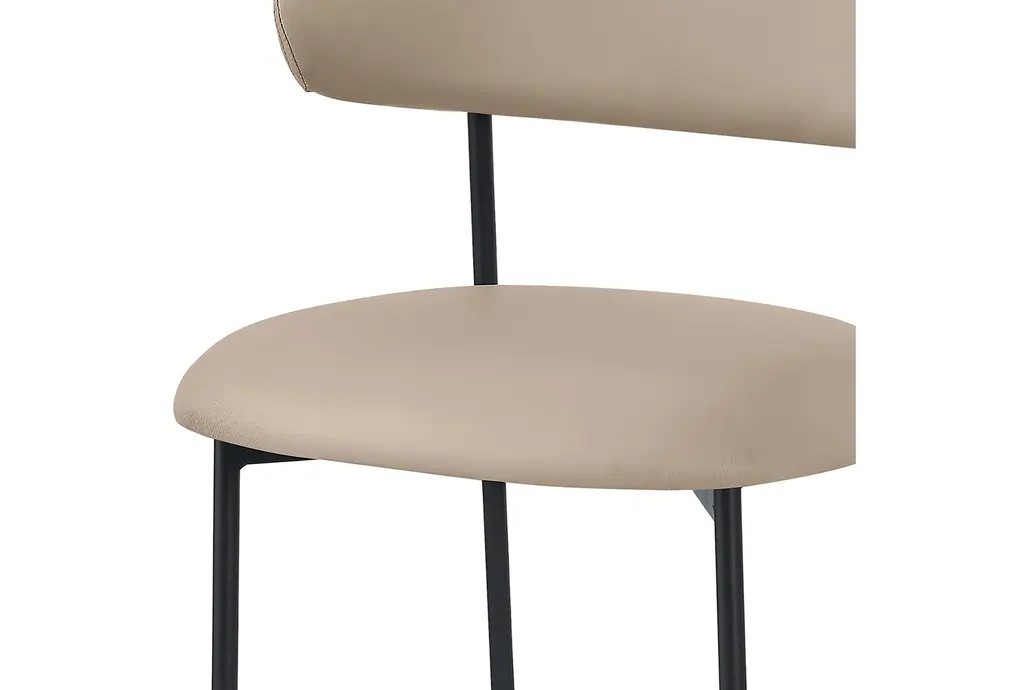 The Lupita Taupe Vegan Faux Leather Dining Chair with Matte Black Finish Set of 2 brings modern sophistication to any dining room. The neutral taupe color blends seamlessly with a variety of decor styles, while the matte black finish on the iron legs adds a touch of contemporary flair. These armless chairs offer both comfort and durability with their vegan leather and foam construction.