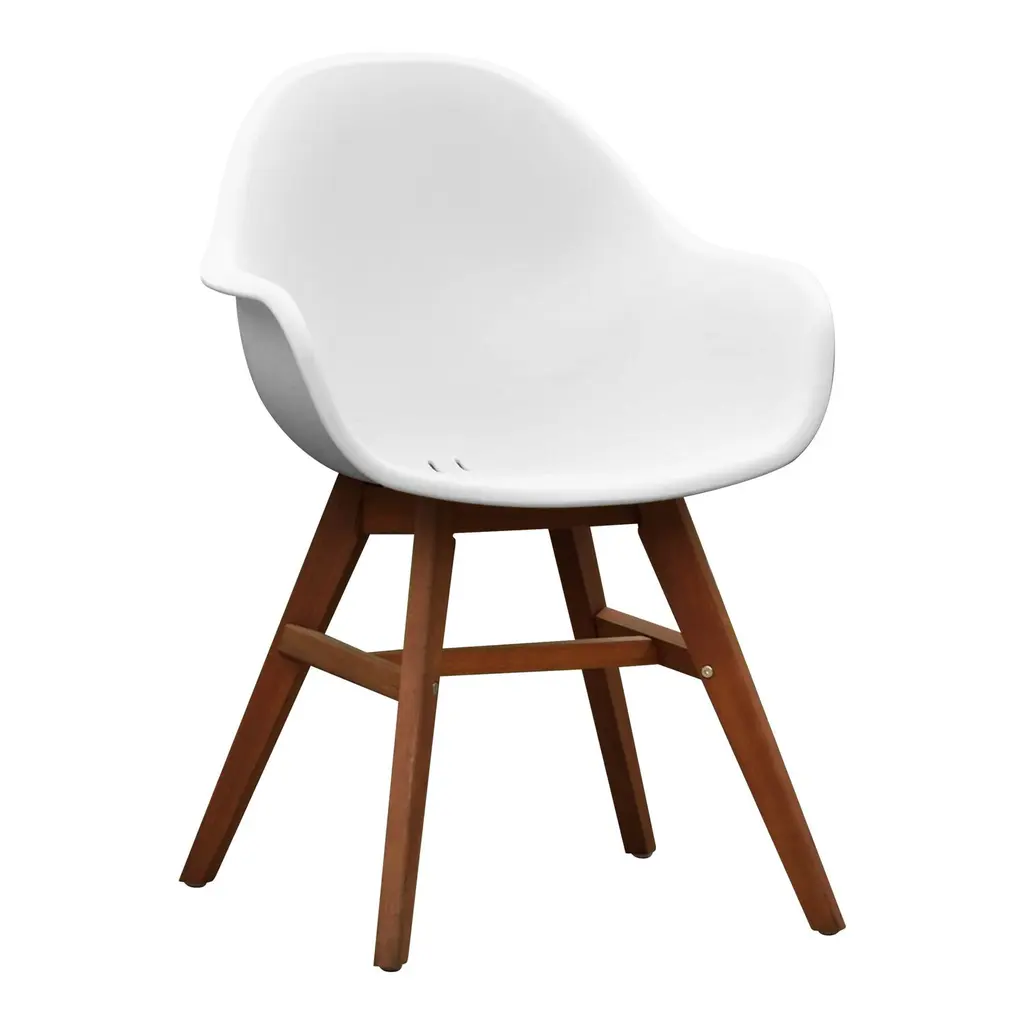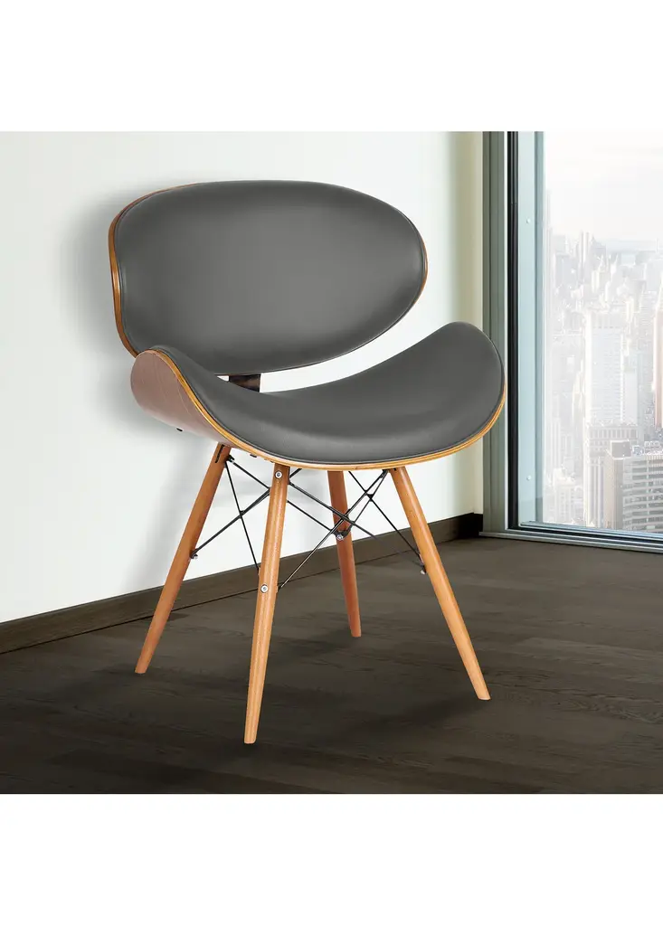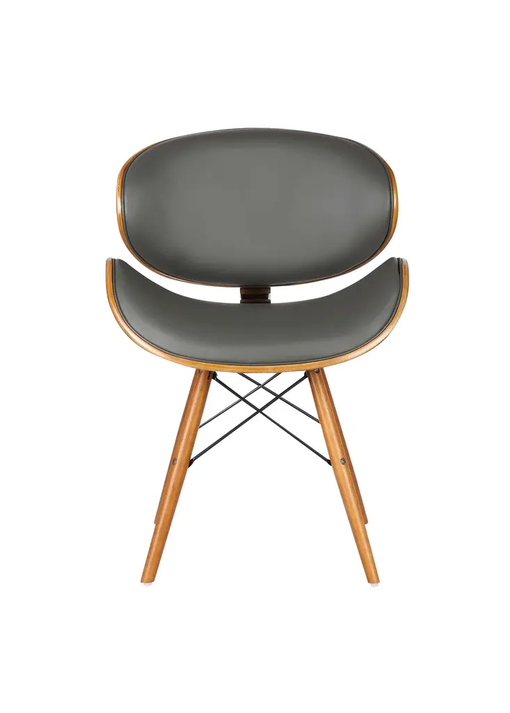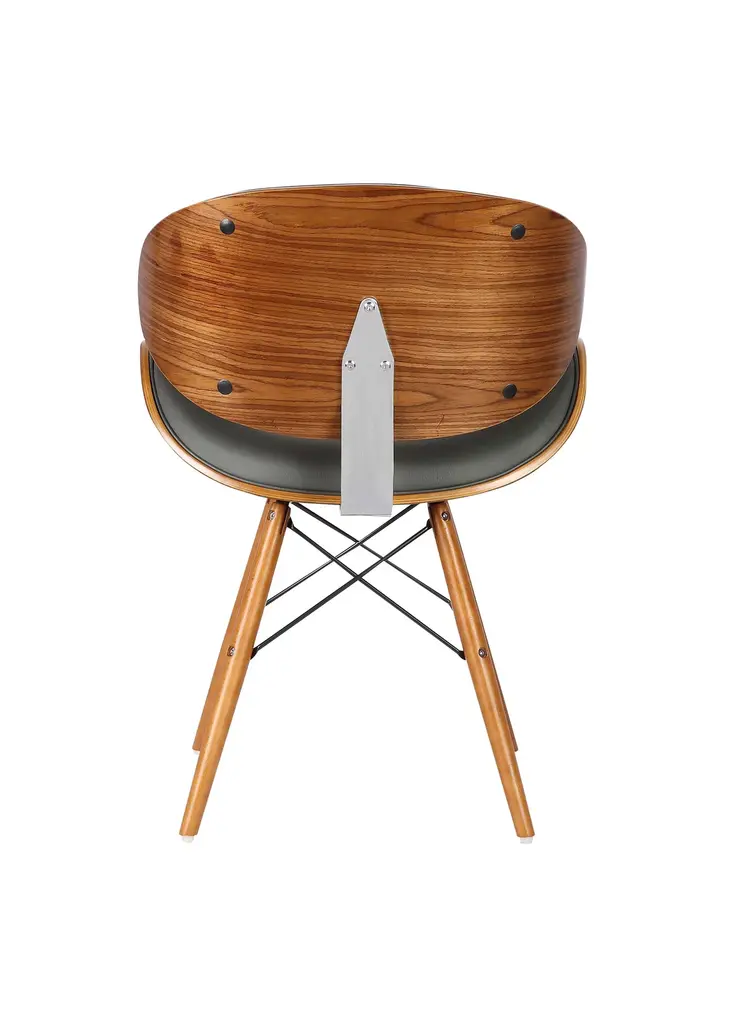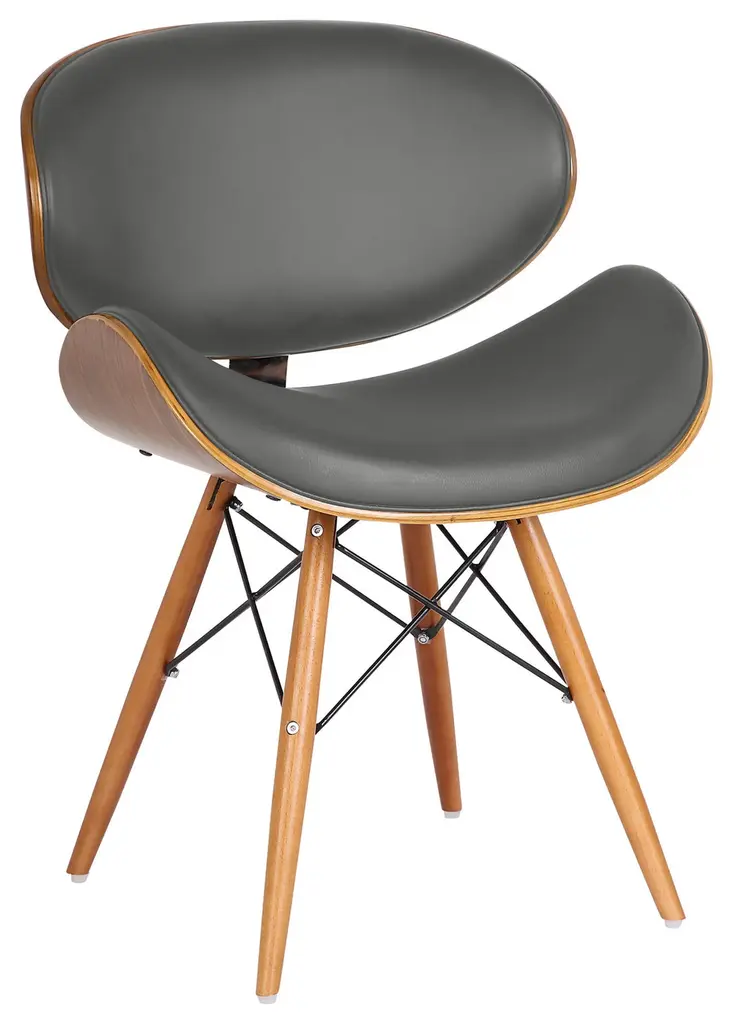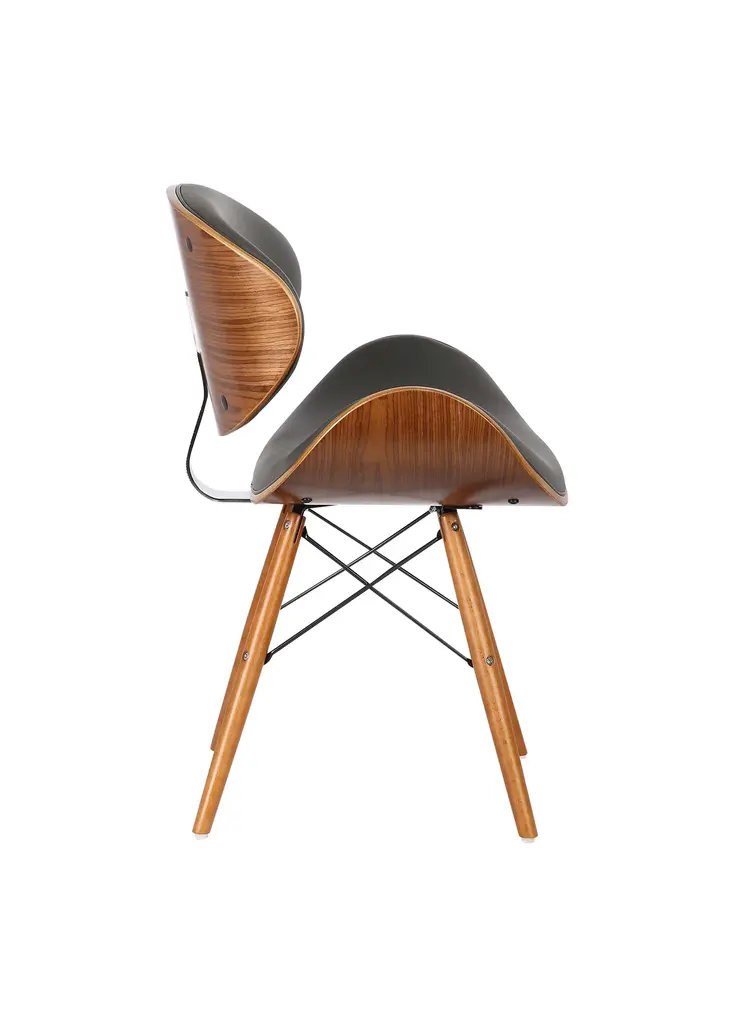 The Dwellist Lutheran mid-century dining chair features a clam-shell seat frame, presenting a unique spin on the traditional modern chair design. This dining chair features an elegantly curved back framed in a walnut wood finish. The plump Faux Leather upholstery of the piece is padded with foam, offering excellent lower back support. The eiffel leg design features metal wires which enhance the suitability and durability of the tapered walnut wood legs. The Lutheran even comes with floor protectors to further ensure stability and minimize the risk of floor scratches. The Lutheran's upholstered seat is available in two beautiful colors; black and gray.