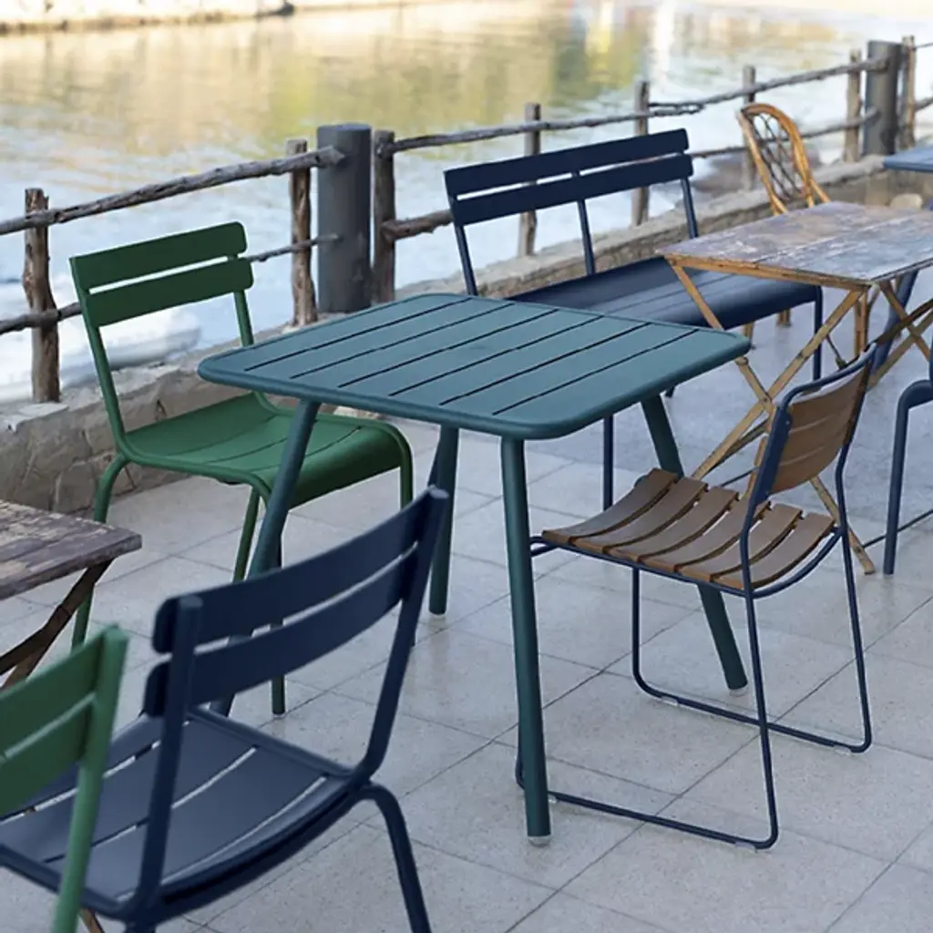 The Fermob Luxembourg Dining Side Chair, Set of 2 is a sleek yet durable outdoor dining option that will add a pop of color. Designed by Frederic Sofia as a modern interpretation of the iconic chairs found in Jardin du Luxembourg, the result is a distinctive piece that combines the resistance of aluminum with the comfort of curved seats. The curved aluminum slats on the seat and back offer a comfortable place to lounge and socialize, whether indoors or out. The minimal profile features aluminum construction finished with a durable and colorful UV resistant powder coat. Stackable for quick and easy storage, up to 6 high.