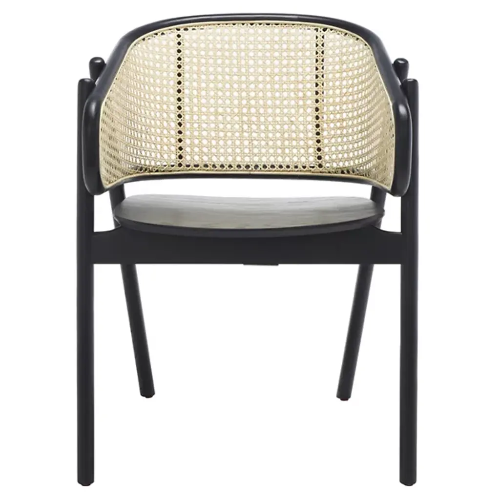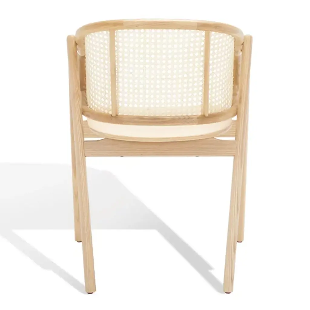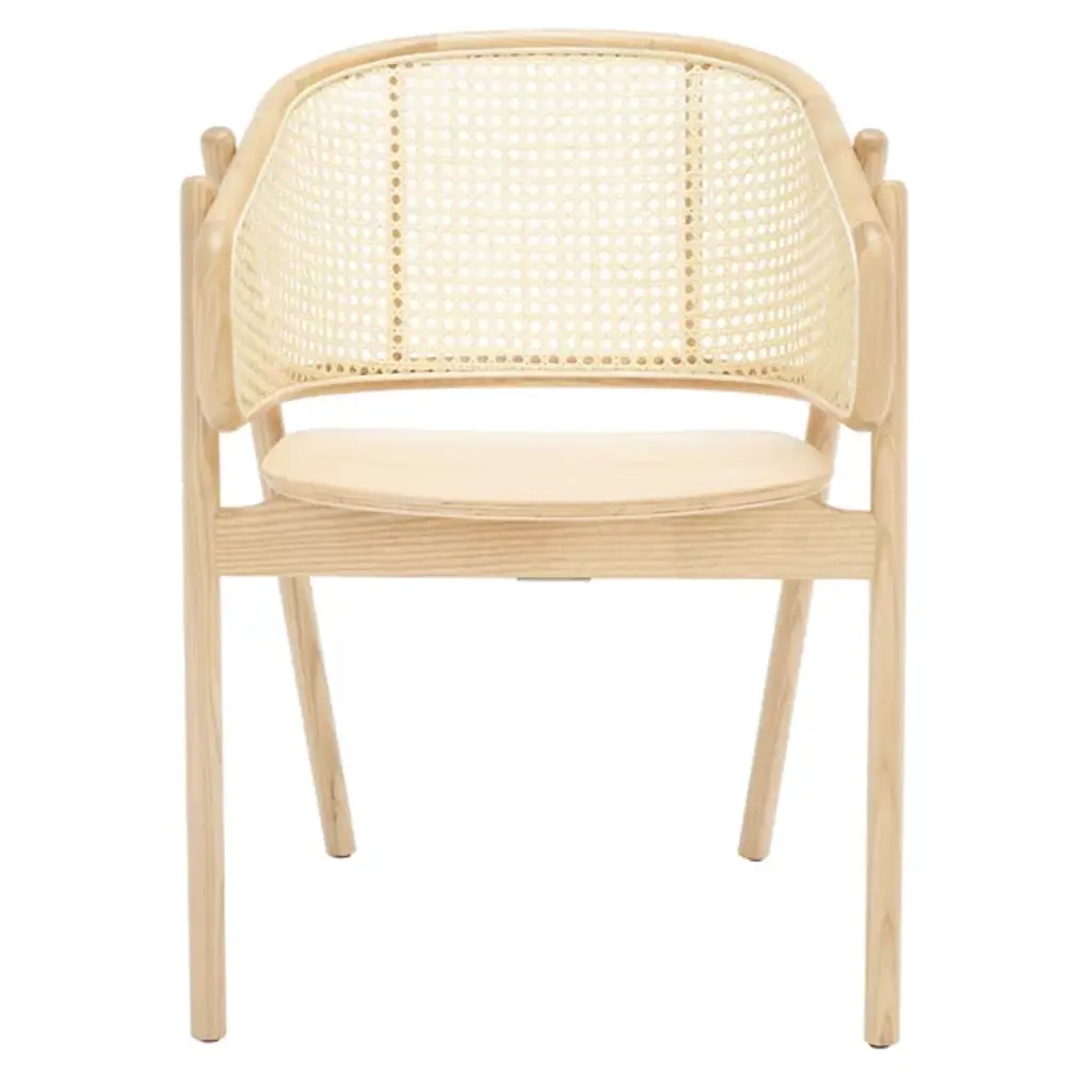 Experience warmth and coziness with the Mackenna Dining Armchair from Alder & Ore. This chair exudes a natural and inviting vibe with its warm rattan weave on the backrest. The contemporary design is highlighted by the curving, sheltered back, which offers both comfort and a stylish touch. The round, elliptical seat provides ample space to relax and enjoy meals, while the conical legs crafted in solid ash wood ensure stability and durability.