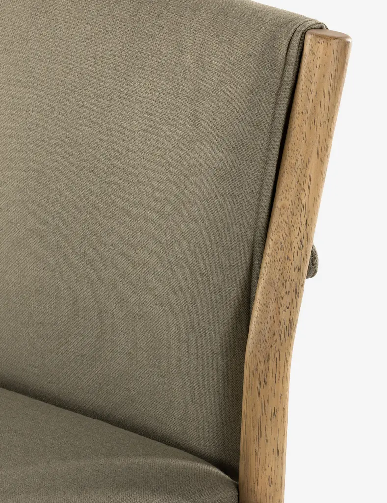 Macklin offers a stylish dining chair made for practical appeal. Textural earth tone upholstery is folded over the light wood frame offering a comfortable dining seat with versatile styling potential. The performance fabric is ideal for withstanding spills and stains in an everyday dining space.
