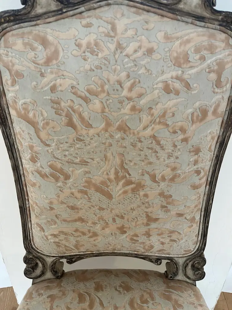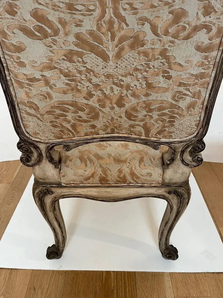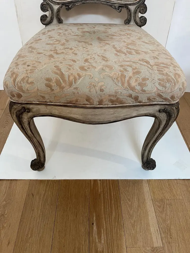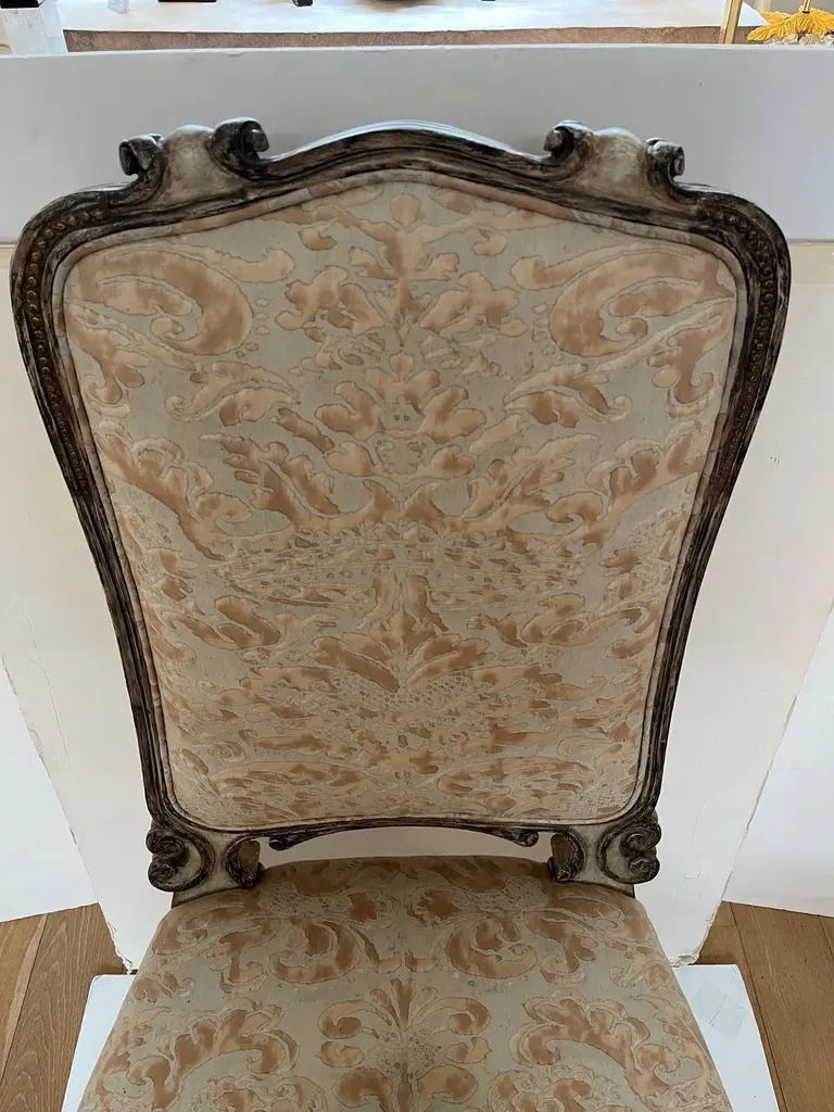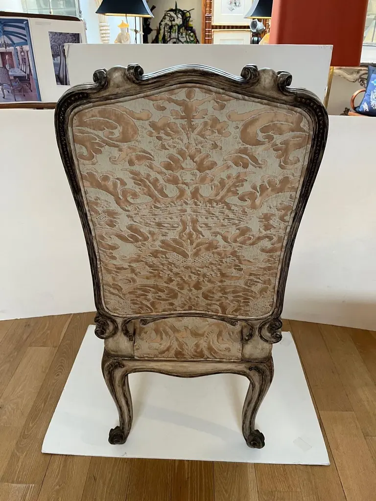 Made to Order Carved Back and Legs Fontain Dining Side Chair, Finish Hand Painted and Gold Leaf Accents and Upholstered in Fortuny Fabric, This a Showroom ModelUpholstery: Customer Own Material