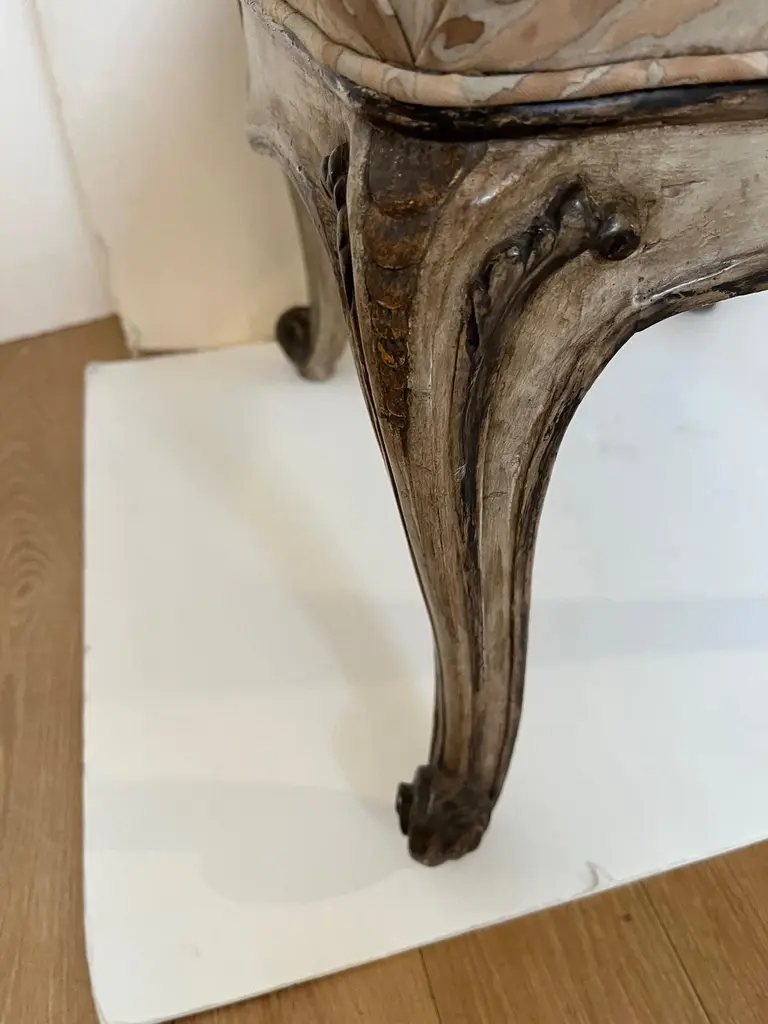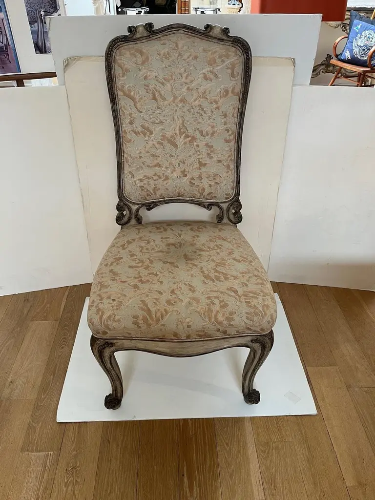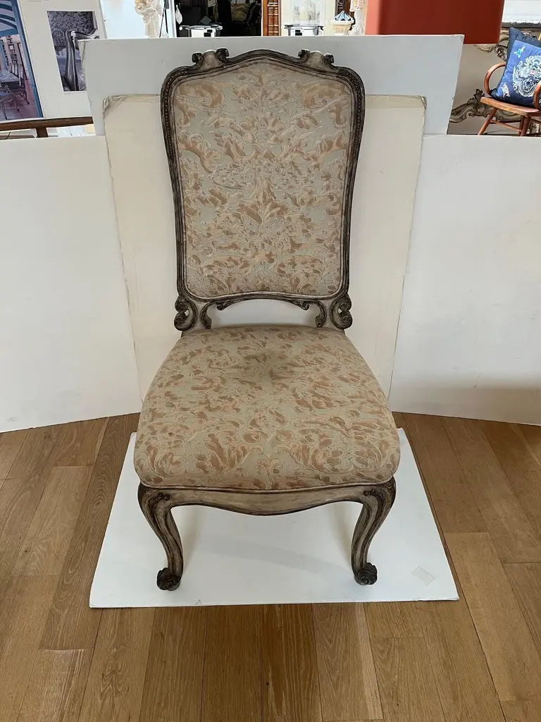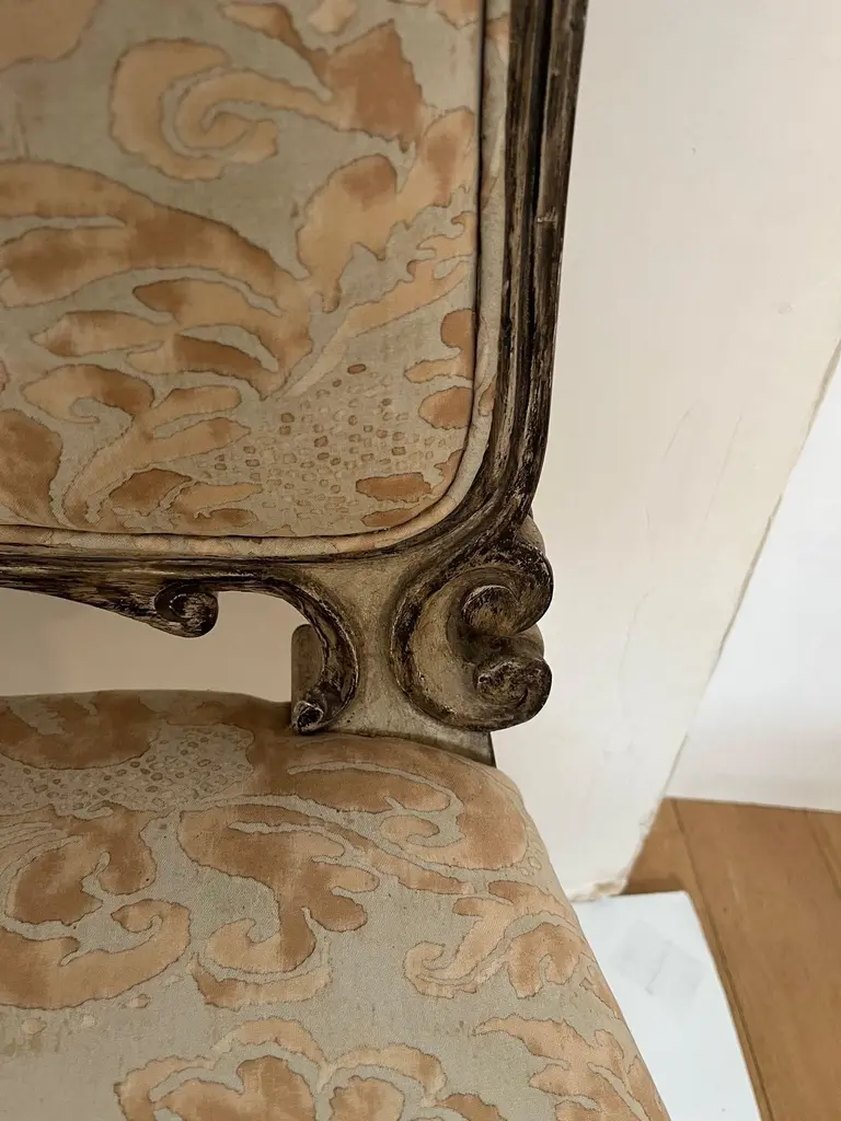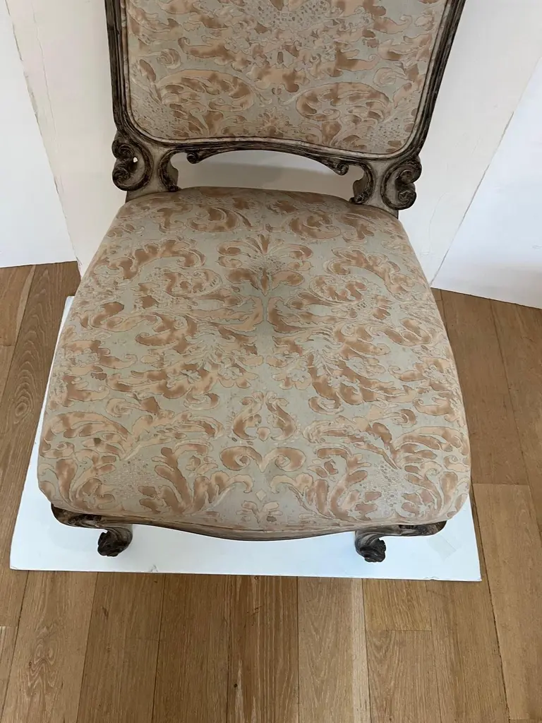 Made to Order Carved Back and Legs Fontain Dining Side Chair, Finish Hand Painted and Gold Leaf Accents and Upholstered in Fortuny Fabric, This a Showroom ModelUpholstery: Customer Own Material