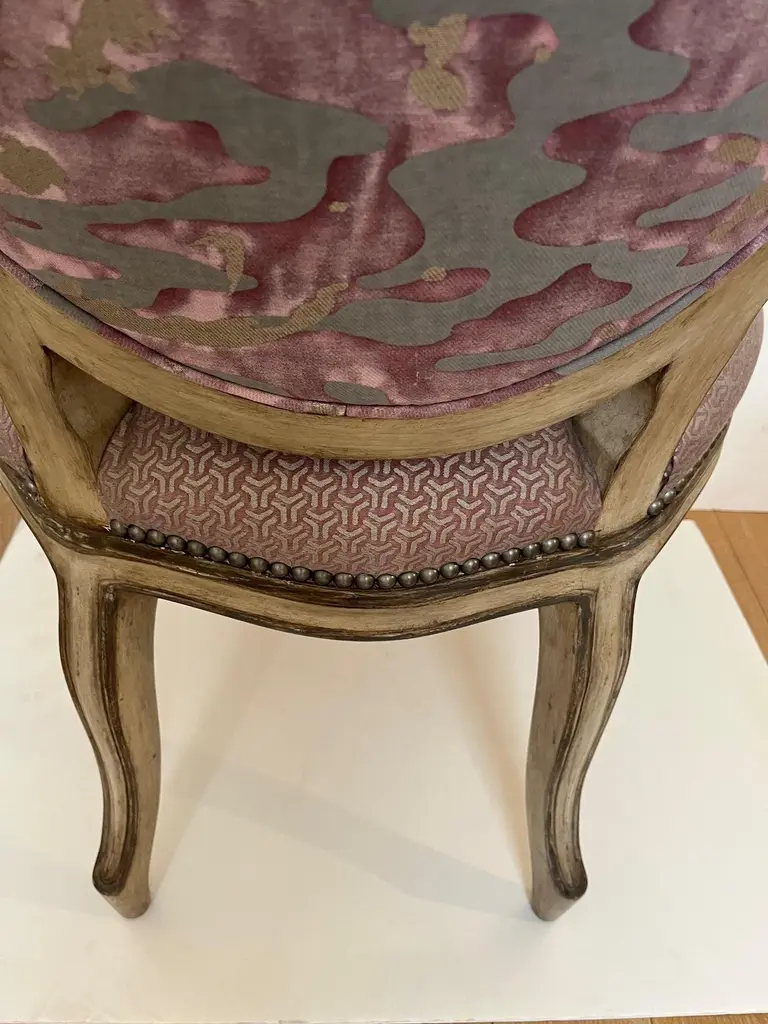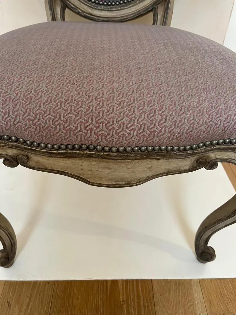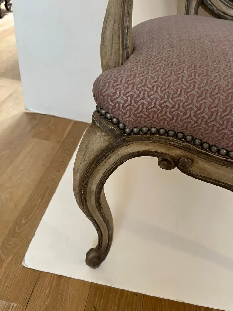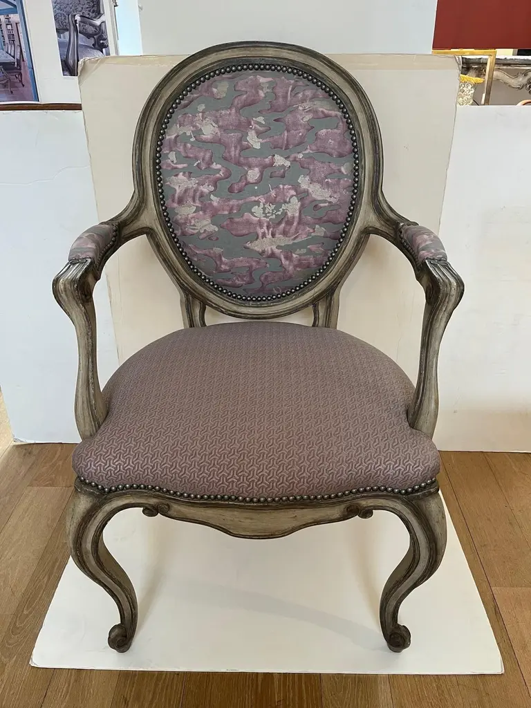 Made to order Louis XV Style Dining Armchair Upholstered in Fortuny Fabrics with Antique Brass Nail Heads Trim at Seat and Inside Oval Back and Arm Rest, Finished in Antiqued Painted Finish, Chair Frame is Solid Wood.Upholstery: Customer Own Material