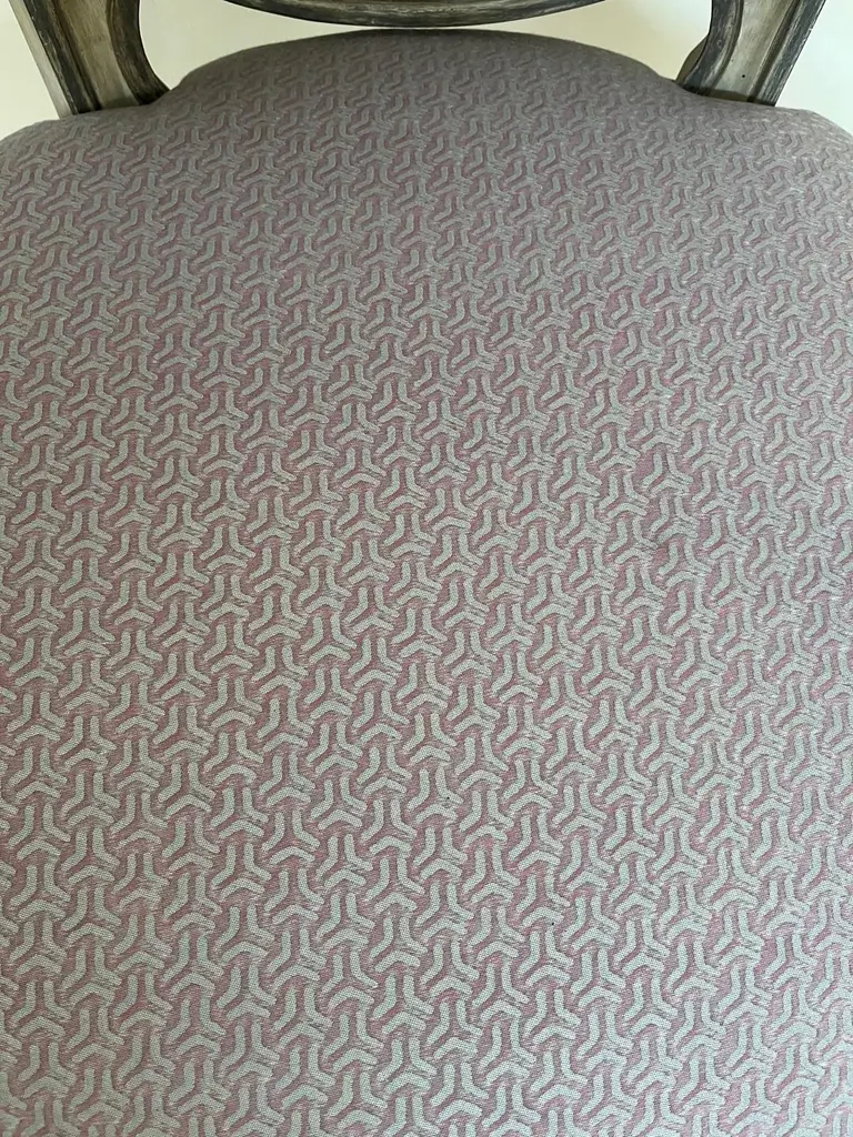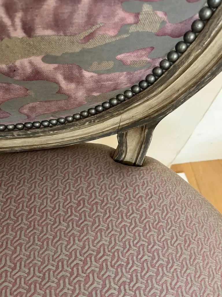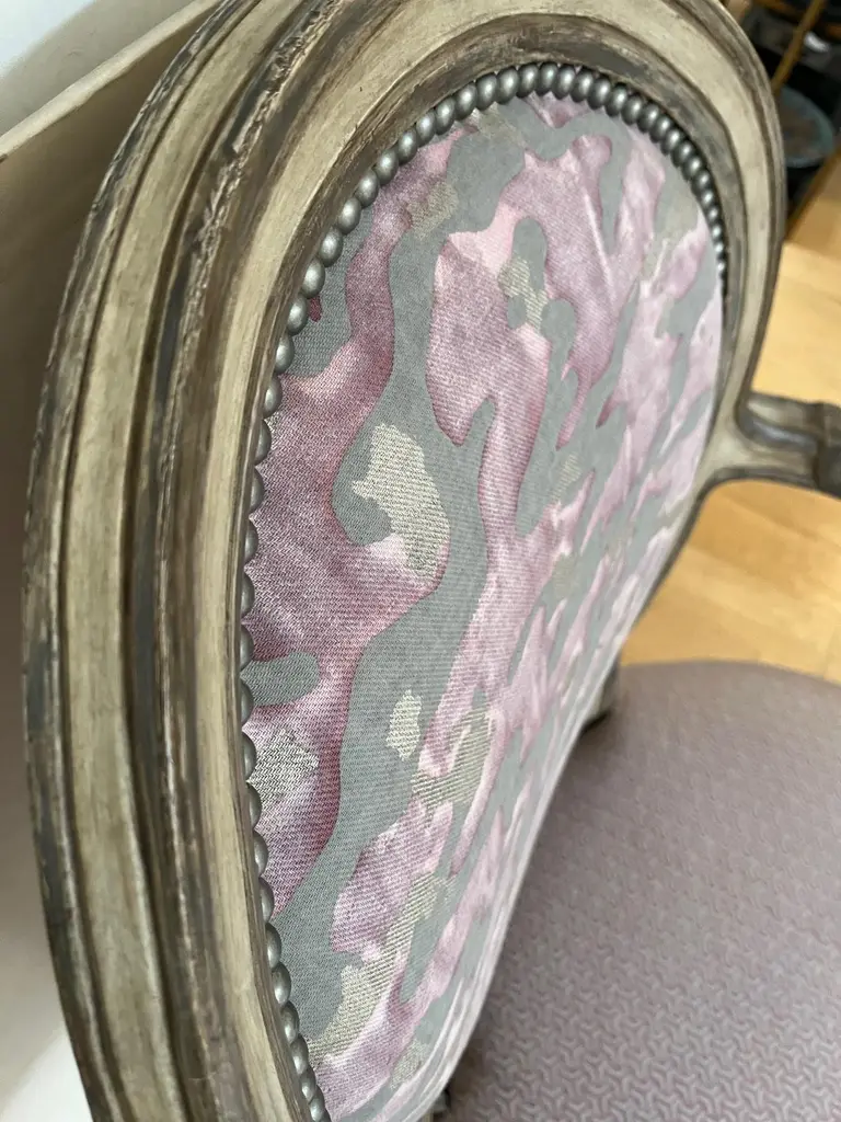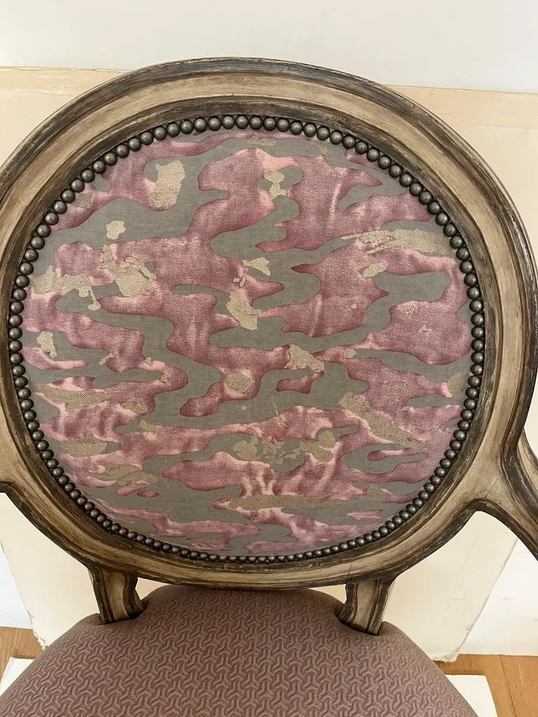 Made to order Louis XV Style Dining Armchair Upholstered in Fortuny Fabrics with Antique Brass Nail Heads Trim at Seat and Inside Oval Back and Arm Rest, Finished in Antiqued Painted Finish, Chair Frame is Solid Wood.Upholstery: Customer Own Material
