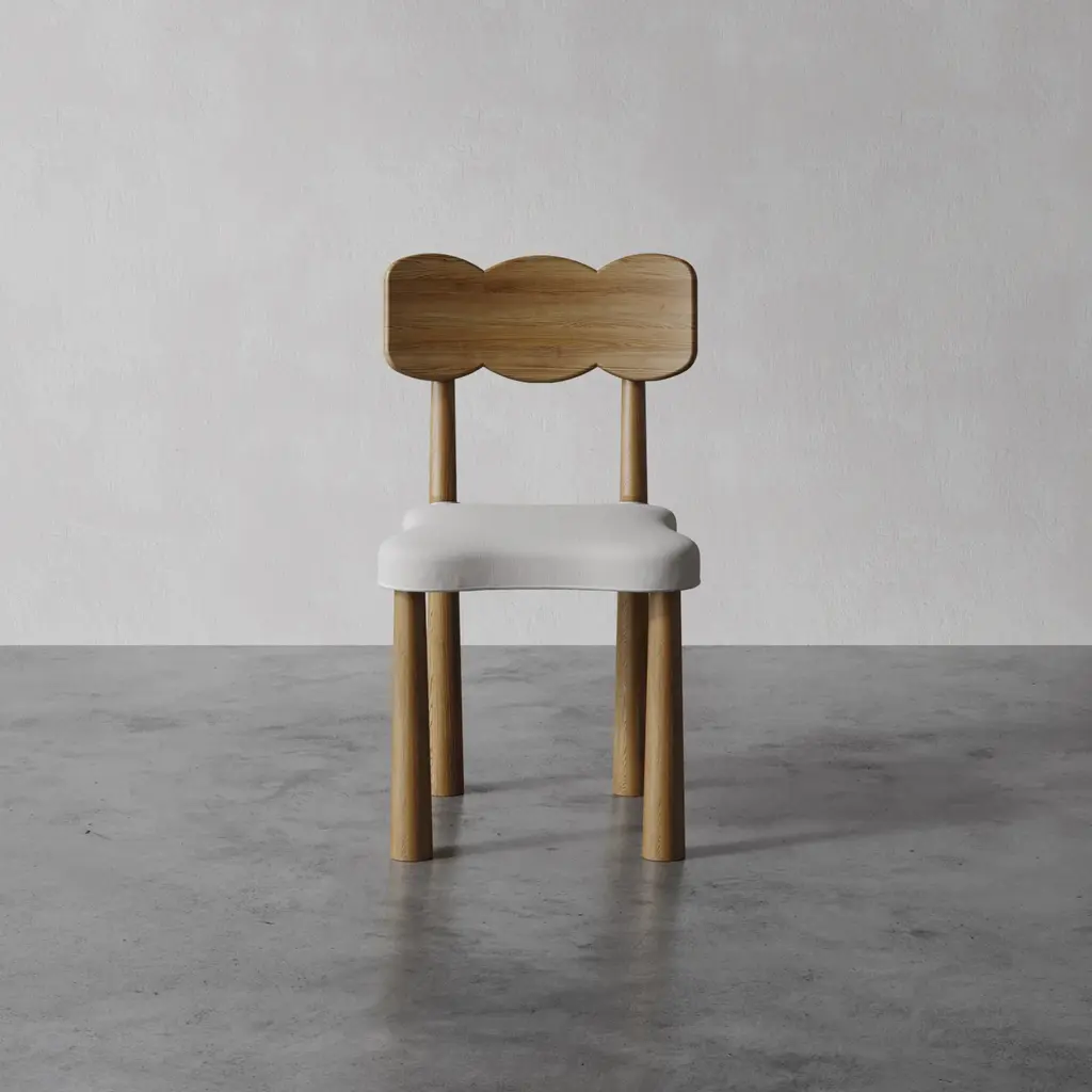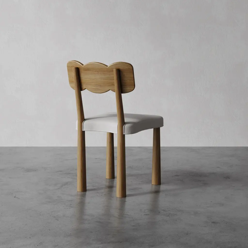 This modern solid Oak dining chair features a unique bow-shaped back and a contoured upholstered seat. The seat is crafted for comfort and made with a woven performance-grade fabric that protects against spills and stains, ensuring longevity. The combination of the shaped back and the sturdy oak construction creates a distinctive and functional piece perfect for any dining area. Available in both Oak and Walnut finishes.