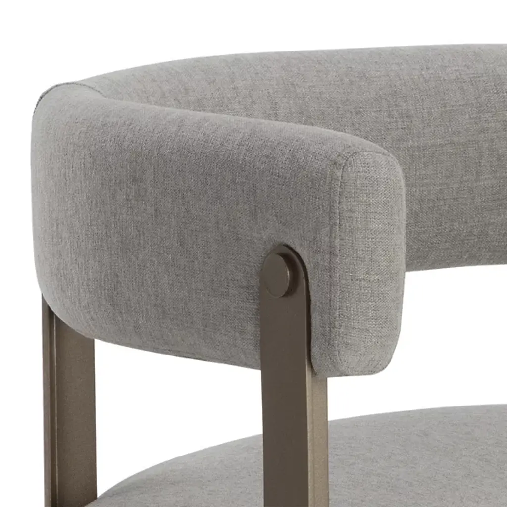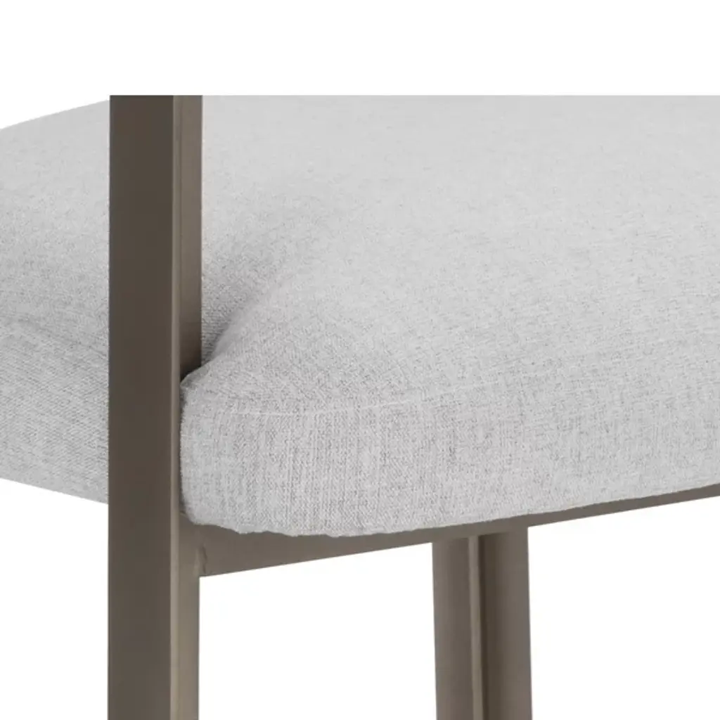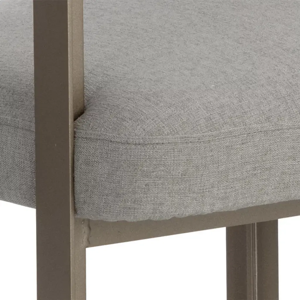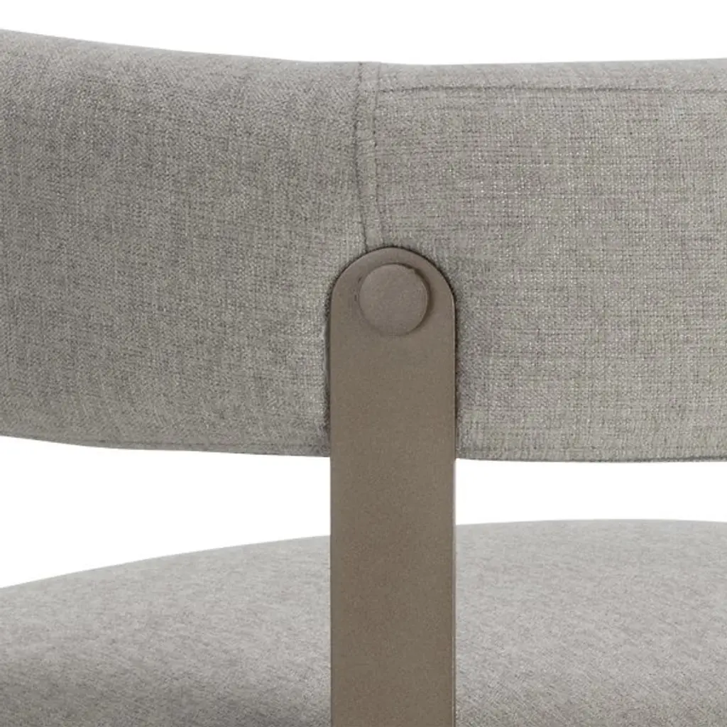 The Mae Dining Armchair by Sunpan epitomizes style and elegance with this stunning dining armchair. Its design showcases a contemporary barrelback seat, upholstered in exquisite Ernst Sandstone fabric, resting atop a powder-coated steel base with a lustrous gold finish. This chair effortlessly combines modern aesthetics with luxurious comfort, making it the perfect addition to your dining space. Elevate your dining experience with this tastefully designed and beautifully crafted dining armchair.