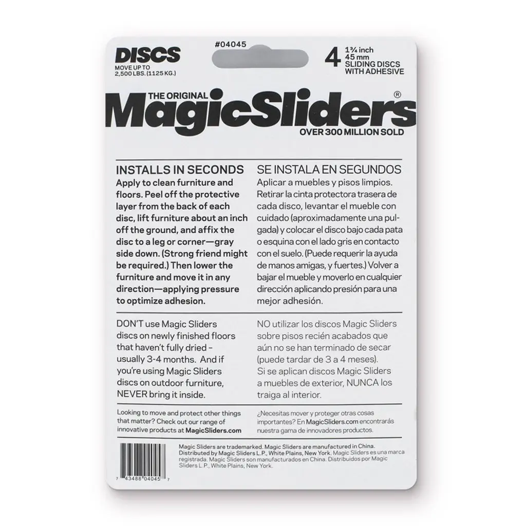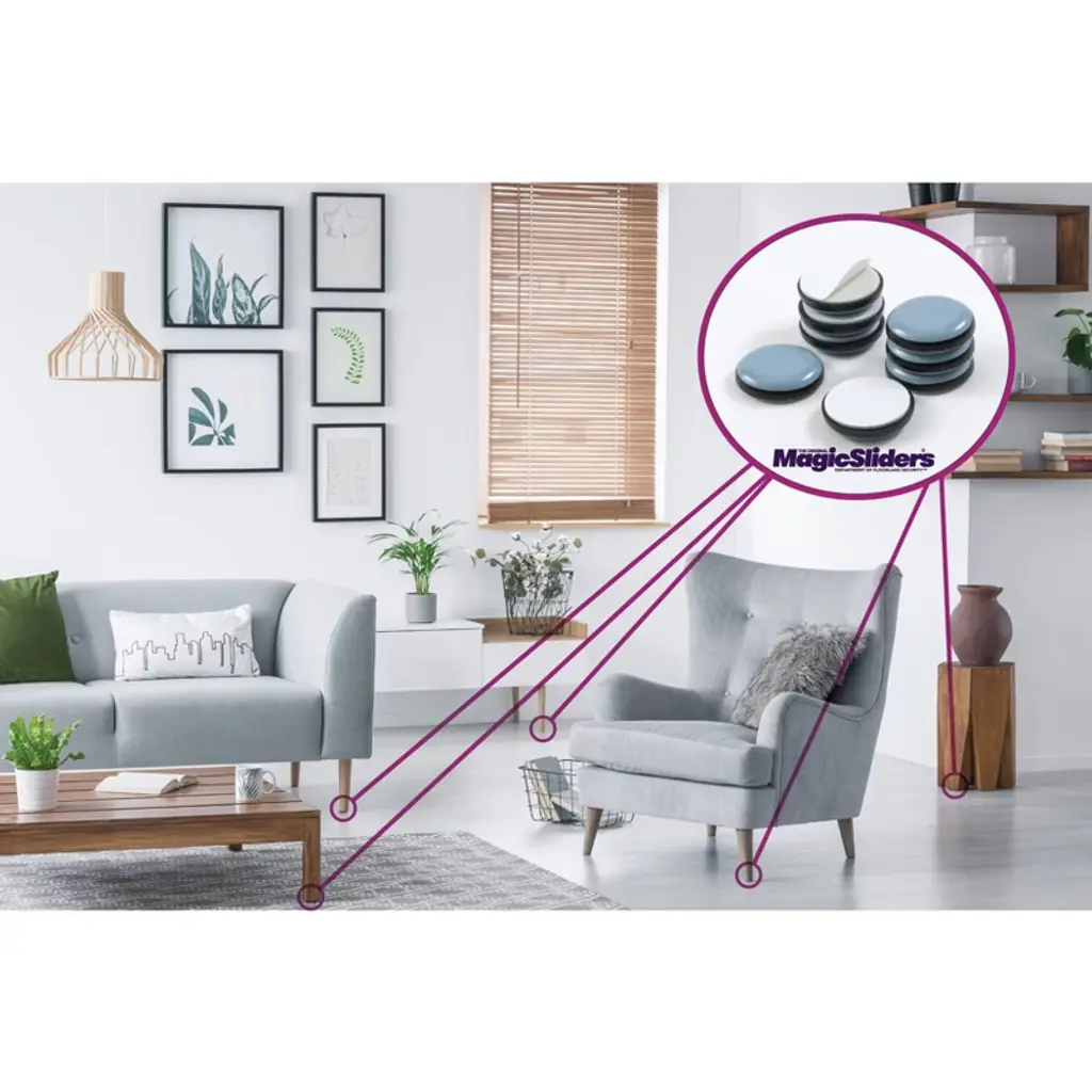 Magic Sliders are designed to protect your floors while making moving furniture effortless. They prevent scratches, dents, and scuff marks on hardwood, tile, laminate, vinyl, and even carpeted surfaces. Featuring an adhesive-backed design, installation is quick and tool-free—just peel and stick. Ideal for items without legs or with awkward shapes, they offer versatile application on chairs, sofas, tables, electronics, and décor, making them perfect for both home and office use. Magic Sliders reduce noise and vibration, eliminating squeaky furniture and the harsh sounds of dragging items. Built for long-lasting durability, they withstand heavy weights and high-traffic movement without losing their grip. Easily reposition furniture when redecorating or cleaning, and enjoy the convenience of one-person moves without the strain. Their low-profile, discreet design keeps them virtually invisible while providing powerful support. A perfect solution for renters, Magic Sliders help avoid floor damage fees by preventing marks and scratches. Each product includes double-sided adhesive tape for easy installation and features a proprietary high-tech polymer coating that eliminates friction, ensuring smooth gliding across all floor types.