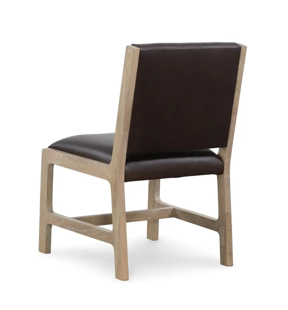 Cerused white oak dining chair with chocolate brown trapunto stitched leather seat back.