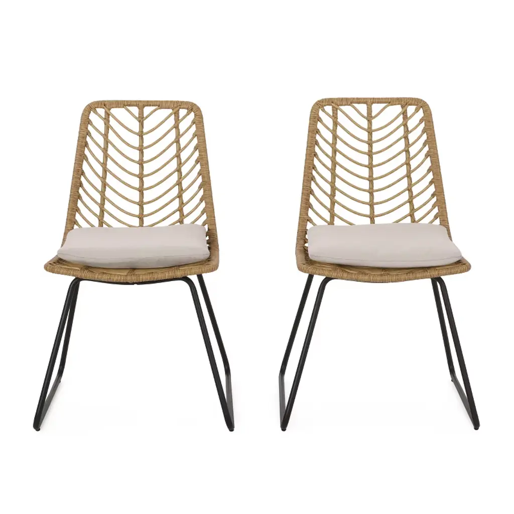 Elevate your outdoor space with this transitional-style rattan chair set, blending minimalist elegance with timeless appeal. Crafted from durable polyethylene rattan with handwoven details, these chairs offer both strength and style. The water-resistant cushions (not waterproof) ensure easy maintenance, while the included assembly tools make setup effortless. Sold as a set of two, each chair measures 20.5" W x 24.2" D x 33" H—perfect for patios, decks, or garden dining areas.