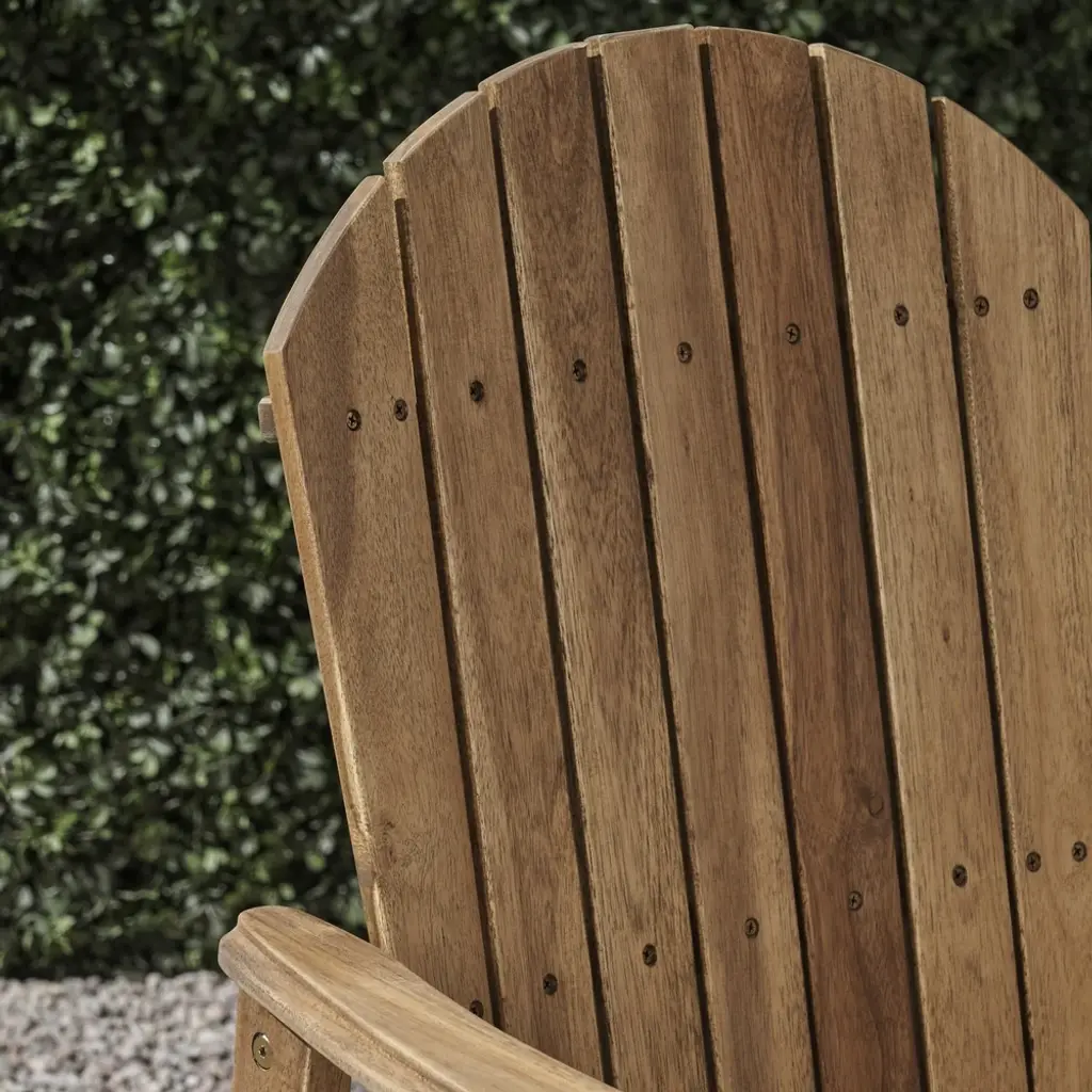 Bring extra style to your patio dining area with this set of two Adirondack-inspired dining chairs. Each chair is crafted from solid acacia wood for durability and style. The rounded, slat-back chars give a nod to the Adirondack style, while the slatted seats ensure optimal ventilation to diffuse body heat and allow for water drainage, adding extra practicality to this chic set.Features: Dimensions:
