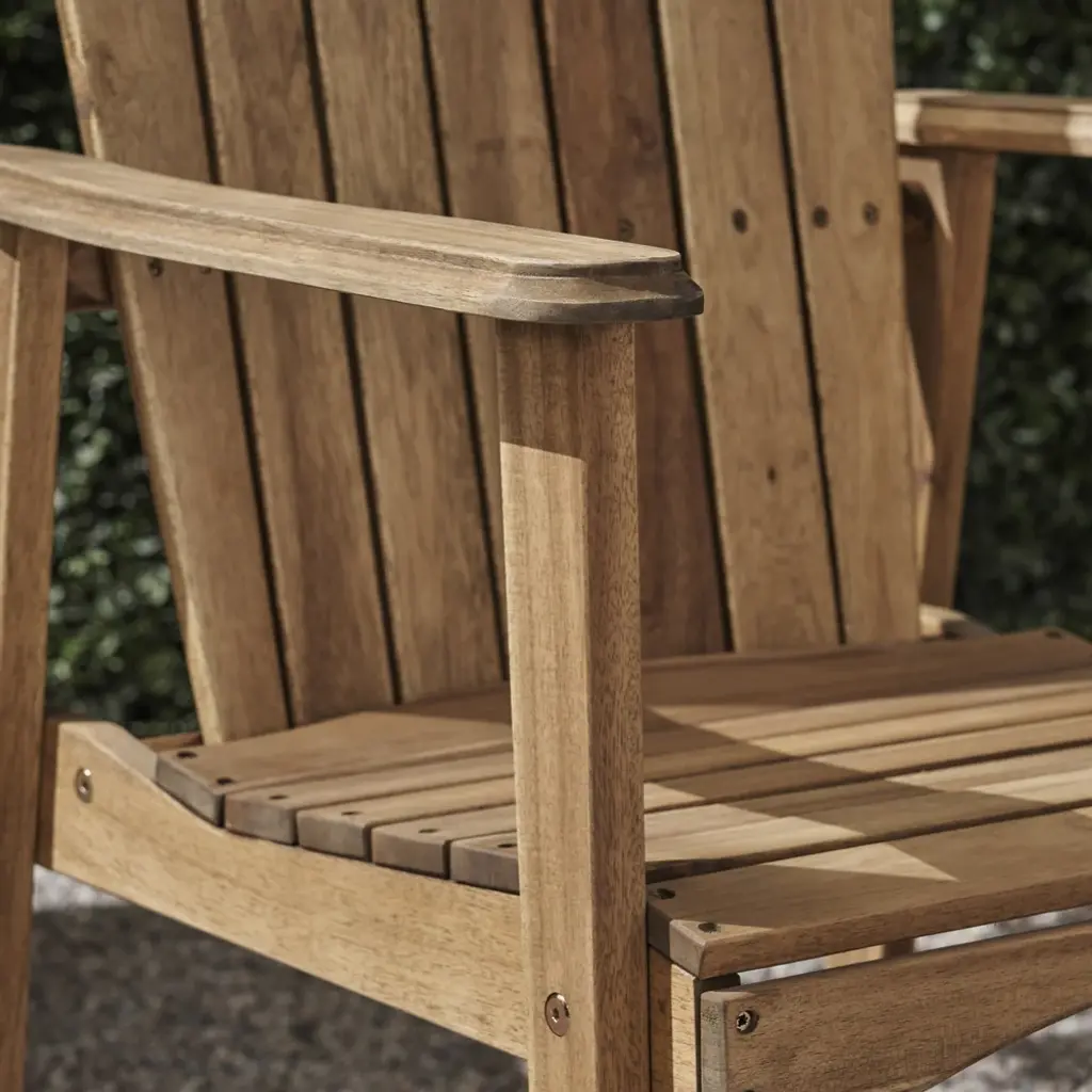 Bring extra style to your patio dining area with this set of two Adirondack-inspired dining chairs. Each chair is crafted from solid acacia wood for durability and style. The rounded, slat-back chars give a nod to the Adirondack style, while the slatted seats ensure optimal ventilation to diffuse body heat and allow for water drainage, adding extra practicality to this chic set.Features: Dimensions: