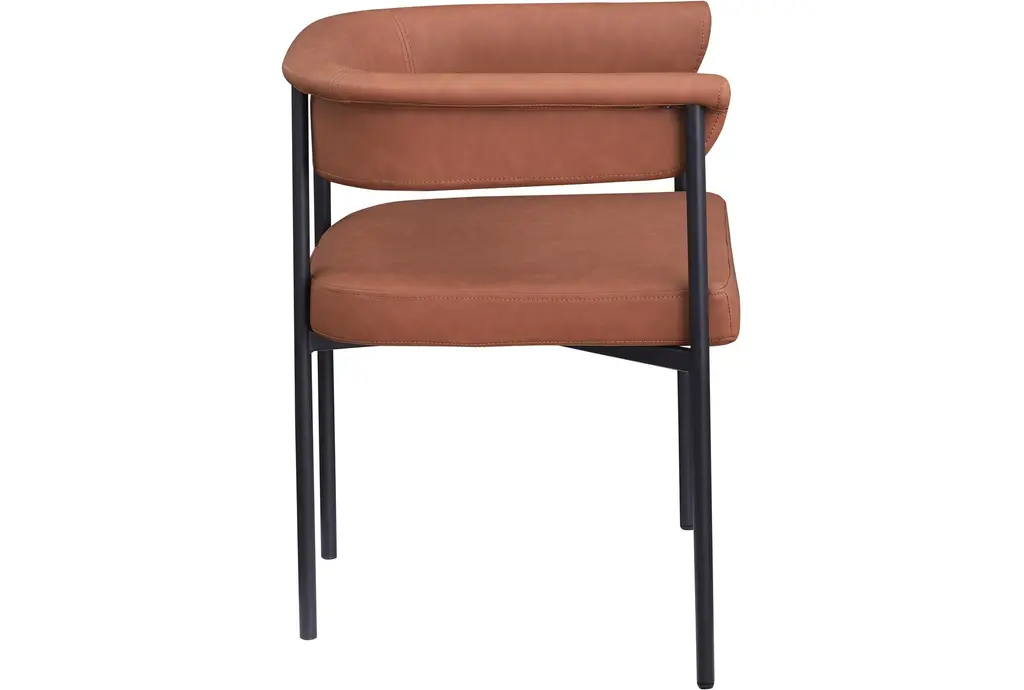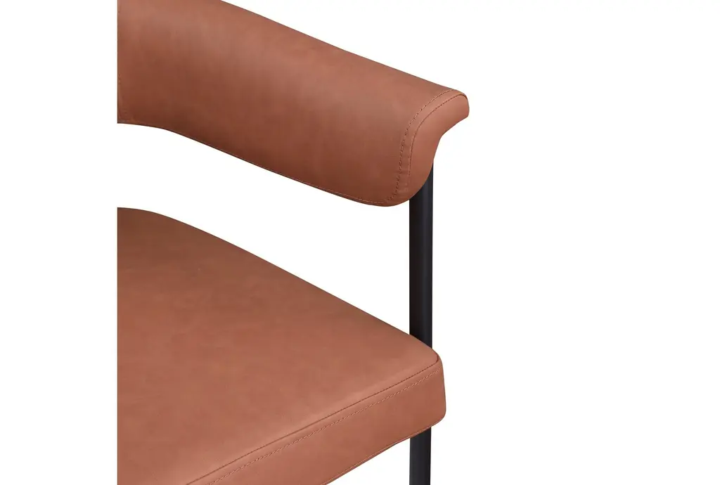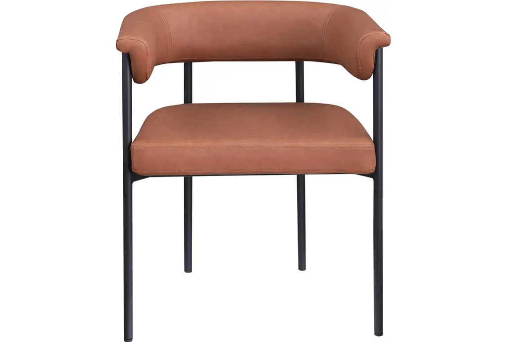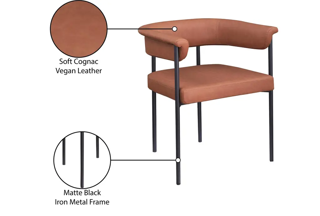 Malin Cognac Vegan Faux Leather Dining Chair With Matte Black Finish Set Of 2 pairs warm cognac upholstery with a modern, mid-century inspired silhouette to bring comfortable seating to your dining room. Each chair is upholstered in cognac vegan faux leather with sponge cushioning in the seat and back, and a matte black iron frame provides stable support with a light footprint. The curved, barrel-style back and recessed arm give ergonomic support for long meals while remaining compact enough for a kitchen or dinette nook.