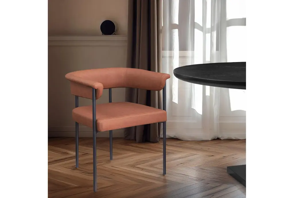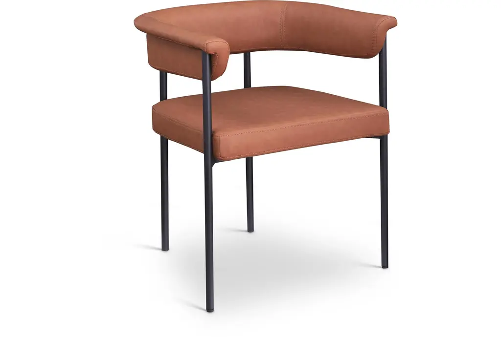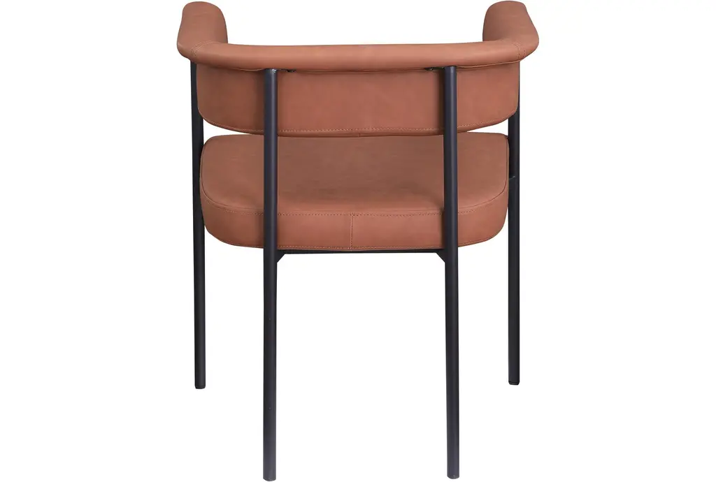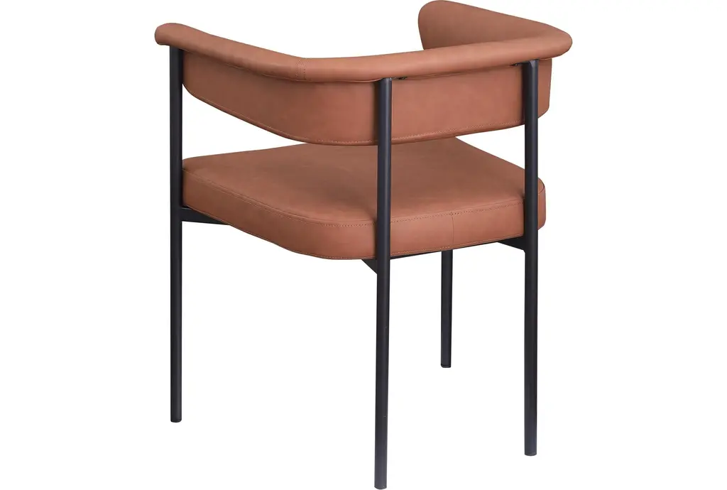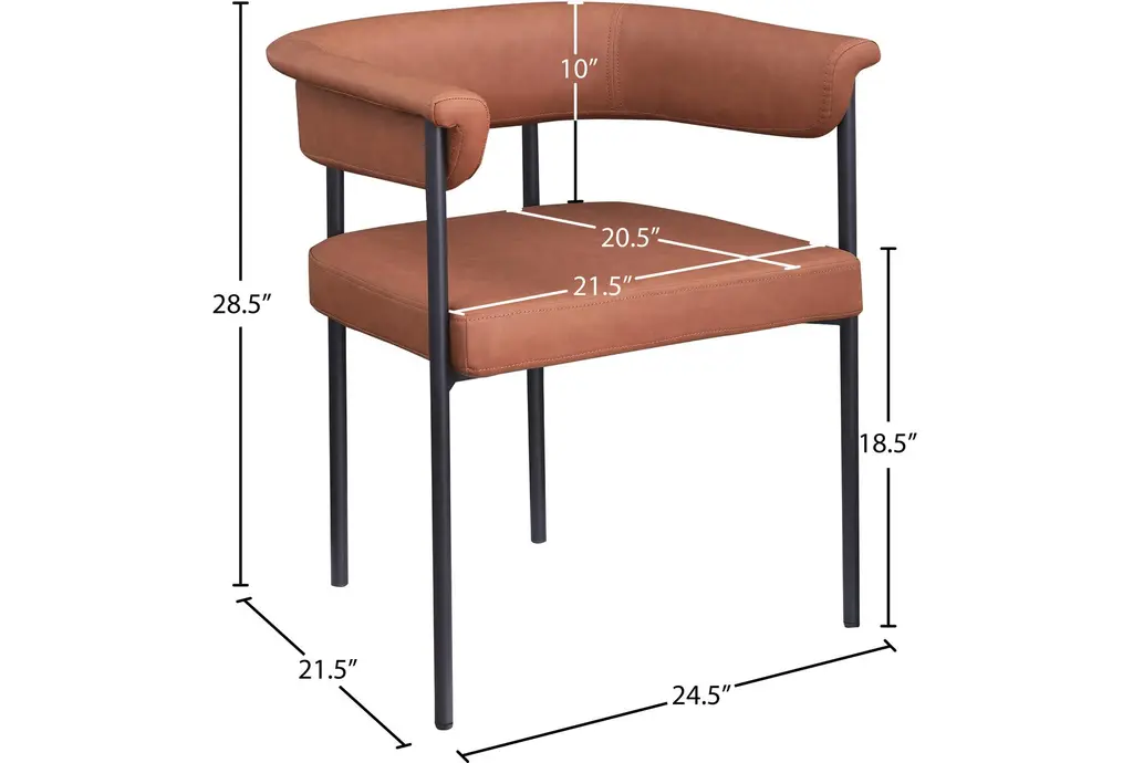 Malin Cognac Vegan Faux Leather Dining Chair With Matte Black Finish Set Of 2 pairs warm cognac upholstery with a modern, mid-century inspired silhouette to bring comfortable seating to your dining room. Each chair is upholstered in cognac vegan faux leather with sponge cushioning in the seat and back, and a matte black iron frame provides stable support with a light footprint. The curved, barrel-style back and recessed arm give ergonomic support for long meals while remaining compact enough for a kitchen or dinette nook.