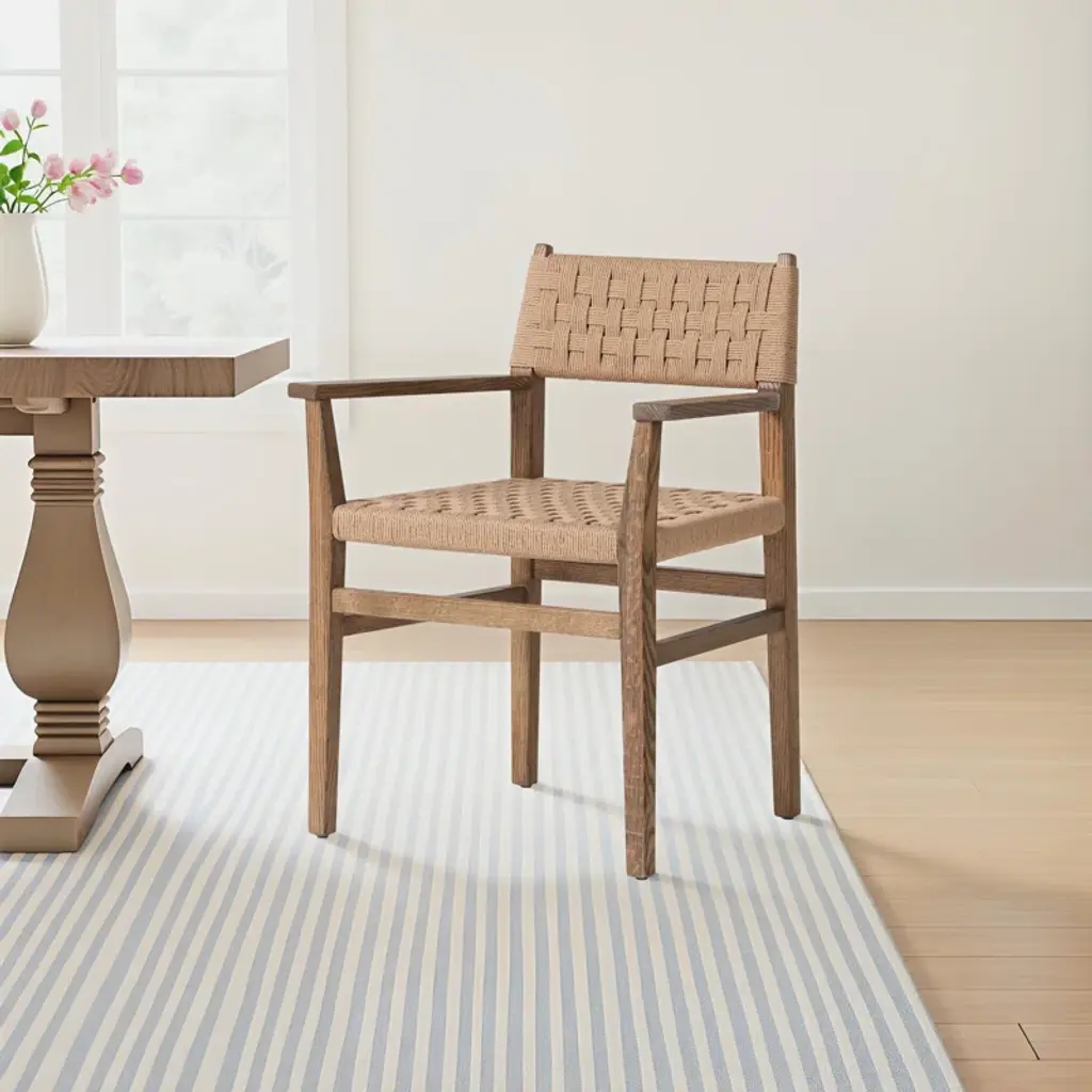 This armchair's tapered oak frame and updated woven back and seat create a study in texture and clean lines. The complementary pairing of natural wood and a muted cord pattern lends a neutral, approachable style.