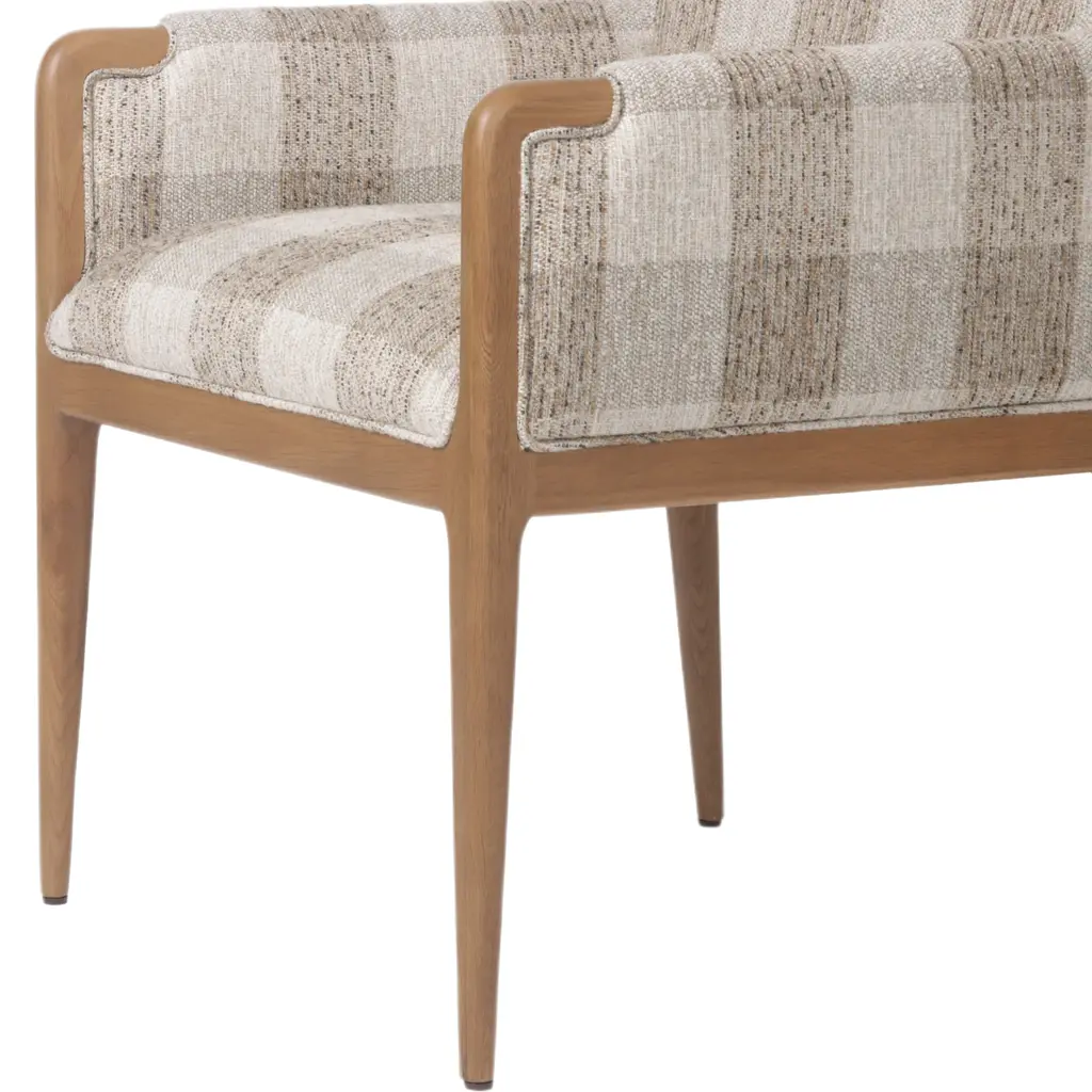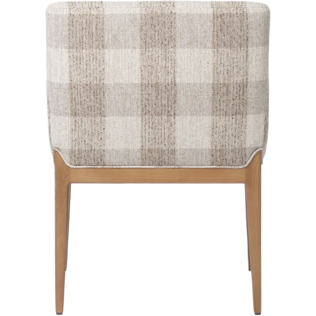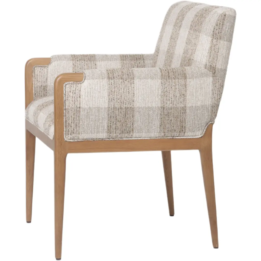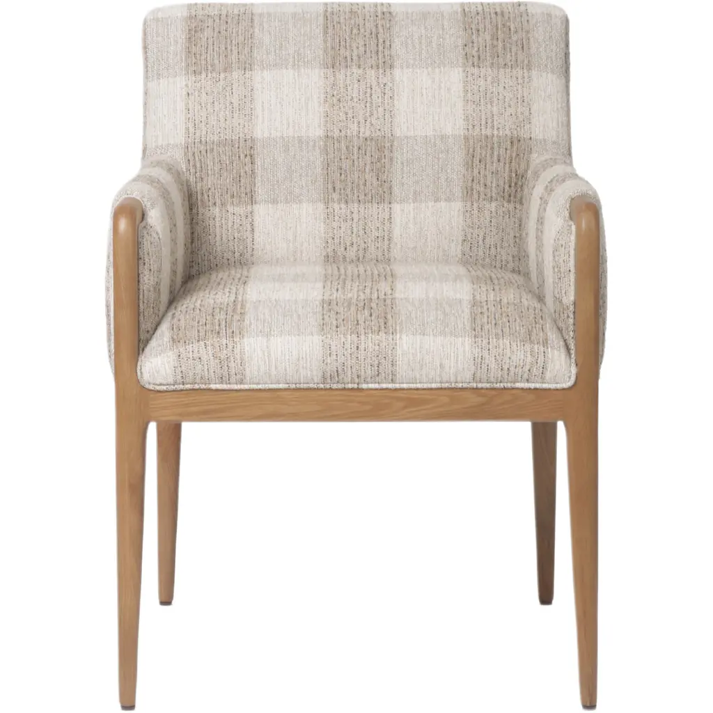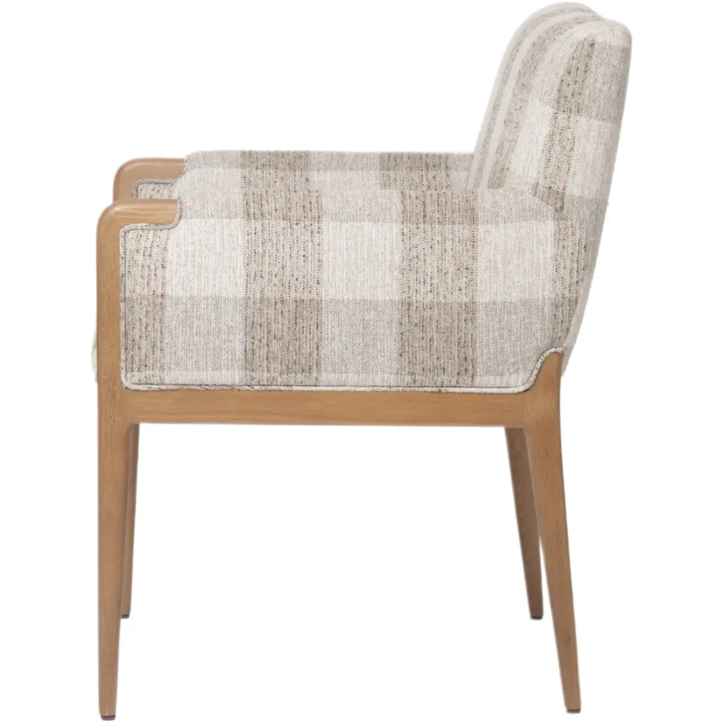 The Maplethorpe Dining Chair is a masterpiece of comfort and style. Its checkered-print upholstery is beautifully framed by light, warm oak, creating a harmonious blend of pattern and natural wood tones. The chair's boxy profile and higher arms make it an ideal choice for the head of the table, offering both support and a touch of elegance. This dining chair is designed to enhance any dining space with its sophisticated design and inviting comfort.
