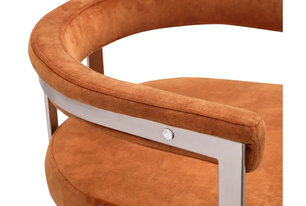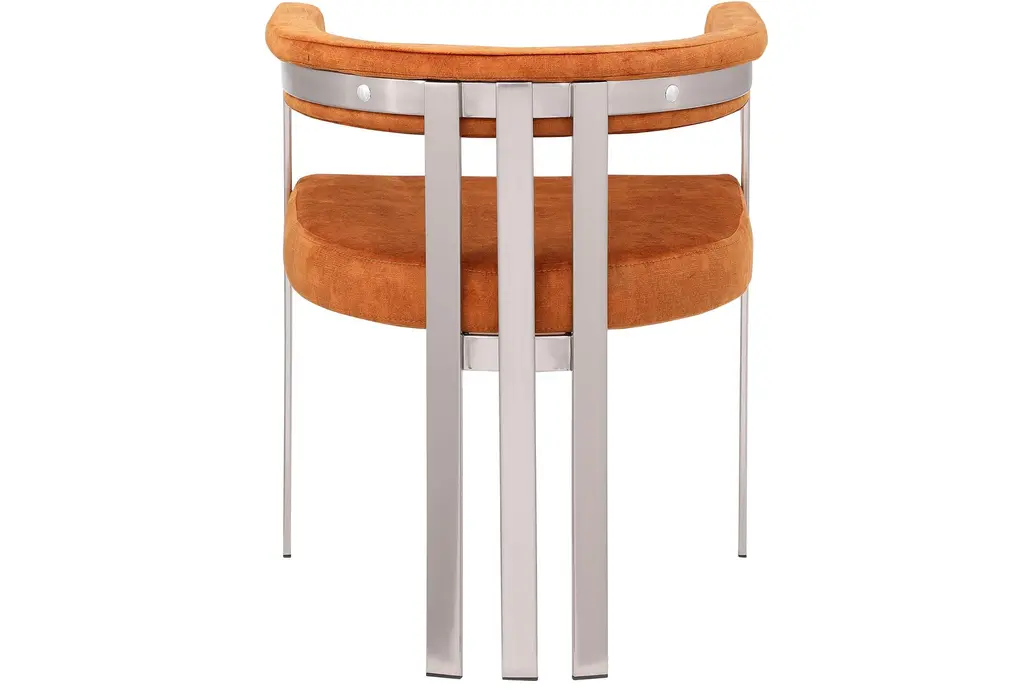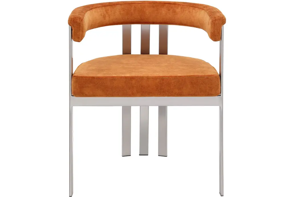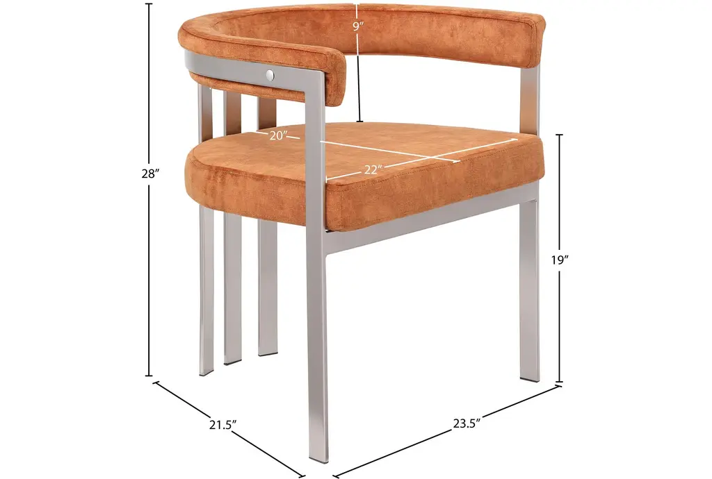 The Marcello Cognac Velvet Dining Chair with Brushed Silver Finish is a modern and stylish addition to any dining room. Its cognac velvet upholstery and brushed silver metal legs create a striking contrast that is both contemporary and timeless. The set of 2 chairs ensures you have matching seating for your dining area.