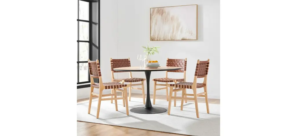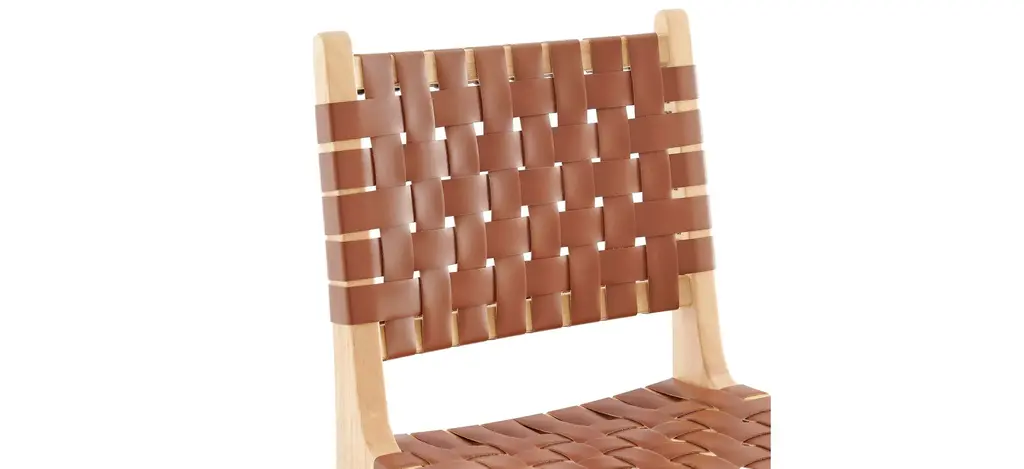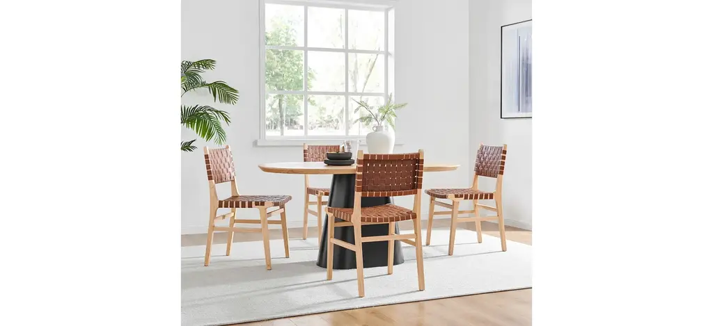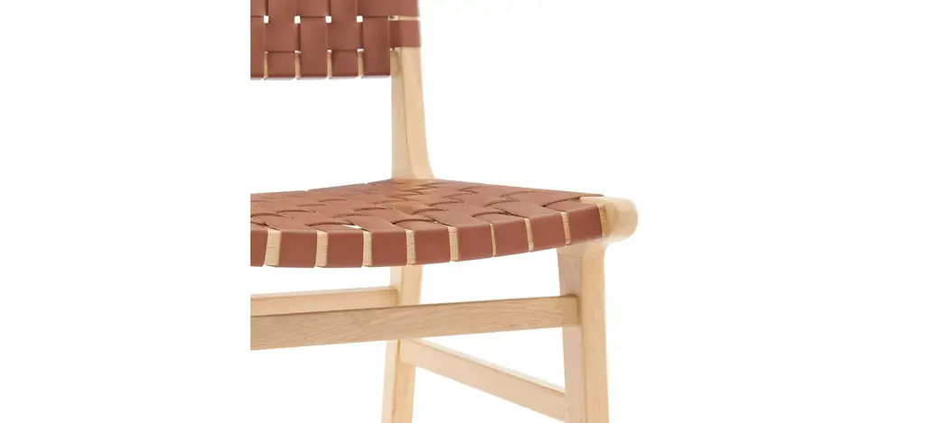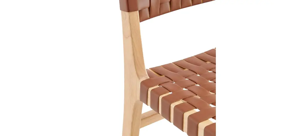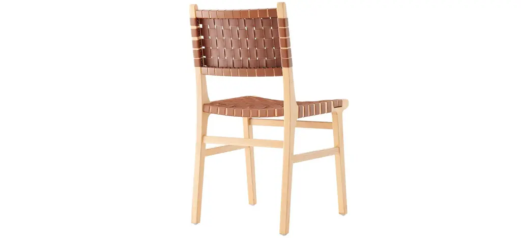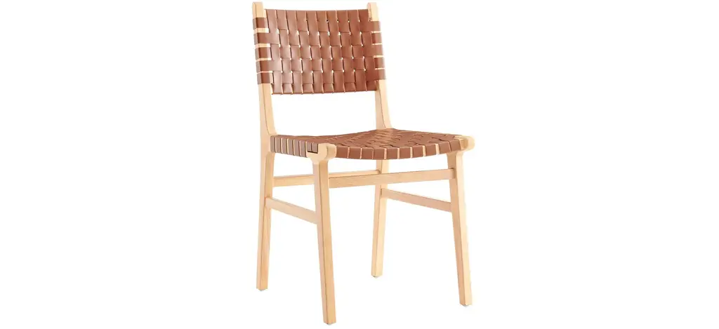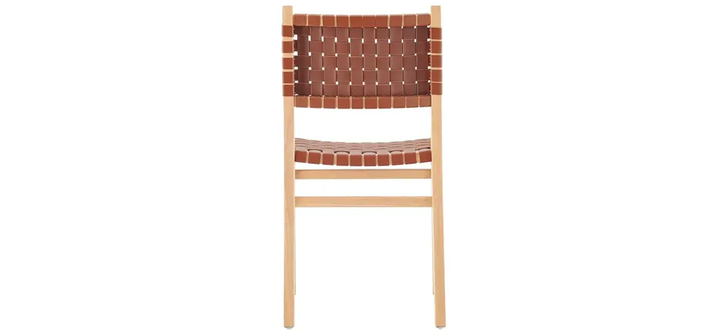 The Marco Dining Side Chair (Set of 2) is designed with soft edge frame and spacious seating area. The chair is refreshed with brown tone woven faux leather seat and natural solid wood legs, offering an upscale vibe with an understated appeal.