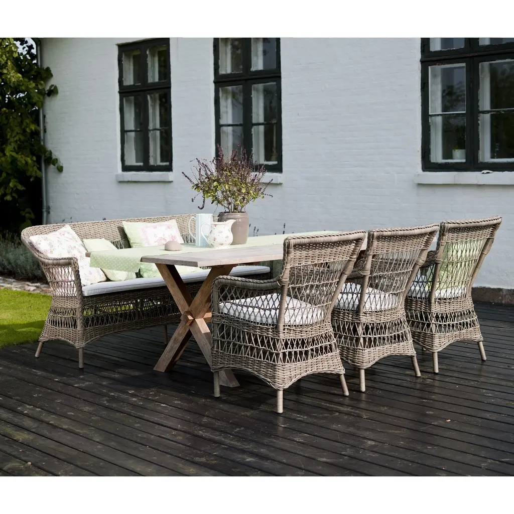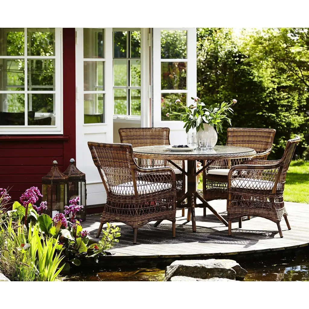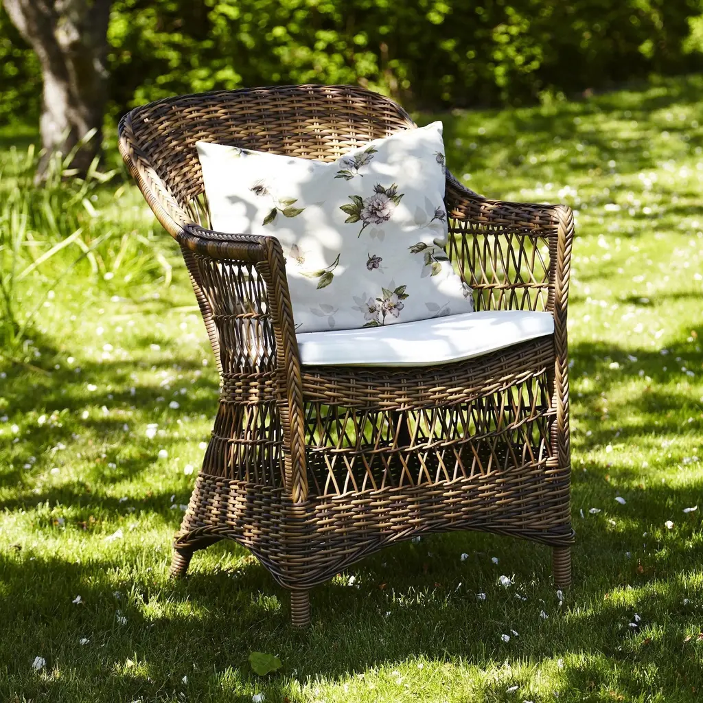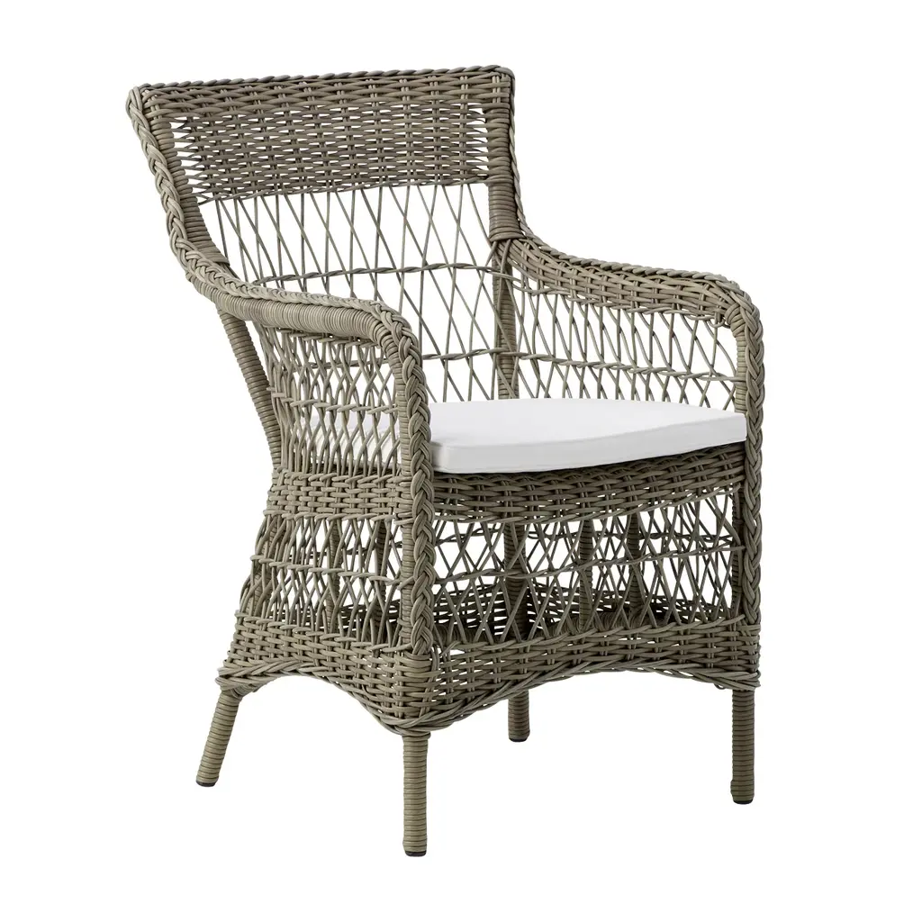 The Marie Arm Chair evokes casual elegance and indulgent comfort with a high back and choice of seat cushion. Made with ArtFibre woven on an aluminum frame, this ultra-durable piece is designed for outdoor use year-round. The Marie dining chairs ÐÊavailable with and without arms ÐÊare a perennial favorite for use in patios, verandas and gardens.