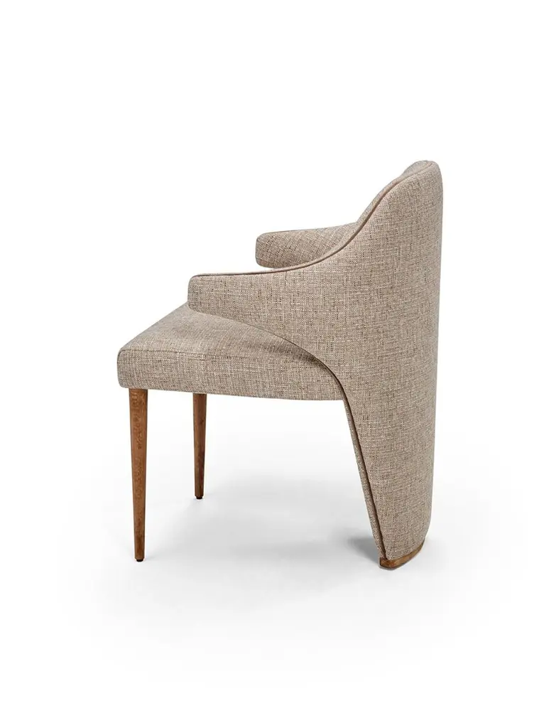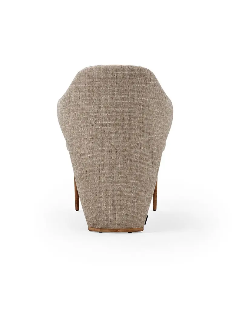 The welcoming shape of the revolutionary MARILYN chair was thought to envelop you in a deep sense of comfort. The bold design finds balance in the relaxing, immersive seating. Made with a solid wood structure, Marilyn features two solid wood front legs that can be finished in any lacquer or veneered wood colors. The back of the chair extends to the ground, in a tapered line that elevates this chair to the most exquisite design levels.Shown upholstered with Necessaires Melange 01 (Cat. B fabric) and Paris Taupe (Cat. A fabric), with matte walnut glazing legs.