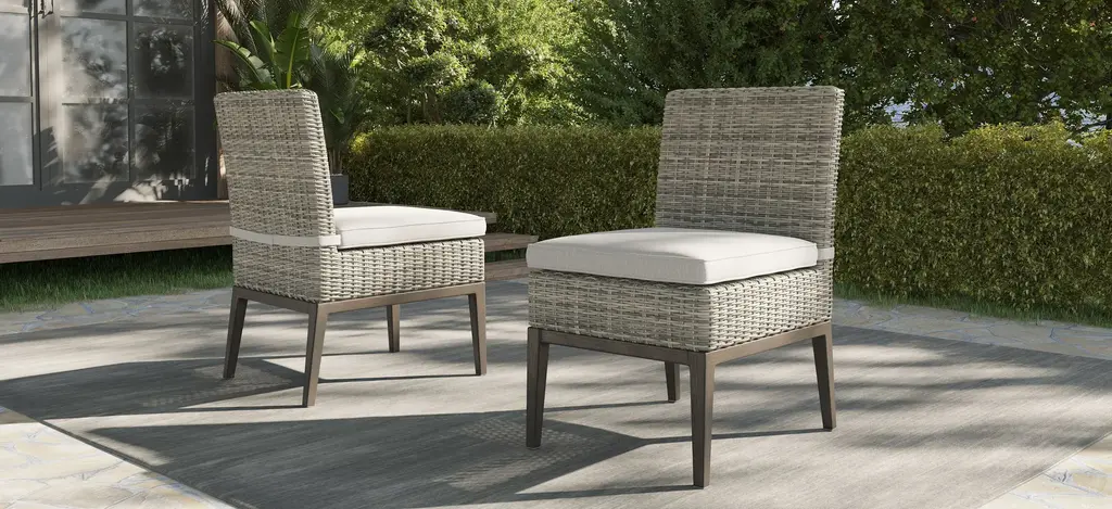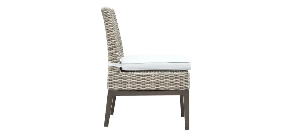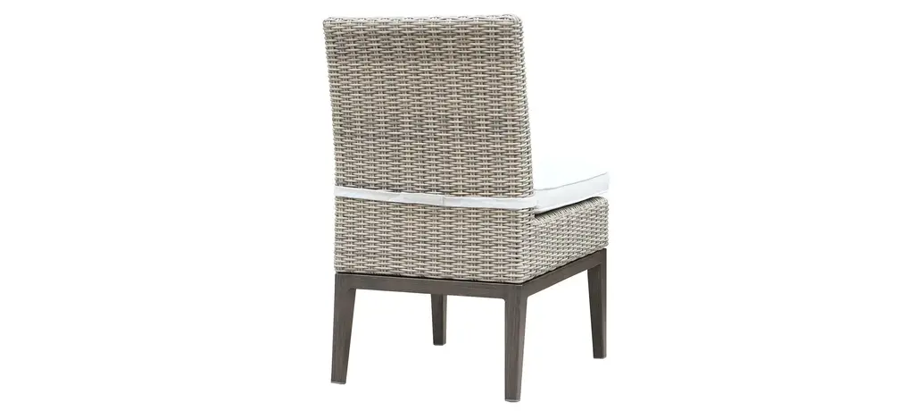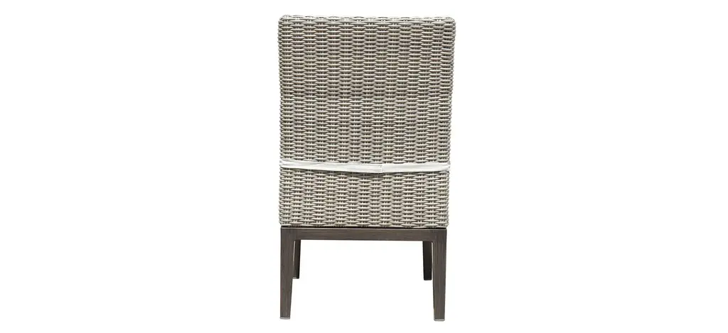 Marina hand-woven Single Side Chair. All-weather resin and solution-dyed acrylic cover make this chair weather and fade-resistant to withstand whatever the elements dish out. The powder-coated aluminum base is naturally rust-resistant so you can relax. The two-tone driftwood finish is neutral with a small punch of color and the chair is just the right scale and pitch to be perfectly comfortable. Use as a standalone chair or pair with the Marina dining collection for a complete outdoor dining set.