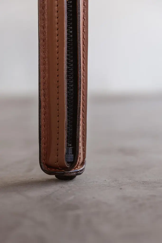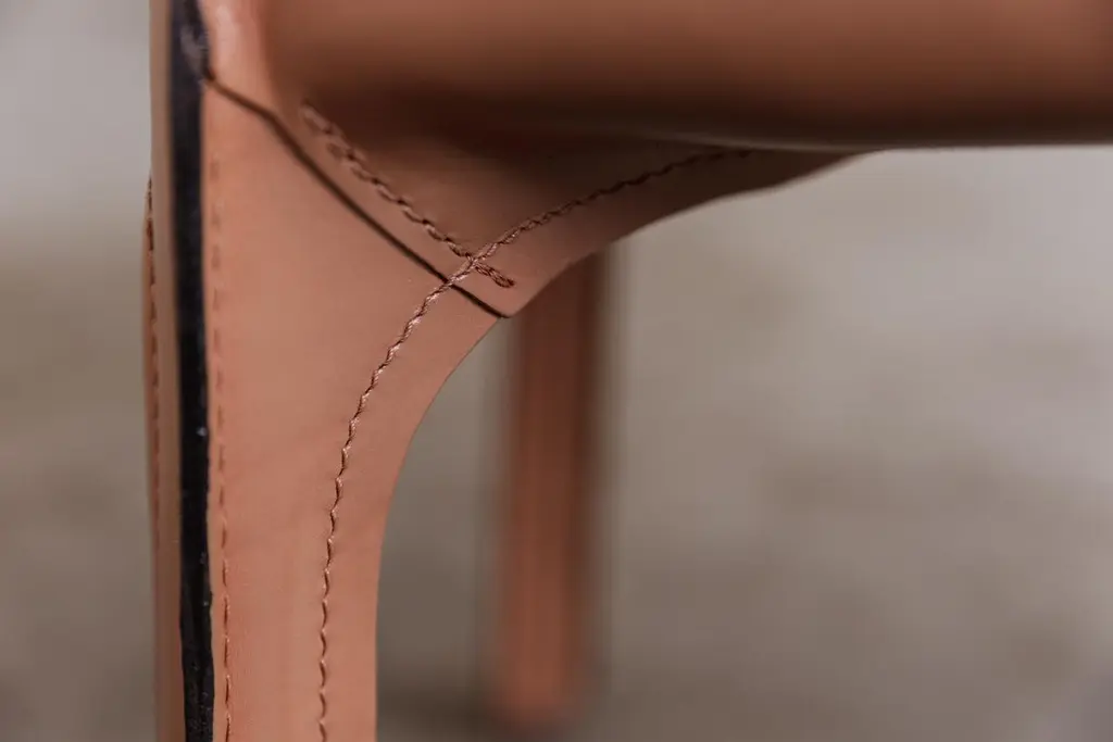 Mario Bellini "CAB 413" dining chair for Cassina, hazelnut leather, Italy, 1977The "CAB" is the world's first free-standing cowhide design chair, informed by the relationship between the skeleton and the skin; an authentic example of production excellence that requires multiple stages of artisan craftsmanship to create a trendy tailored-to-fit object. The "CAB" are high-quality chairs with hand-stitched natural leather upholstery wrapped over an internal steel frame. The only additional reinforcement is provided by a rubber membrane plate that supports the seat. Bellini's innovation lay in using zips to fasten the leather cover to its frame; a zip runs up the inside of each leg, sealing the cover. Our atelier carefully restored and refinished the chairs. Additional chairs are available on request. Please send a message for more information.Our atelier carefully restored and refinished the chairs.