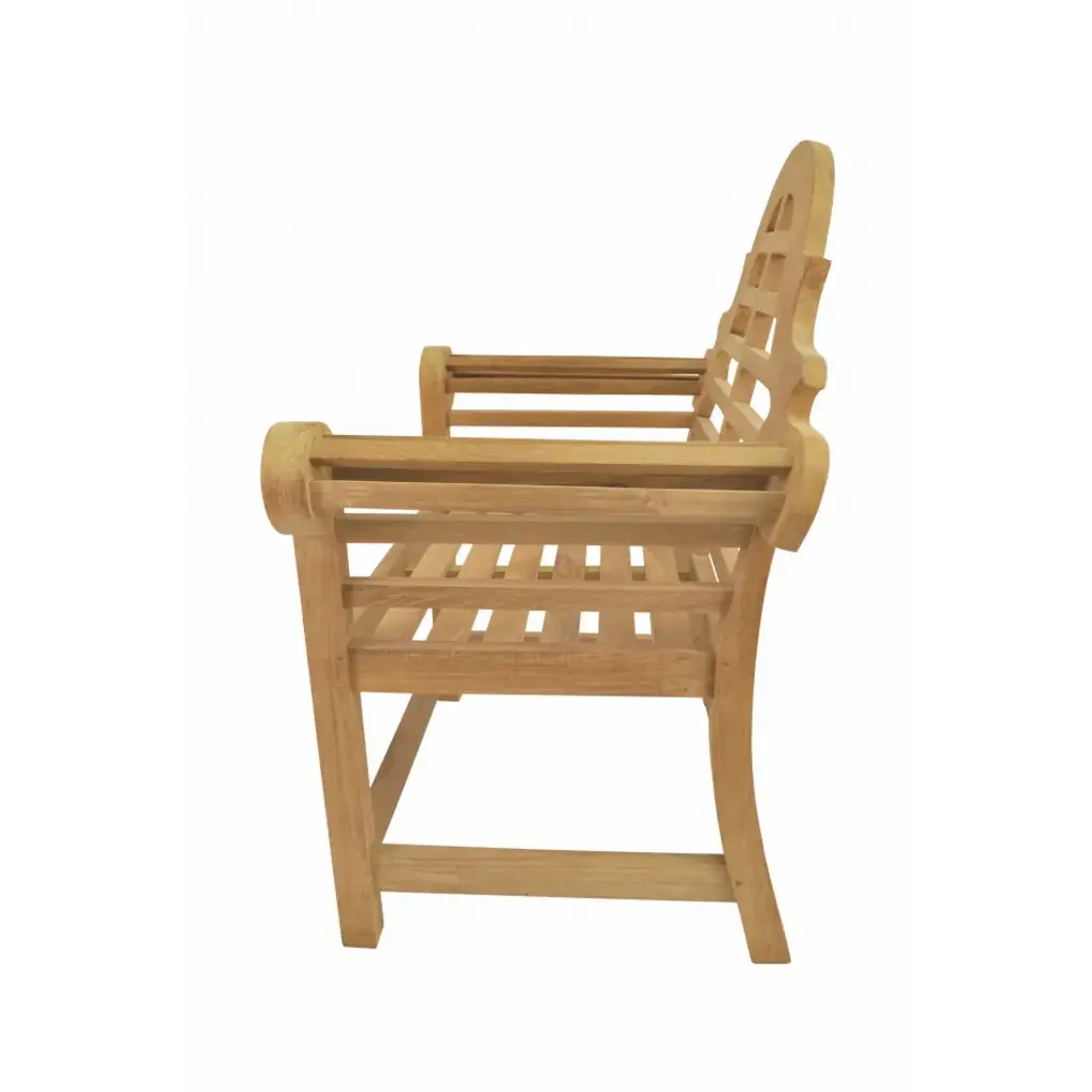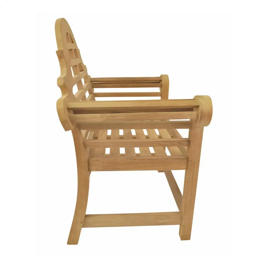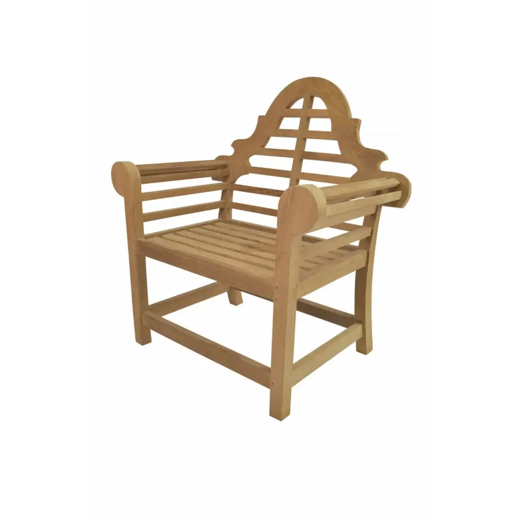 The Marlborough Dining Armchair is a timeless classic faithfully reproduced from the designs of Sir Edwin Lutyens, one of Britain’s most noted architects. The sloping arches and fully scrolled arms are designed to complement and enhance its natural surroundings at any time of the year. Through rain, hail or shine the Marlborough Dining Armchair made of premium grade unfinished teak will embrace any location and impress all who behold it. We have made subtle but careful design changes to ensure excellent back support. Place a single bench or chair under your trees; use a group of benches and chairs for entertaining. Made from premium Grade-A Teak wood sanded smooth without any finish in its natural color and form.