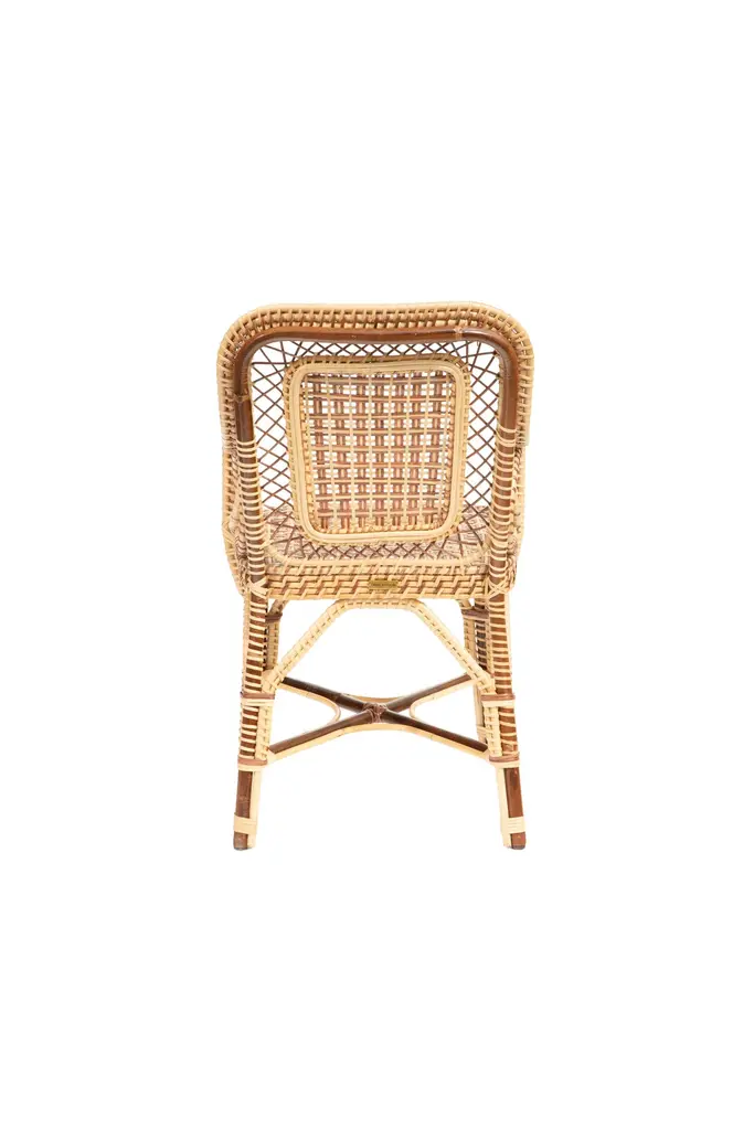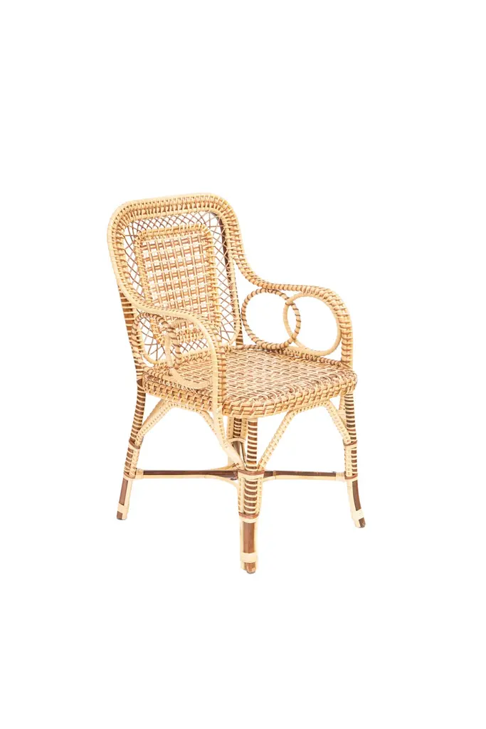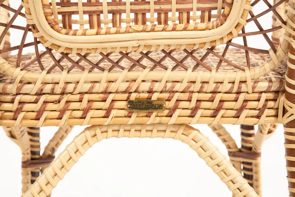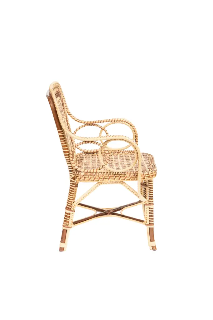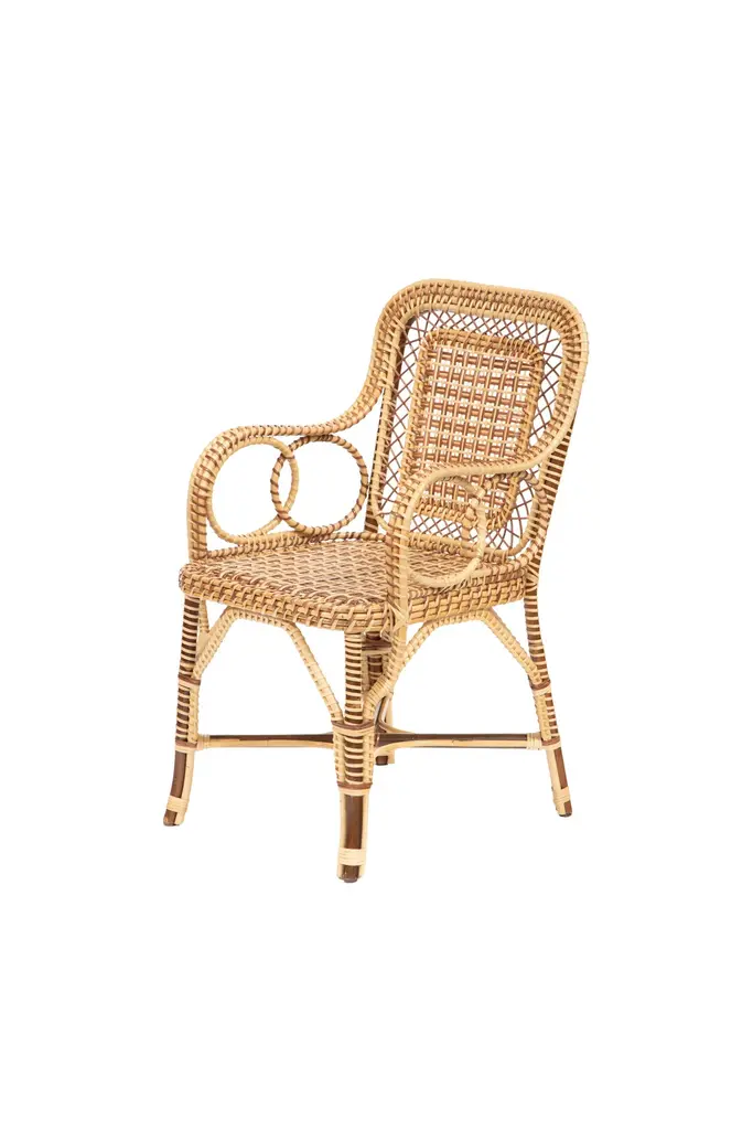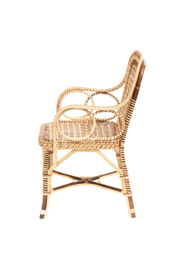 Marshan rattan armchair by Creel and Gow, in brown: Measures: 22" x 21" x 37" H- Seat Height: 18"Introducing Creel and Gow's exclusive wicker and rattan collection, designed by Marco Scarani. We're proud to offer our customers these revised vintage rattan furniture pieces that have been skillfully crafted in collaboration with an atelier in Morocco.Our partnership with the atelier has been ongoing for several years and has resulted in a collection of rattan furniture that is both timeless and elegant. The atelier's skilled artisans have a deep understanding of traditional weaving techniques and use only the finest materials to create each piece.Marco Scarani's designs for this collection combine the classic appeal of vintage rattan with modern sensibilities, resulting in pieces that are both stylish and functional. The collection includes chairs, sofas, and tables that are perfect for any living space, whether it's a cozy corner or a larger lounge area.The Creel and Gow wicker and rattan collection is designed to bring a touch of timeless elegance to any home or commercial space. The pieces are versatile and work well with a range of decor styles, from traditional to contemporary. Moreover, the collection is perfect for those who appreciate the quality of handmade furniture and the unique character that each piece possesses.