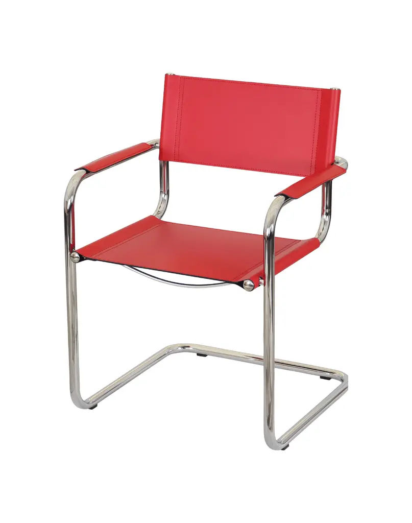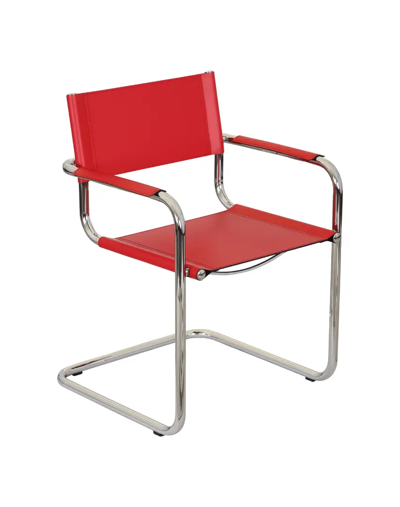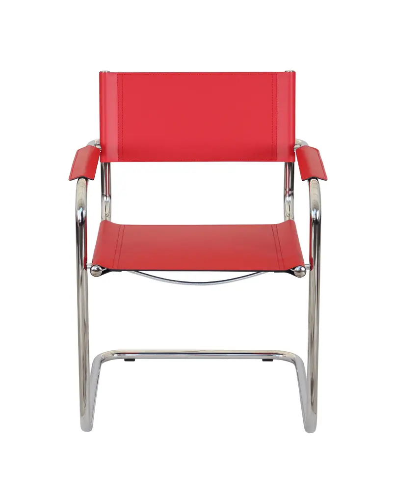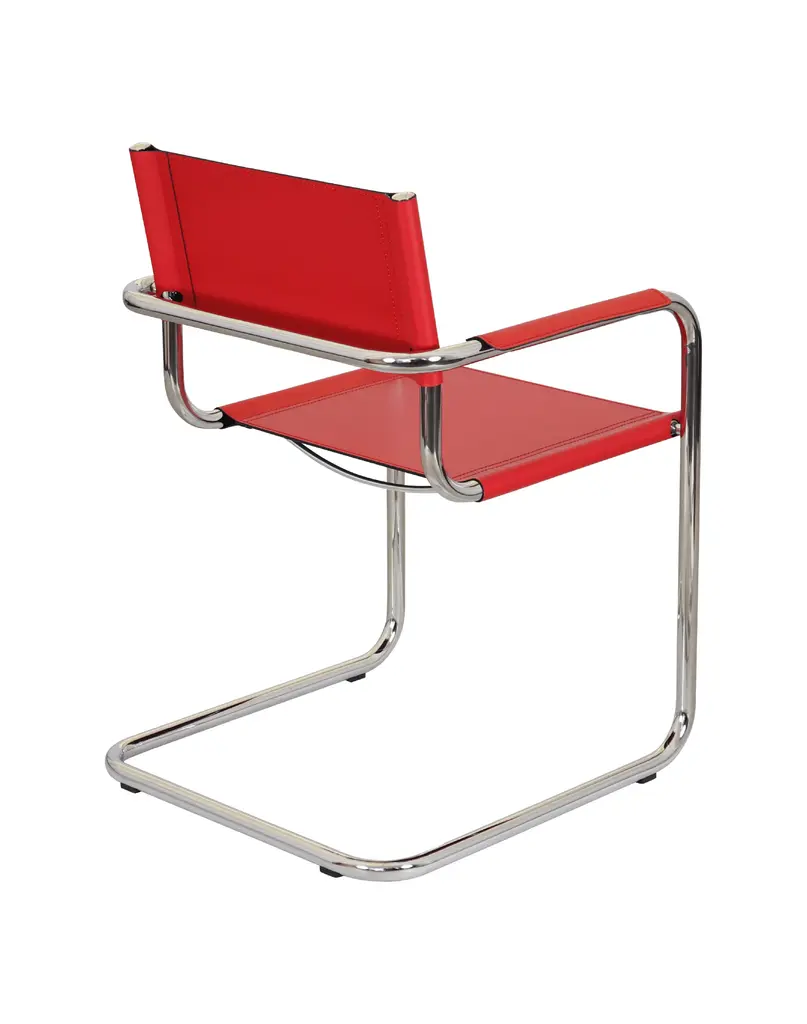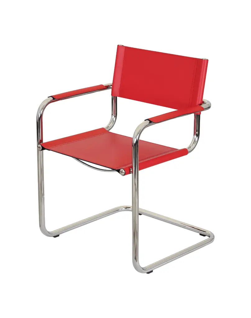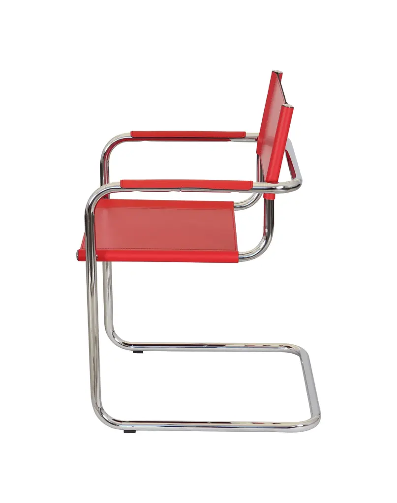 Experience the epitome of classic Bauhaus design with our Mart Stam Bonded (Regenerated) Leather Cantilever Armchairs, imported from Italy.These chairs feature a sleek chrome-plated tubular steel frame and bonded (regenerated) leather seats and backs, available in 8 (eight) stunning colors: Black, Blue, Camel, Creme, Red, Dark Red, Gray, White.Designed for both comfort and style, each armchair includes plastic snap-on glides for easy movement and a one-year limited warranty. With a 250 lbs. weight capacity, these armchairs are perfect for adding a touch of timeless elegance to any space!Material: Bonded LeatherCasual or Formal: CasualChair Features: Arm PadsQuantity: IndividualAccent Chair Type: ArmchairChair Back Type: OpenStyle: Bauhaus; Mid-Century ModernRecommended Use: Indoor; Residential; Kitchen; Dining RoomCommercial Use: NoFrame Material: Tubular SteelFrame Finish: ChromeSeat Material: Bonded (Regenerated) LeatherBack Material: Bonded (Regenerated) LeatherLeather Color: RedOverall Dimensions (W x D x H): 22.5" x 23" x 31"Seat Width: 18.7"Seat Depth: 14.7"Seat Height: 17"Back Height: 14.5"Arms: YesBackrest Leather Strip Height: 8.5"Arm Height (from seat): 7.5"Weight Capacity: 250 lbs.Outer Arm Width (between outer edges): 22.5"Inner Arm Width (between inner edges): 18.1"Item Weight: 15.6 lbs.Country of Origin: ItalyHardware Included: 4 (four) Phillips screws (to attach the arms)Additional Tools Required: Phillips Screwdriver (NOT included)Estimated Assembly Time: 2 (two) minutesAssembly Advisory: 2 (two) Person Assembly AdvisedCare Instructions: Keep away from direct sunlight. Wipe with a damp cloth and mild soap, avoiding harsh chemicals.Warranty Details: 1 (one) year Limited Warranty: covers any defects in materials or workmanship under normal use. However, please note that damage to the leather parts caused by exceeding the weight capacity of 250 lbs. is not covered under the warranty.