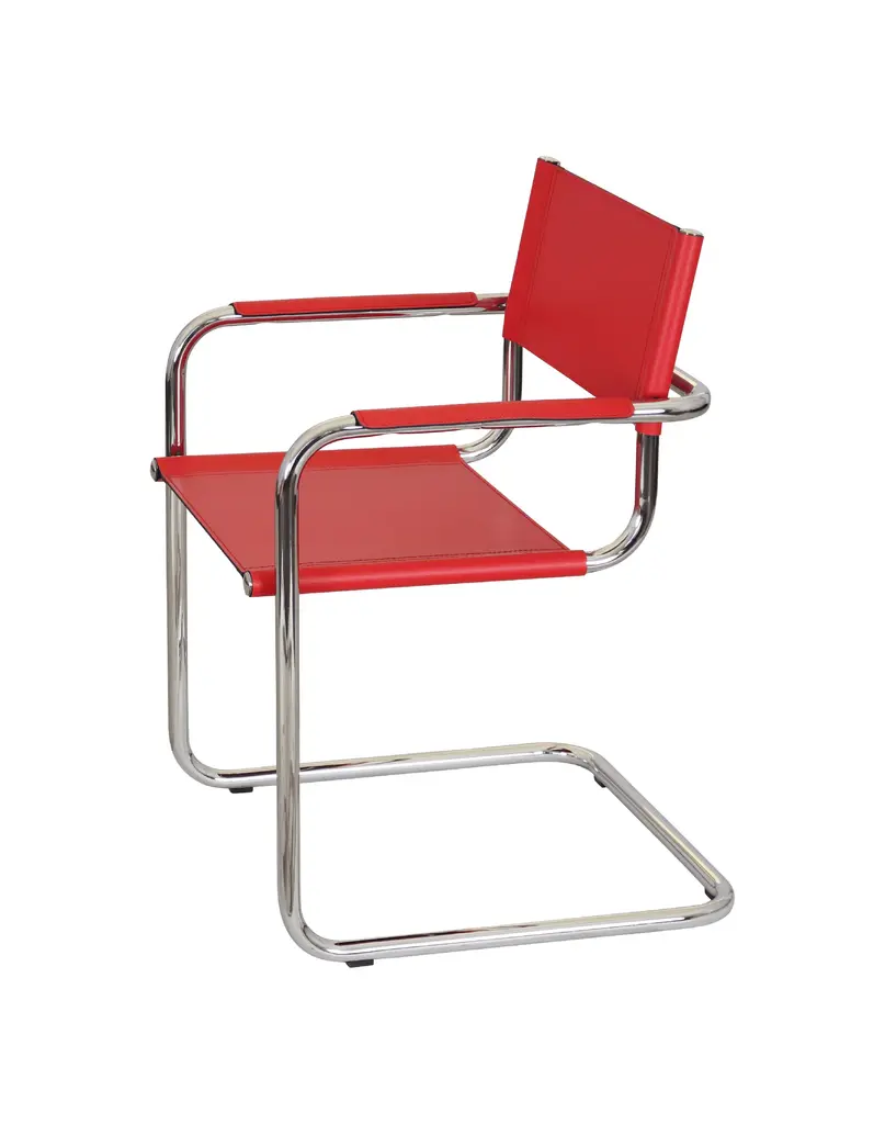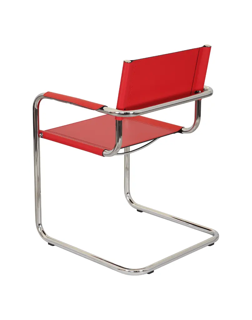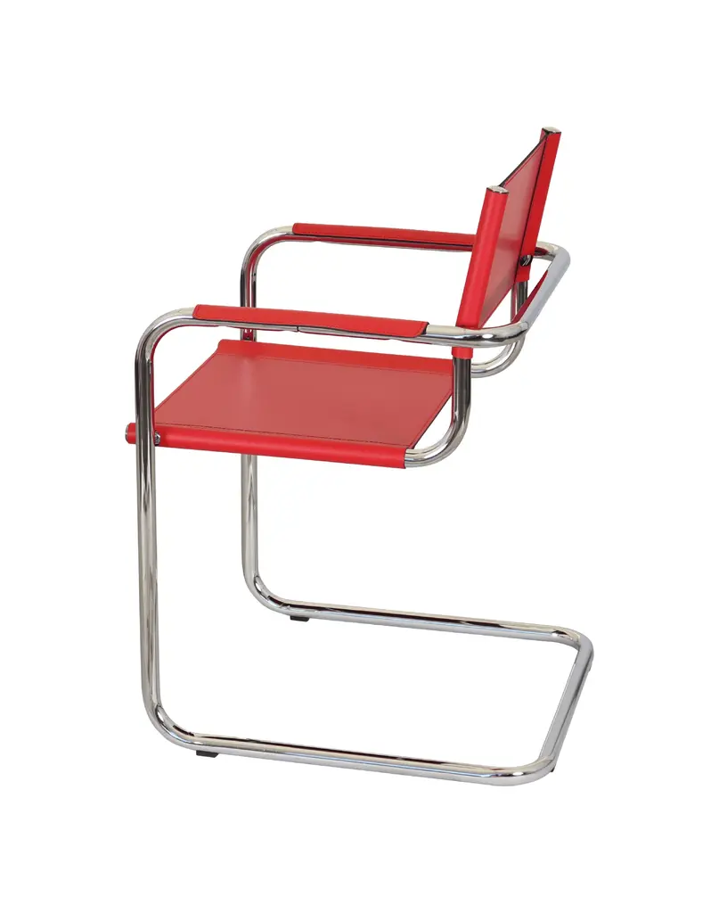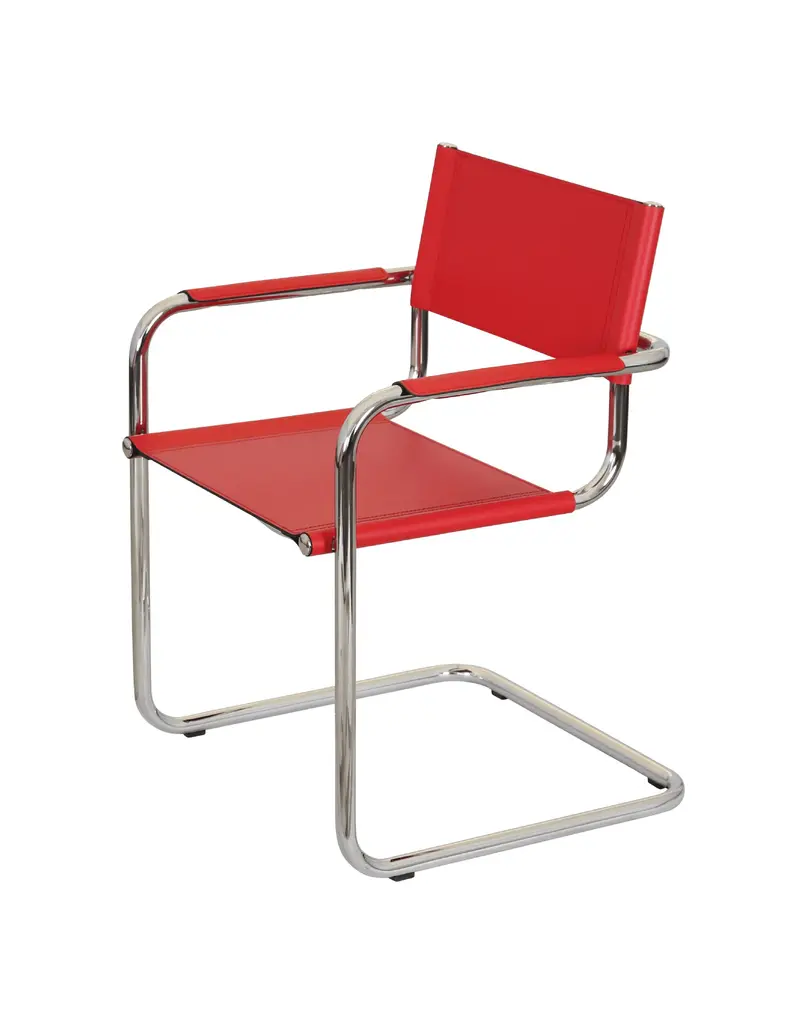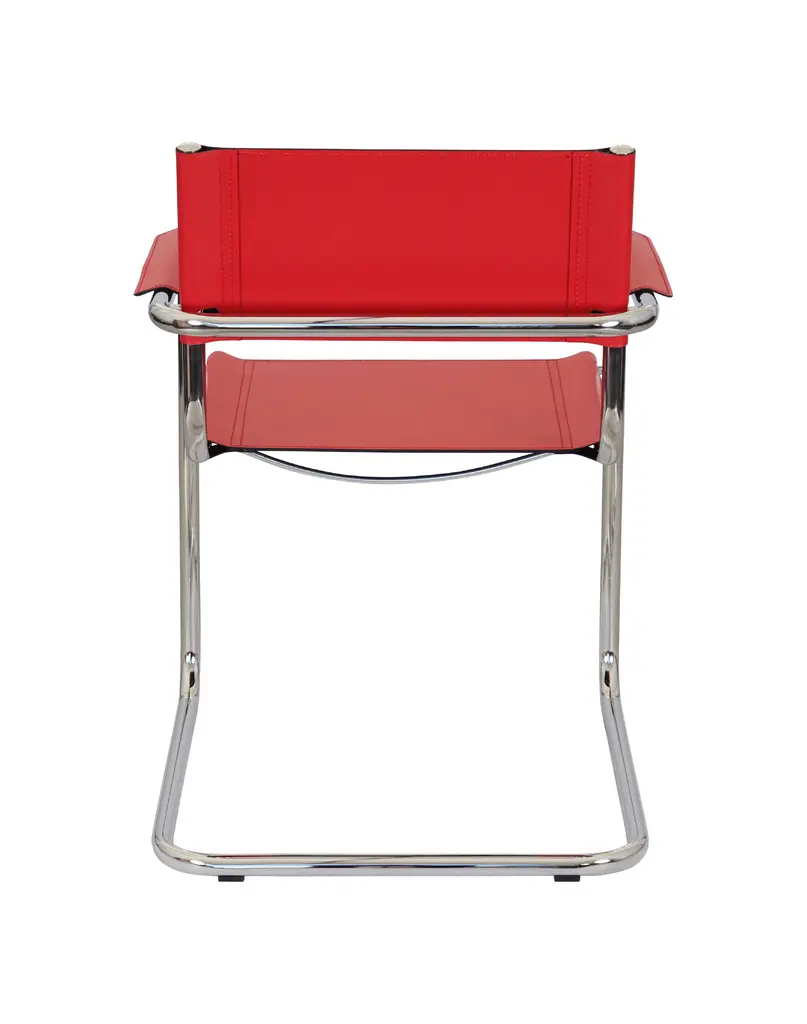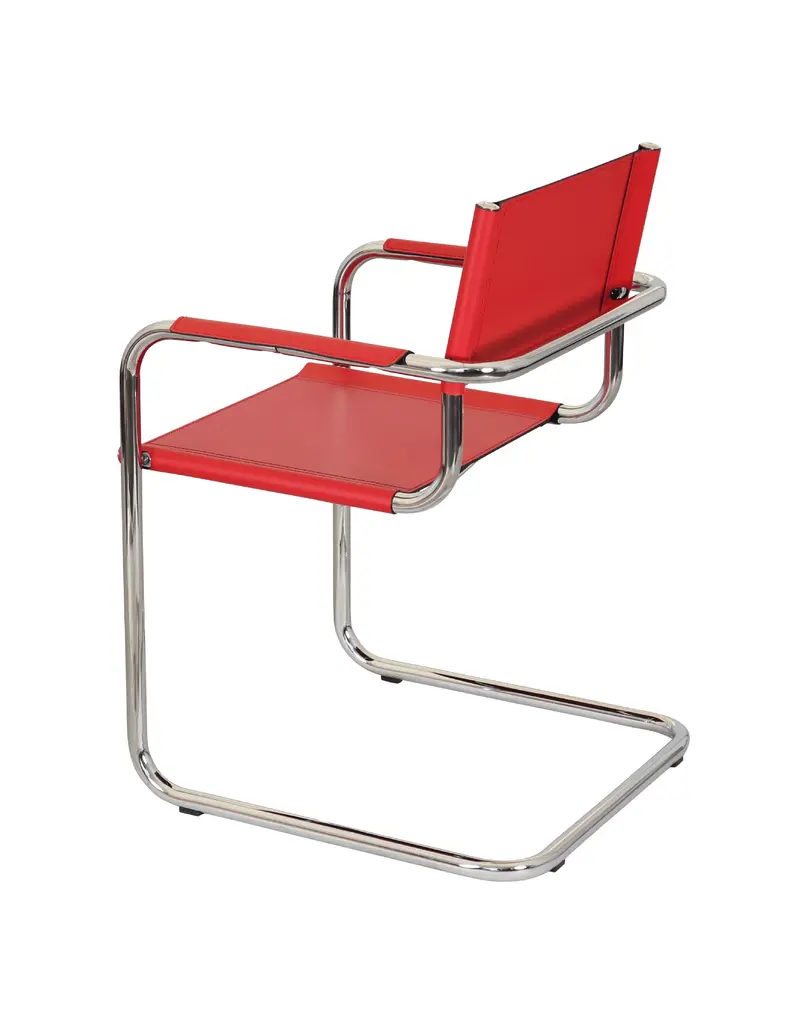 Experience the epitome of classic Bauhaus design with our Mart Stam Bonded (Regenerated) Leather Cantilever Armchairs, imported from Italy.These chairs feature a sleek chrome-plated tubular steel frame and bonded (regenerated) leather seats and backs, available in 8 (eight) stunning colors: Black, Blue, Camel, Creme, Red, Dark Red, Gray, White.Designed for both comfort and style, each armchair includes plastic snap-on glides for easy movement and a one-year limited warranty. With a 250 lbs. weight capacity, these armchairs are perfect for adding a touch of timeless elegance to any space!Material: Bonded LeatherCasual or Formal: CasualChair Features: Arm PadsQuantity: IndividualAccent Chair Type: ArmchairChair Back Type: OpenStyle: Bauhaus; Mid-Century ModernRecommended Use: Indoor; Residential; Kitchen; Dining RoomCommercial Use: NoFrame Material: Tubular SteelFrame Finish: ChromeSeat Material: Bonded (Regenerated) LeatherBack Material: Bonded (Regenerated) LeatherLeather Color: RedOverall Dimensions (W x D x H): 22.5" x 23" x 31"Seat Width: 18.7"Seat Depth: 14.7"Seat Height: 17"Back Height: 14.5"Arms: YesBackrest Leather Strip Height: 8.5"Arm Height (from seat): 7.5"Weight Capacity: 250 lbs.Outer Arm Width (between outer edges): 22.5"Inner Arm Width (between inner edges): 18.1"Item Weight: 15.6 lbs.Country of Origin: ItalyHardware Included: 4 (four) Phillips screws (to attach the arms)Additional Tools Required: Phillips Screwdriver (NOT included)Estimated Assembly Time: 2 (two) minutesAssembly Advisory: 2 (two) Person Assembly AdvisedCare Instructions: Keep away from direct sunlight. Wipe with a damp cloth and mild soap, avoiding harsh chemicals.Warranty Details: 1 (one) year Limited Warranty: covers any defects in materials or workmanship under normal use. However, please note that damage to the leather parts caused by exceeding the weight capacity of 250 lbs. is not covered under the warranty.