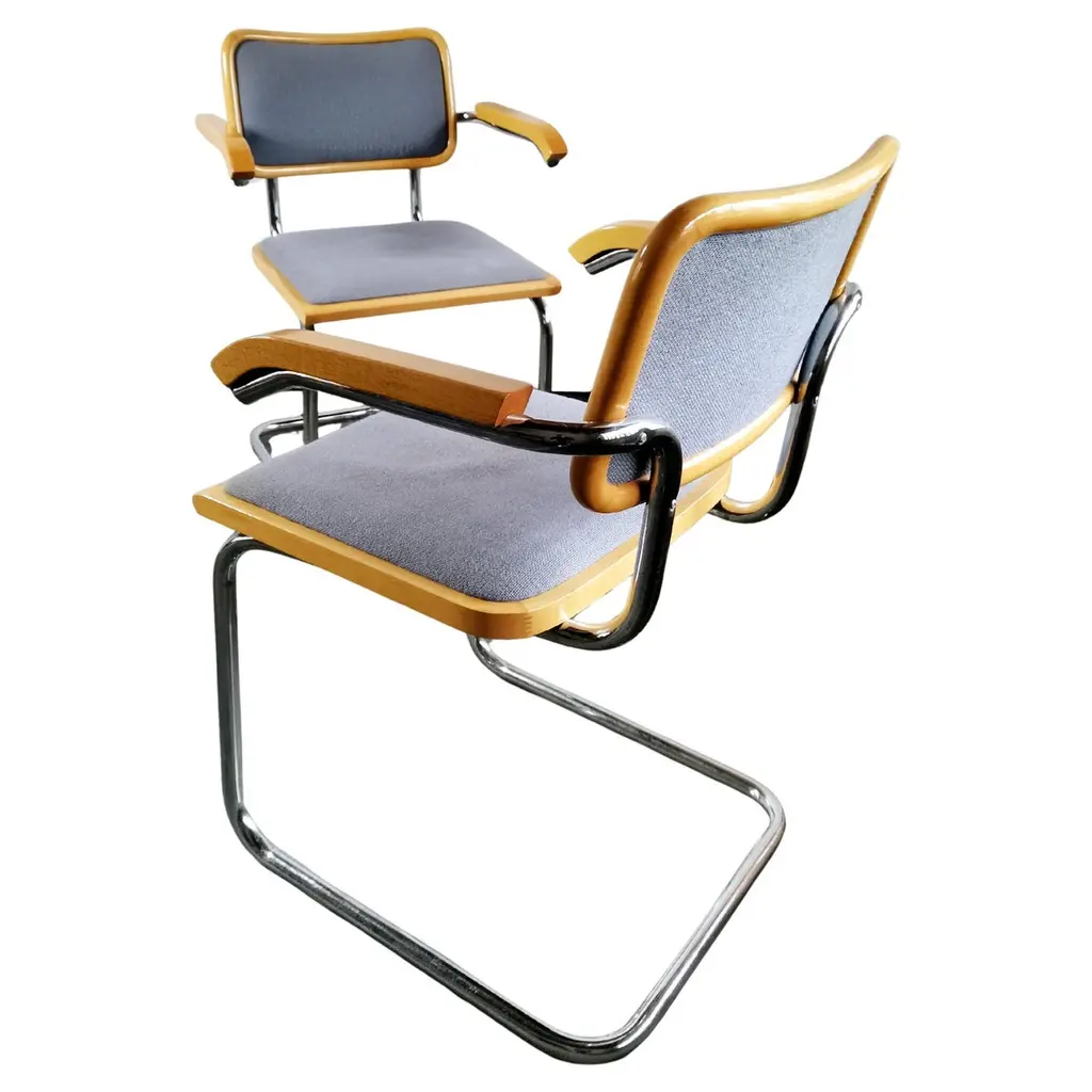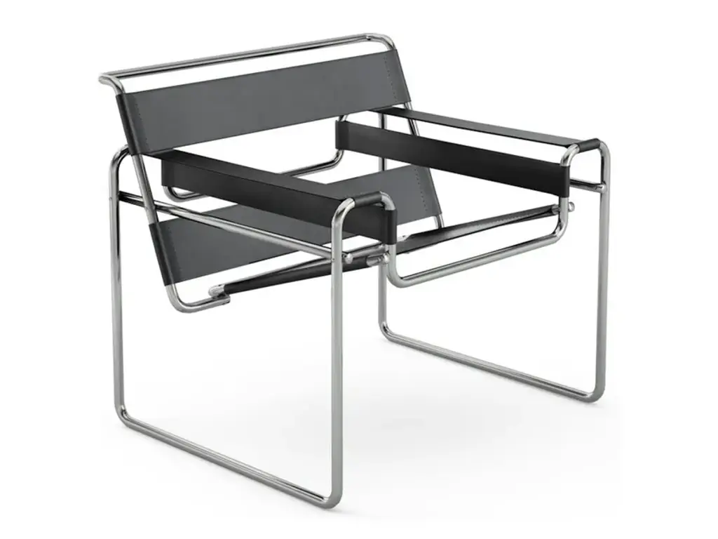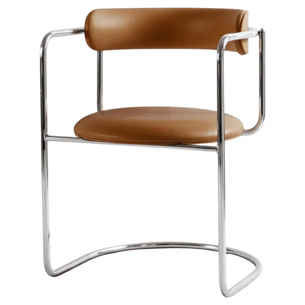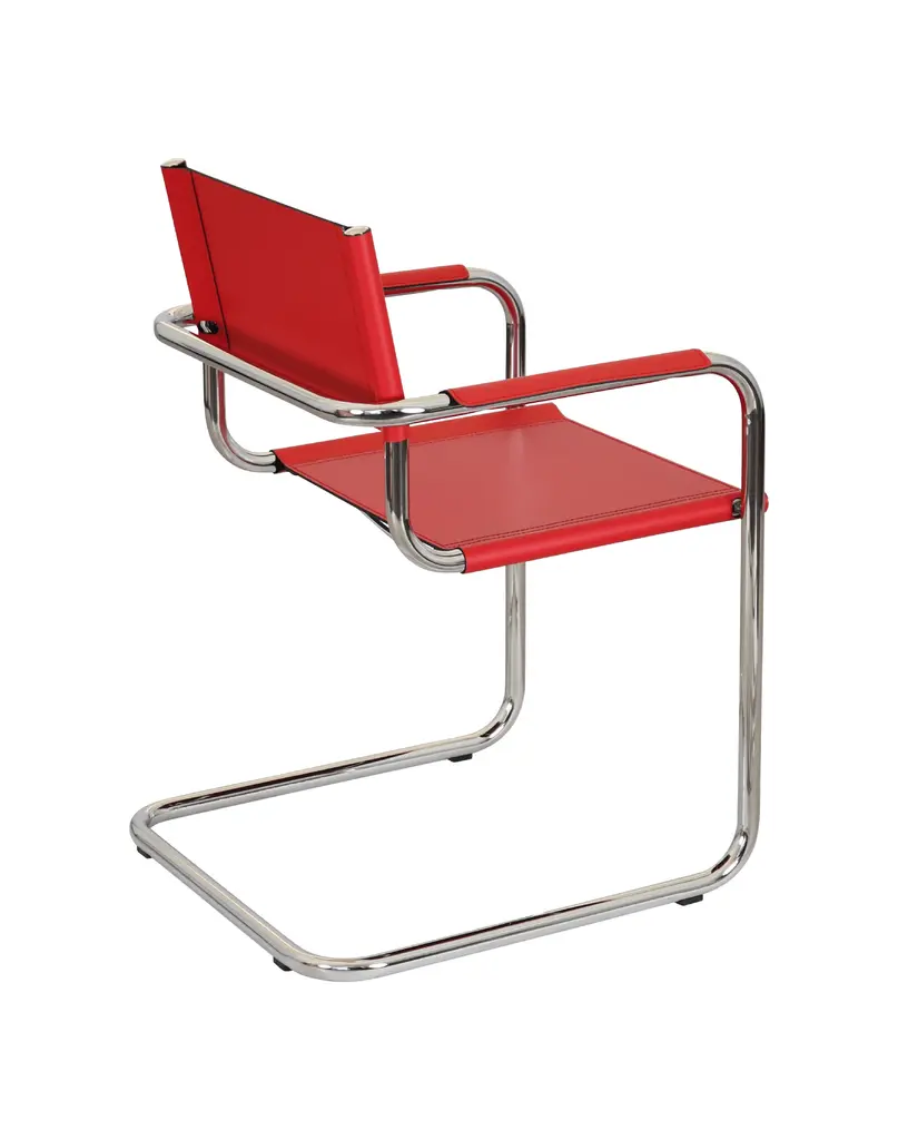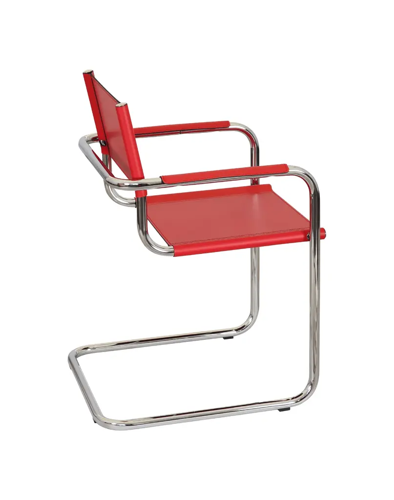 Experience the epitome of classic Bauhaus design with our Mart Stam Bonded (Regenerated) Leather Cantilever Armchairs, imported from Italy.These chairs feature a sleek chrome-plated tubular steel frame and bonded (regenerated) leather seats and backs, available in 8 (eight) stunning colors: Black, Blue, Camel, Creme, Red, Dark Red, Gray, White.Designed for both comfort and style, each armchair includes plastic snap-on glides for easy movement and a one-year limited warranty. With a 250 lbs. weight capacity, these armchairs are perfect for adding a touch of timeless elegance to any space!Material: Bonded LeatherCasual or Formal: CasualChair Features: Arm PadsQuantity: IndividualAccent Chair Type: ArmchairChair Back Type: OpenStyle: Bauhaus; Mid-Century ModernRecommended Use: Indoor; Residential; Kitchen; Dining RoomCommercial Use: NoFrame Material: Tubular SteelFrame Finish: ChromeSeat Material: Bonded (Regenerated) LeatherBack Material: Bonded (Regenerated) LeatherLeather Color: RedOverall Dimensions (W x D x H): 22.5" x 23" x 31"Seat Width: 18.7"Seat Depth: 14.7"Seat Height: 17"Back Height: 14.5"Arms: YesBackrest Leather Strip Height: 8.5"Arm Height (from seat): 7.5"Weight Capacity: 250 lbs.Outer Arm Width (between outer edges): 22.5"Inner Arm Width (between inner edges): 18.1"Item Weight: 15.6 lbs.Country of Origin: ItalyHardware Included: 4 (four) Phillips screws (to attach the arms)Additional Tools Required: Phillips Screwdriver (NOT included)Estimated Assembly Time: 2 (two) minutesAssembly Advisory: 2 (two) Person Assembly AdvisedCare Instructions: Keep away from direct sunlight. Wipe with a damp cloth and mild soap, avoiding harsh chemicals.Warranty Details: 1 (one) year Limited Warranty: covers any defects in materials or workmanship under normal use. However, please note that damage to the leather parts caused by exceeding the weight capacity of 250 lbs. is not covered under the warranty.
