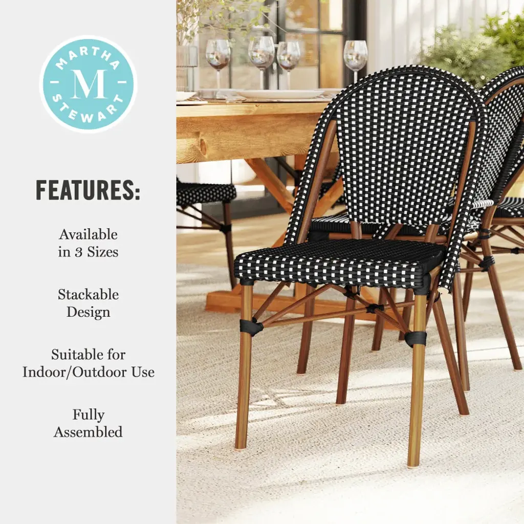 Upgrade your home's retreat with the refreshing style of the Martha Stewart Lily Pond Bistro Dining Chair. The durable, rustproof aluminum frame boasts an elegant, hand-brushed, woodgrain finish complemented by a seat and back with a woven rattan pattern. The all-weather construction grants durability and peace of mind, while an efficient design with a recommended stack quantity up to five chairs high delivers space-saving convenience. Part of our Lily Pond collection, this piece pairs wonderfully with the coordinating counter stools, barstools, and dining table, crafting a custom collection that fits your entertaining needs. Arriving with no assembly required and only minimal, hassle-free maintenance, this eye-catching bistro dining chair is a seamless addition to any indoor-outdoor space for everyday use and special occasions.Patio bistro dining chair that will add charm to your home's outdoor retreatAll-weather construction with an armless frame boasting a hand-brushed woodgrain finishThoughtfully complemented by a seat and back with a chic woven rattan patternRecommended stack quantity up to five chairs high for hassle-free storagePair with other pieces in this patio collection for a custom arrangement to fit your hosting needsMaximum static weight capacity: 400 lbs.Arrives conveniently preassembledUpkeep is easy by wiping clean with a damp cloth