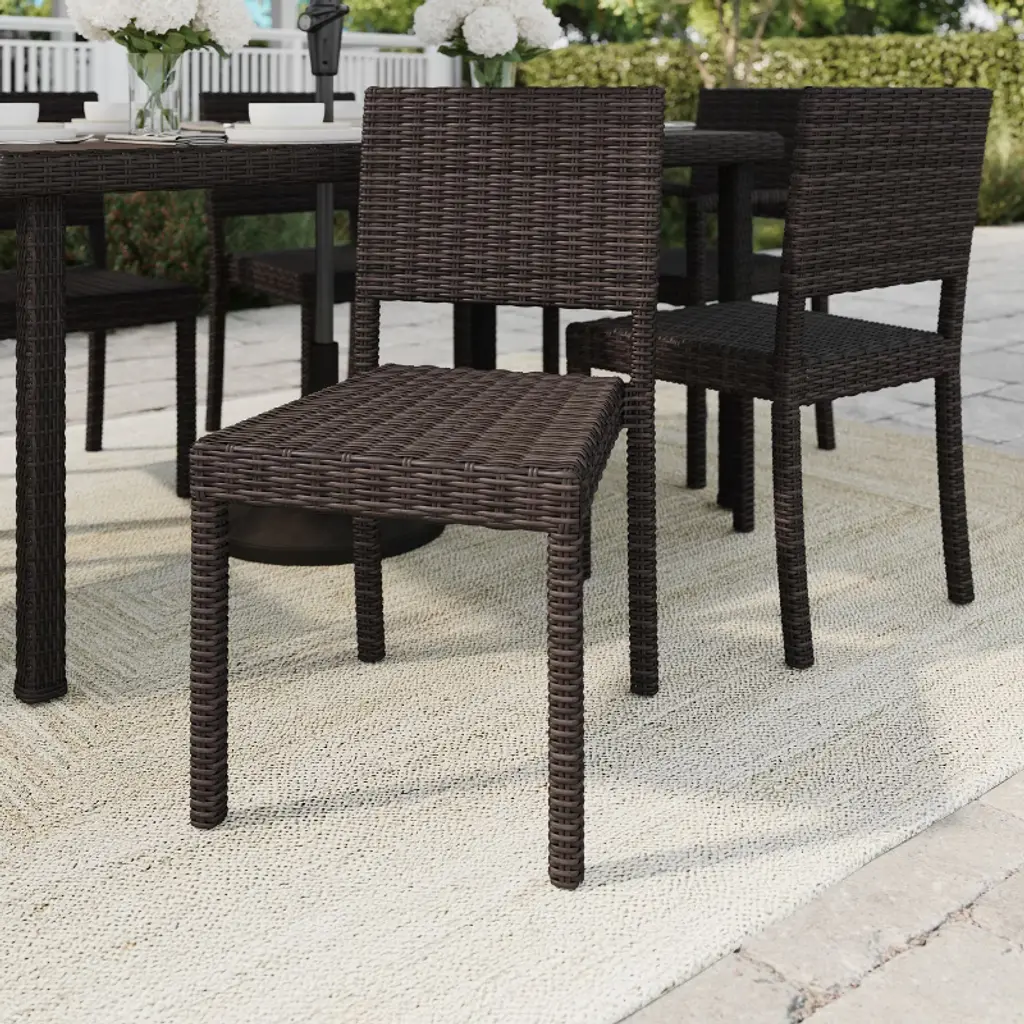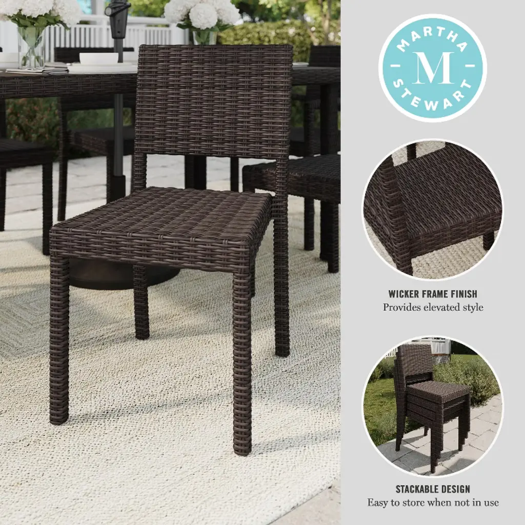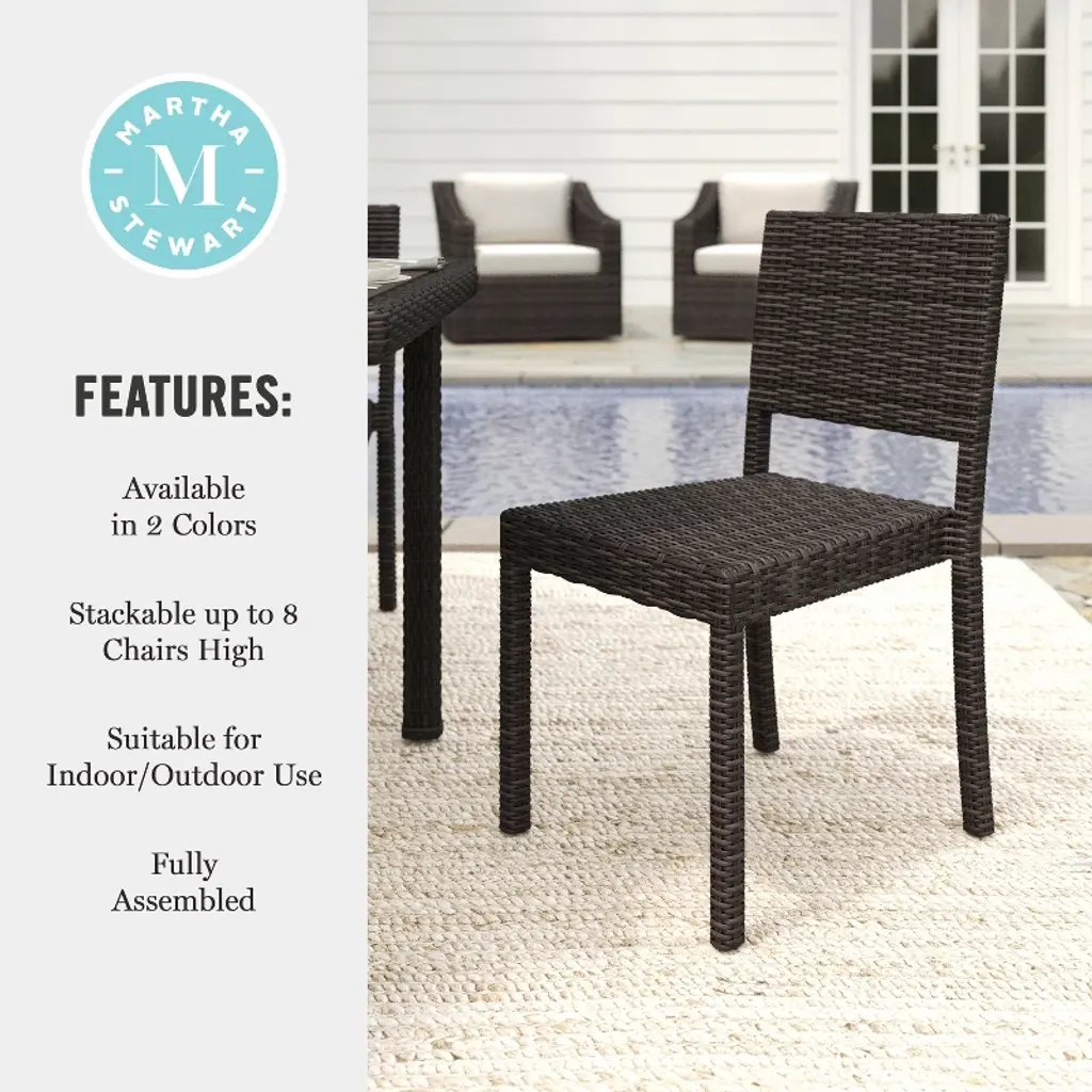 Refresh your patio space with the chic style and cozy comfort of this set of two Martha Stewart Bedford Stacking Patio Dining Chairs. Sturdily built, these versatile patio chairs are ideal for reading al fresco, enjoying cocktails with friends, or simply relaxing. With an efficient design boasting a recommended stack quantity up to eight chairs high, you can effortlessly store multiple chairs and save space when not in use. These wicker chairs will cradle you in comfort while you make the most of those gorgeous, sunny days or starlit evenings. Adjustable floor glides on the front legs allow for level seating. Part of our Bedford collection, these chairs pair wonderfully with the coordinating pieces allowing you to craft a custom collection that fits your indoor-outdoor dining needs. For your convenience, your chairs arrive with no assembly required, while upkeep is quick and easy.